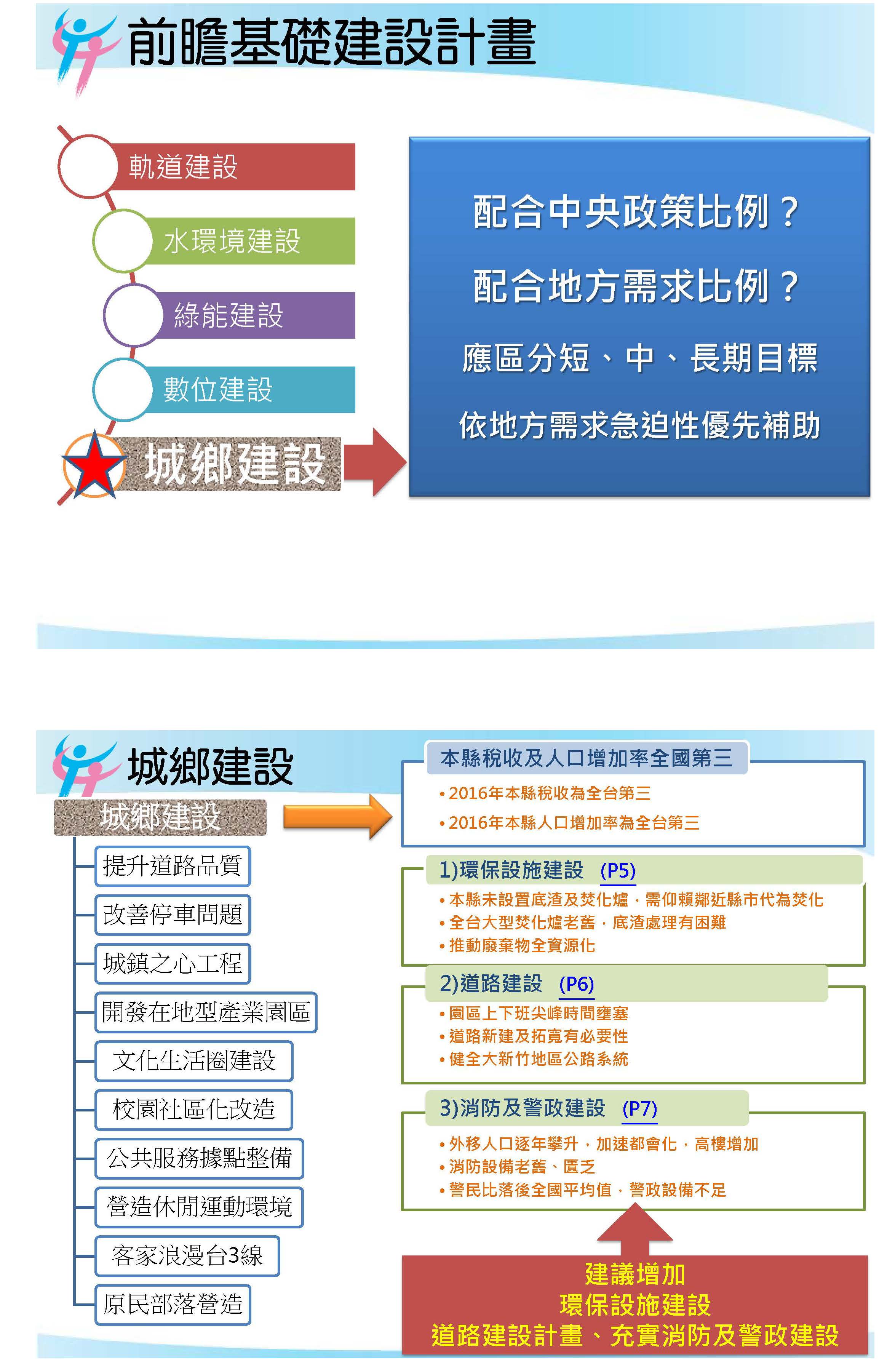 我非常羨慕六都的官員,他們有人講他們要營造一個舒適、友善、綠美化的城市,這不是一個夢想,因為他認為他可以做到,可是對我們苗栗縣來講,我們只要一條路。事實上,六都、大的縣市做得這麼好,只會造成其他縣市的人口快速的外移,因為人民會想那些地方生活環境比較好,既然一樣繳稅,他當然要選擇那些地方居住,結果就造成偏鄉人口外移,進而使得六都、大縣市房價節節高升。苗栗以農立縣,最近兩年有很多年輕人返鄉或移居苗栗創業或務農,可是我們的交通網、道路品質、生活圈、產業圈都很匱乏,他們空有這麼多想法、成果,如何推出去?我們要的並不多,我們要的只是基礎建設而已,只希望能夠為苗栗引進經濟活水,所以在這次城鄉建設經費,苗栗縣總共提出181項,這181項不是隨便提的,是基於我們的需求,其中提升道路品質就占了92項,另外還有公共服務整備的部分、城鎮之心工程、休閒環境,這些都是基本的居住需求,我們真的不敢奢求舒適、友善,我們只要基本的道路建設而已。