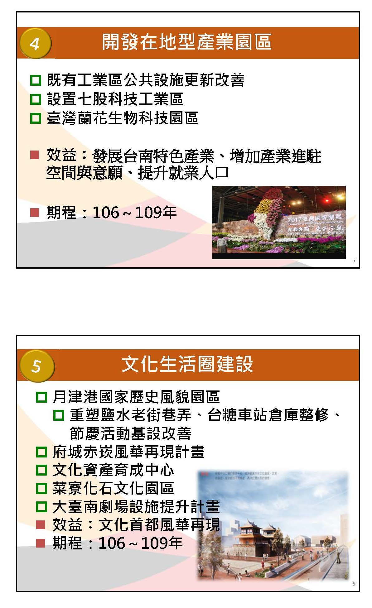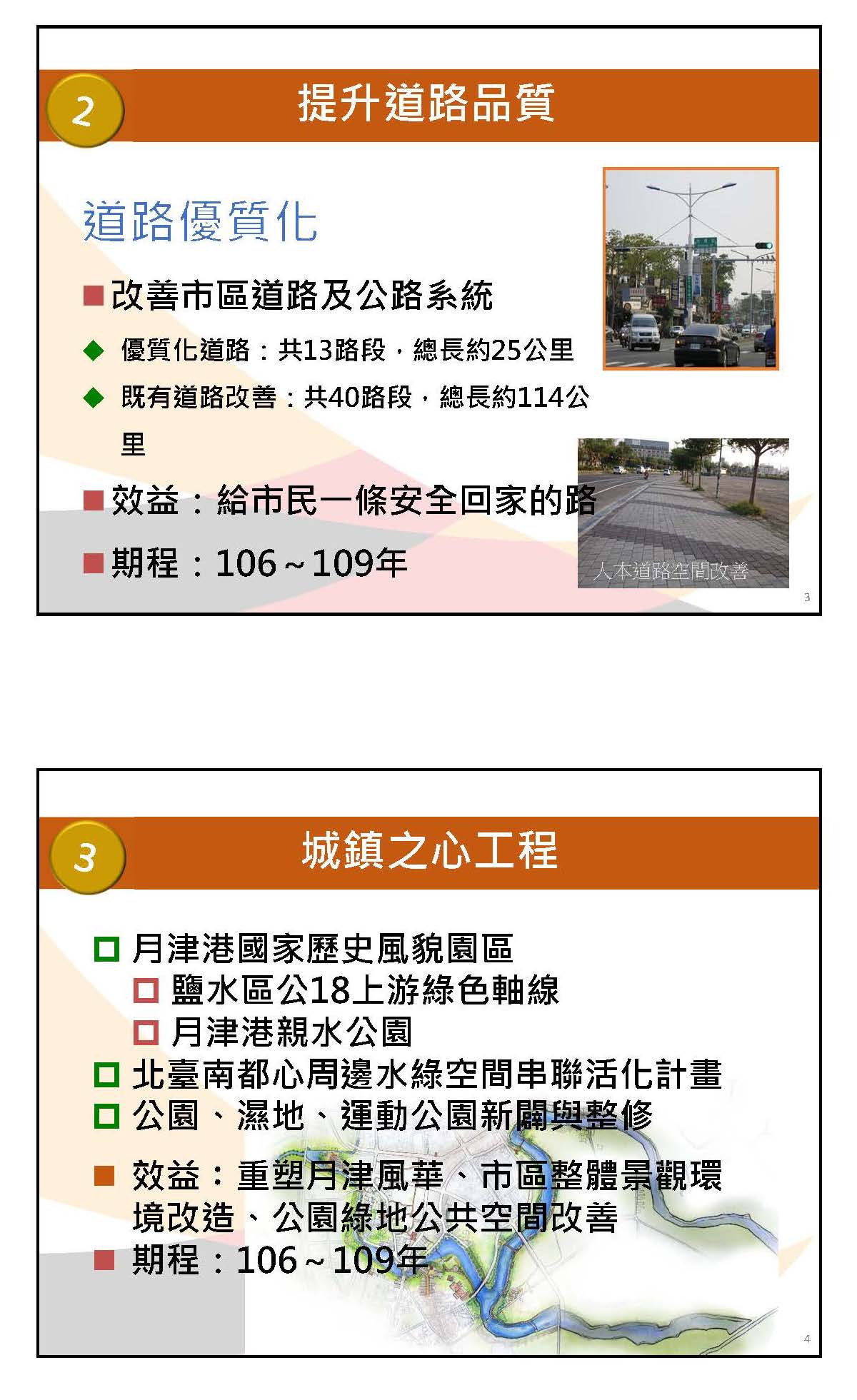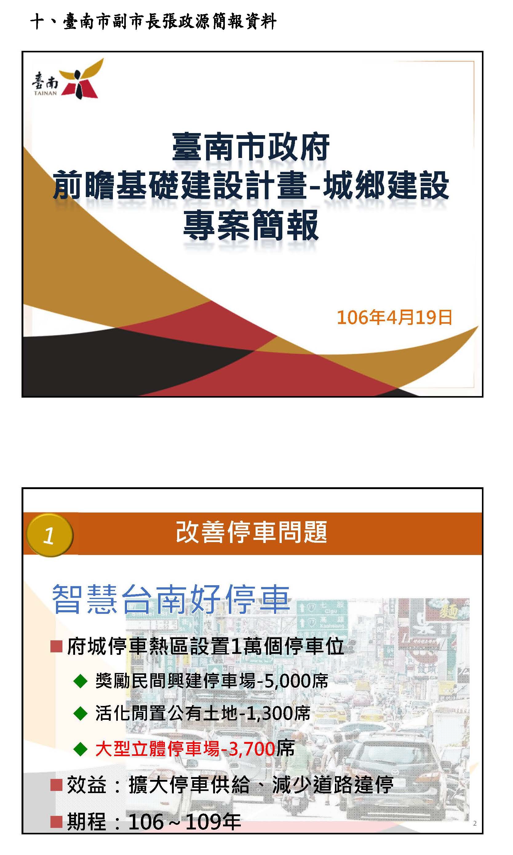 在10個城鄉建設項目中,台南市政府提出9項,第一個就是停車場,台南市過去是一個古都,街道很狹窄,過去的都市計畫沒有辦法劃設足夠的停車位,所以現在到台南最大的問題就是停車位嚴重不足,我們並不是要讓大台南2,191公里、37區一起做,而是聚焦在停車熱區,我們有3個停車熱區,除了過去的台南府城這個中心區,還有東區、北區,我們希望這3個區未來4年能增加1萬個停車位,其中市政府自己要做6,300個,包括獎勵民間興建,我們希望跟民間合作,活化閒置的公有土地,包括國有的、市有的、其他各機關的,我們會和他們一起合作,真正要中央支持我們的,是大型立體停車場,停車場部分,其實我們有評估過,也算過它的自償性,所以未來不會成為蚊子館,這些停車場都在我們的停車熱區,在台南的首善之區,非常有這個需要。我們的土地來源,剛剛也有委員特別談到來源是問題,但是我們這個計畫不會有問題,因為都是利用學校的操場、市區裡的大型公園,在地下興建。另外,包括道路優質化,我們也提出了一個計畫,希望提供市民一條安全回家的路。關於城鎮之心的部分,我們提出一個專案,就是月津港,一府二鹿三艋舺四月津,月津就是現在的鹽水,鹽水蜂砲大家都知道,其實幾百年前它也是一個繁榮的城鎮,我們希望能夠透過這個機會再現月津風華。關於在地型的產業,我們提出了工業區公共設施改善、七股科技工業區和台灣蘭花生物科技園區。在文化生活圈方面,因為台南是文化古都,所以這一塊我們絕對不能缺席,除了月津港的國家歷史風貌園區之外,府城的赤崁樓附近的「赤崁風華再現」、文化資產育成、菜寮化石文化園區和劇場設施提升,我們都會提出計畫需求。在校園社區化的部分,各個項目我們都會和中央合作推出。在公共服務據點的部分,主要還是focus在長照衛福的據點,包括一些老舊建物的補強。在營造休閒的部分,我們會爭取興建亞太國際棒球營運中心。在原住民部落的部分,台南雖然沒有原住民部落,但是現在西拉雅已經正名了,西拉雅是台南市最大的原住民部落,我們會根據他們的需求提出計畫。