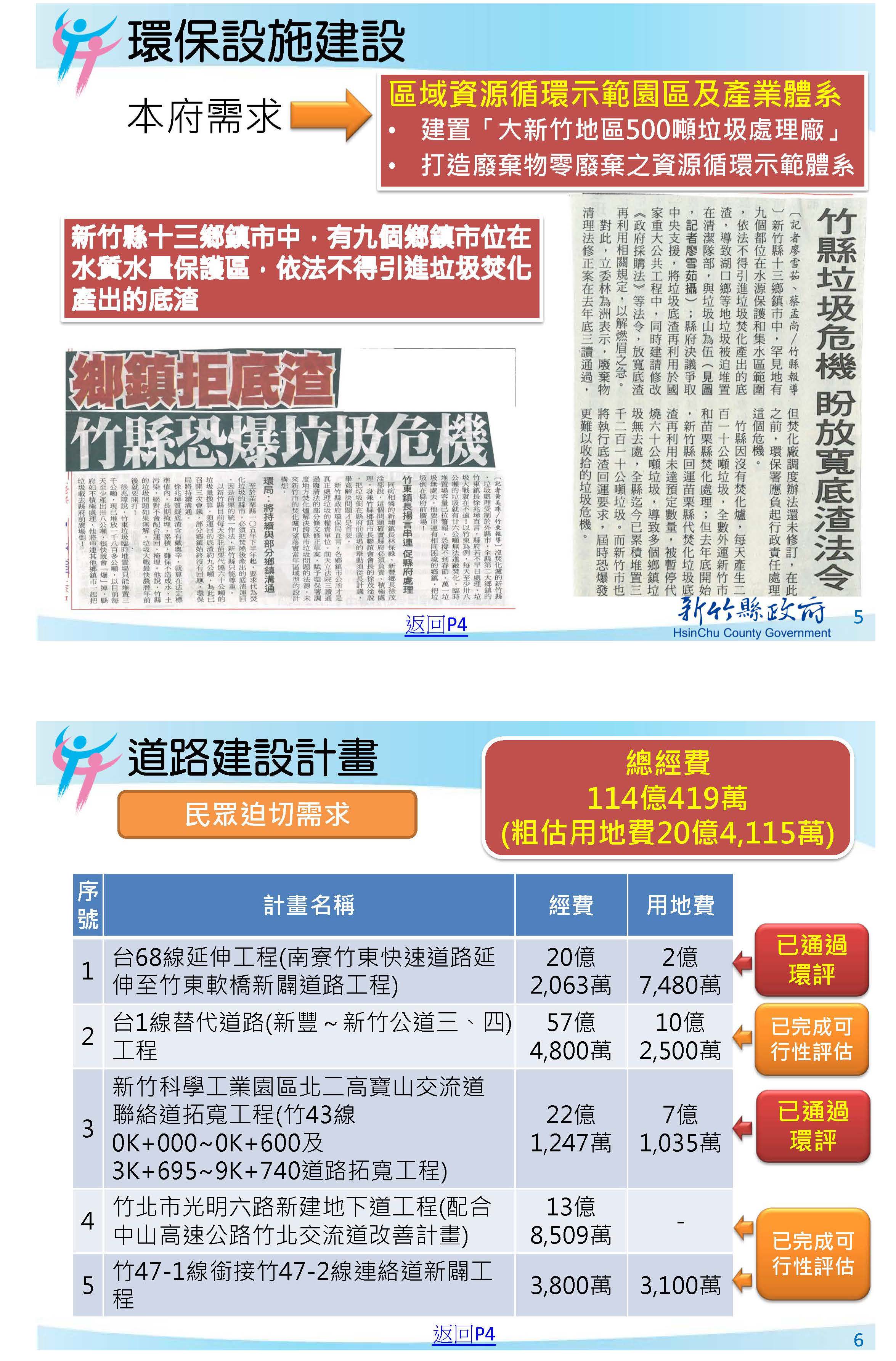 像是林院長有來過的新竹台68線延伸工程,已通過環評,整個預算是20億元,用地費則是二億多元,只有一成不到的費用。另外,台1線替代道路(新豐~新竹公道三、四)的工程也非常重要,經費是57億元,用地費則是10億元,也已經完成環評。還有科學園區周圍的北二高寶山交流道、竹北市光明六路新建地下道以及竹47-1線等等工程,都已經通過環評,只要錢來我們馬上可以啟動,如果捨棄這個工作又一個新的來,新竹縣政府又要市價徵收用地,我們本來就已經沒有錢了,好不容易在財政部的督導之下能達成平衡,現在只要把錢給我們,我們就可以啟動,是駕輕就熟的事情。
