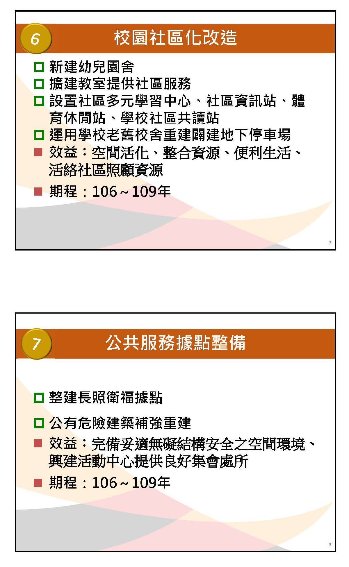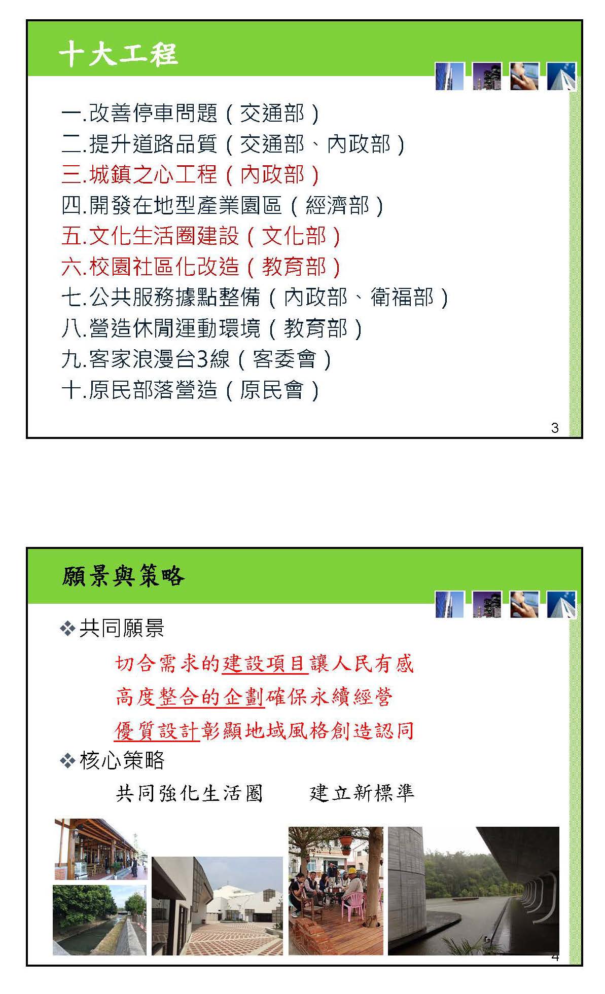 同樣來看教育部,教育部長期下來對於學校非常關心,所以老舊校舍的計畫一直都在執行,還有社區圖書館也在進行。我們經常看到一個現象是學校開始改變了,但是周圍的環境沒有改變。所以當學校內是由教育部負責時,校園外的環境營造、通學步道、社區營造、社區公共空間的改善,就可以透過「城鎮之心」。我覺得相關計畫加以整合,到最後一定會讓各位鄉親,即我們所有民眾都可以真正感受到我們的政府是整體的,不會去區分各部門,所以我們覺得相互間的整合是非常重要的一件事情。