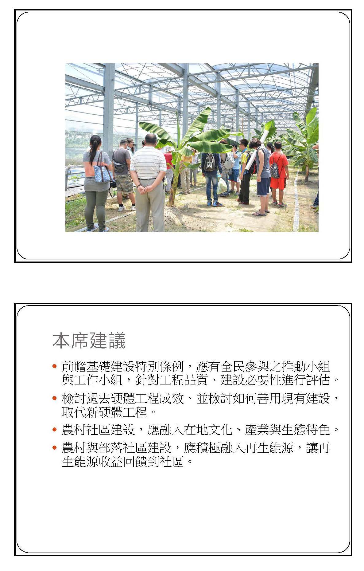 最後我想建議,前瞻基礎建設特別條例應有全民參與之推動小組與工作小組,針對工程品質、建設必要性進行評估,檢討過去硬體工程成效,並檢討如何善用現有建設取代硬體工程。此外,農村社區建設應融入在地文化、產業與生態特色;農村與部落社區建設應積極融入再生能源,讓再生能源收益不是回到廠商,而是回饋到社區,社區才會積極支持再生能源。我要再次提醒,不要把農村忘記了、不要把社區忘記了。