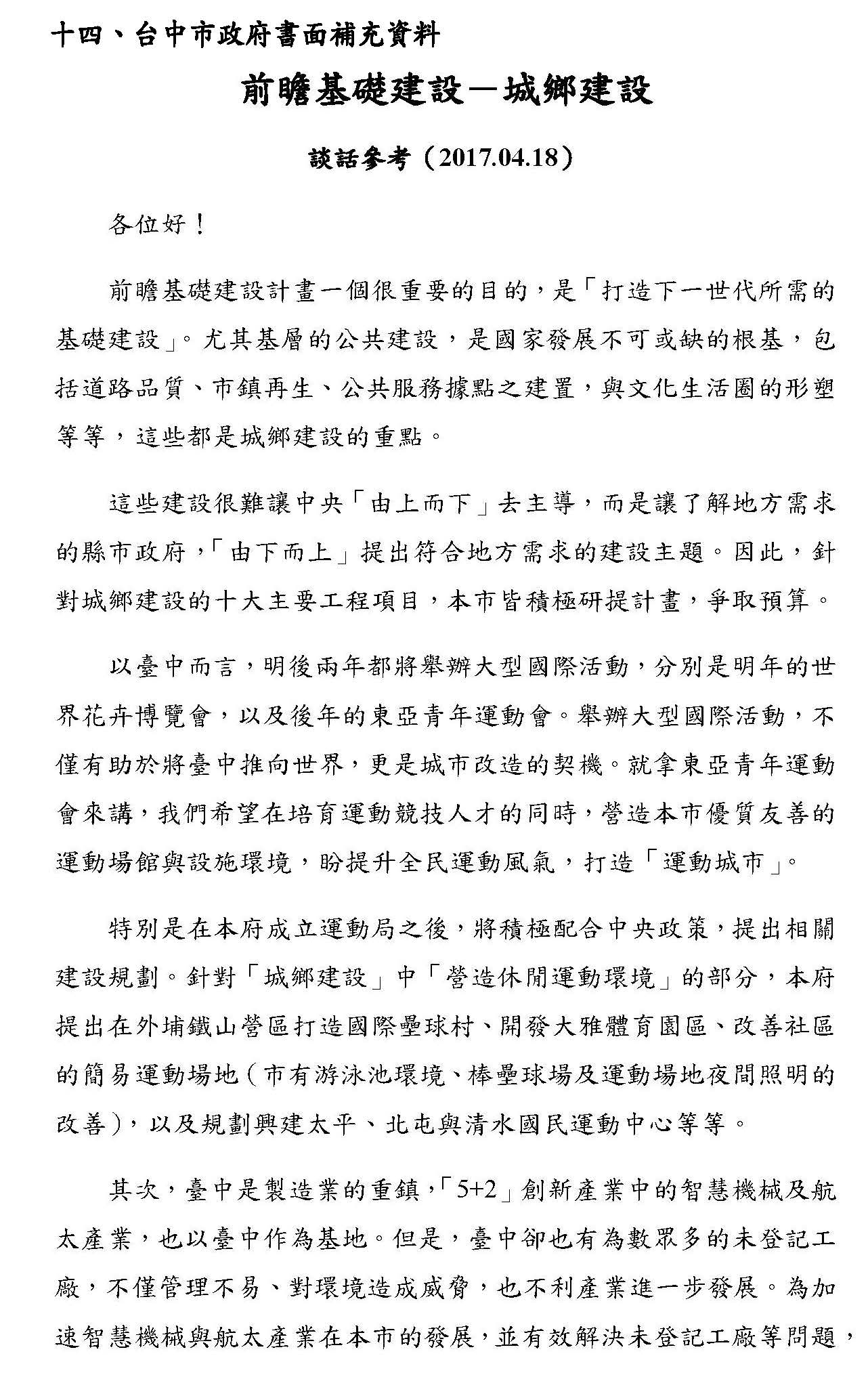 李副市長四川:主席、各位委員。因為我曾經待過行政院,所以我覺得這個場合很相似,也很熟悉,很榮幸今天來參加前瞻基礎建設計畫特別條例的公聽會,對於前幾場的公聽會,外界大概都以政治的角度來看這個特別條例,所以我今天就少一點政治,就多從條例的部分來表達意見。因為我待過行政院,也編過總預算,所以就提供幾點意見給大會作參考。第一,行政院這次編列的基礎建設計畫,尤其是今天探討的城鄉建設所列的十大工程,從改善停車問題、提升道路品質、開發在地型產業園區、文化生活圈建設、校園社區化改造、原民部落營造到教育部所提的營造休閒運動環境等工程,請問所有在座的行政院首長,難道這些計畫不是所有政府每年經常性在做的範圍嗎?在地方政府每年編列的預算中,這十項有哪一項沒有包括在內?所以,我們根本看不到所謂的「前瞻」在哪裡。