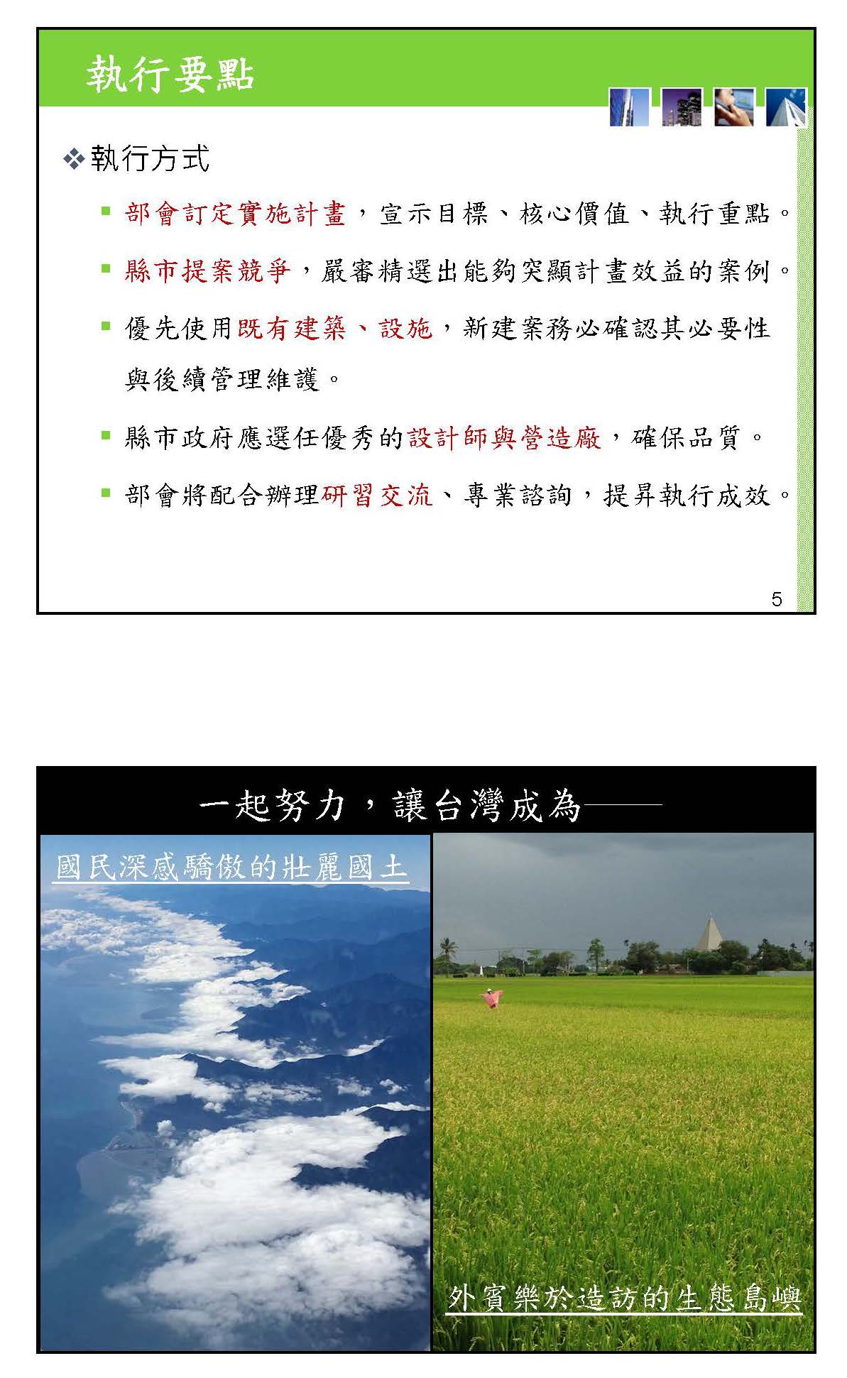 第五項城鄉建設計畫最重要的核心價值,是在說明台灣值得一個更有品質的城鄉環境,大家都知道台灣擁有很好的自然環境,可是老實說,幾十年來的城鄉硬體建設,並沒有讓台灣進入先進國家標準,雖然我們台灣人民很努力,也很友善,但是我們的城鄉硬體沒有辦法達到那樣的水準,甚至面臨老化和少子化衝擊,所以,我們在這個時候推出城鄉建設是有其重要的歷史期待。