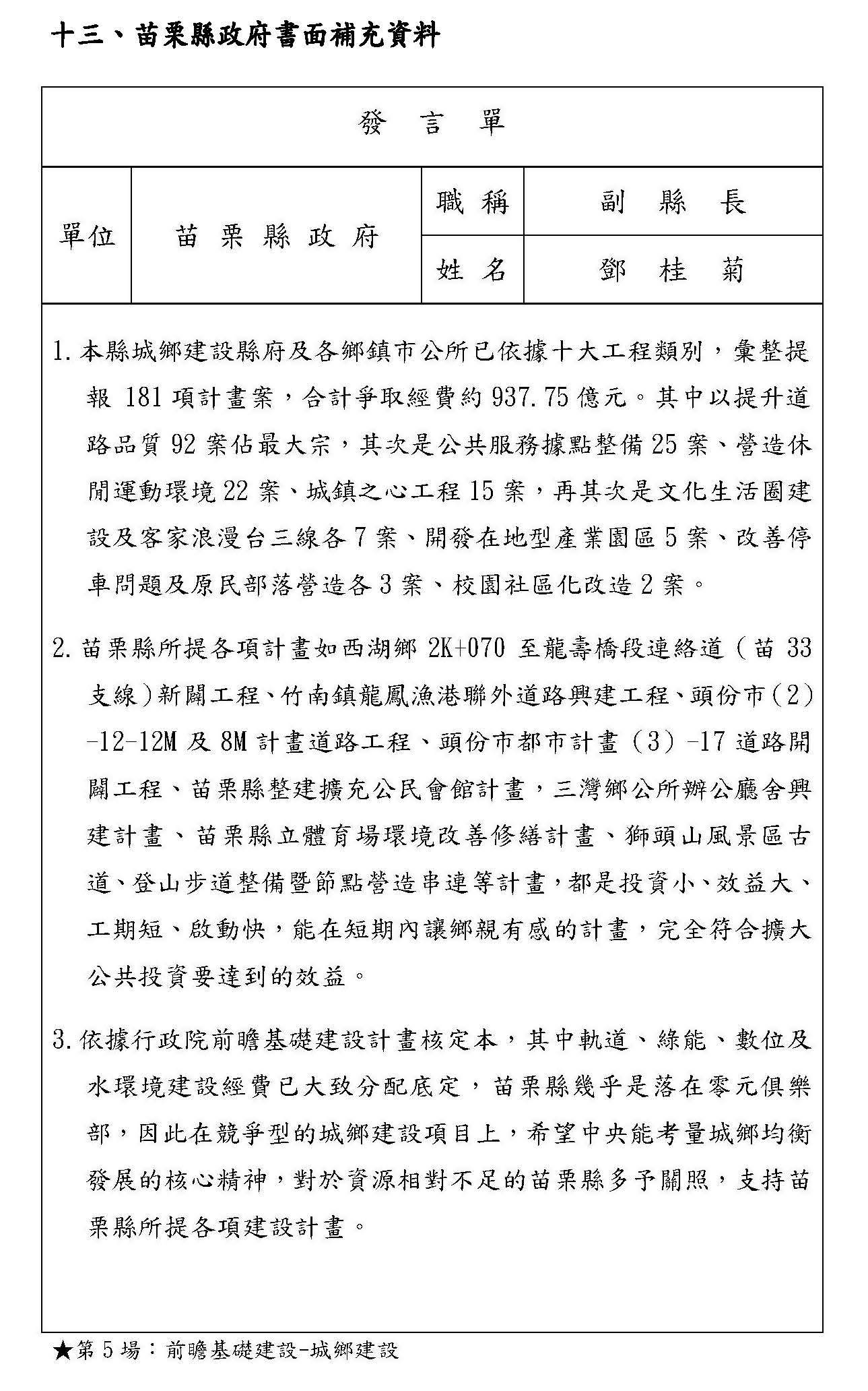 鄧副縣長桂菊:主席、各位委員。禮拜一我坐了6小時,是最後一個發言,今天我進步了一名,是倒數第二個發言。有一句話是這麼說的:「上帝關了一扇門,必開一扇窗。」我想苗栗最能夠體會這句話。苗栗負債一度讓我們苗栗鄉親覺得非常羞愧,可是當苗栗鄉親瞭解我們負債是因為中央財政收支劃分法造成的,我們重拾自信心。然而空有自信心沒有用,必須要有中央的建設經費投入,如果中央的經費沒有投入,那也只是夢一場。苗栗縣長期缺奶,沒有被公平的對待,如果接下去的建設經費也要比照六都提出龐大的自籌款,對我們來講,一樣也只是夢想。我再次呼籲也懇求中央的官員、委員,真正考量苗栗特殊的地理環境。為什麼我剛剛強調財劃法對苗栗的不公平?檢視95年到104年,苗栗創造1,900多億元的稅收,可是這10年當中,苗栗只獲得957億元,換句話說有1,000多億元不知到哪裡去了。透過這次前瞻基礎建設計畫中的城鄉建設經費這部分,希望中央務必要著重在偏鄉,才能真正讓人民有感。