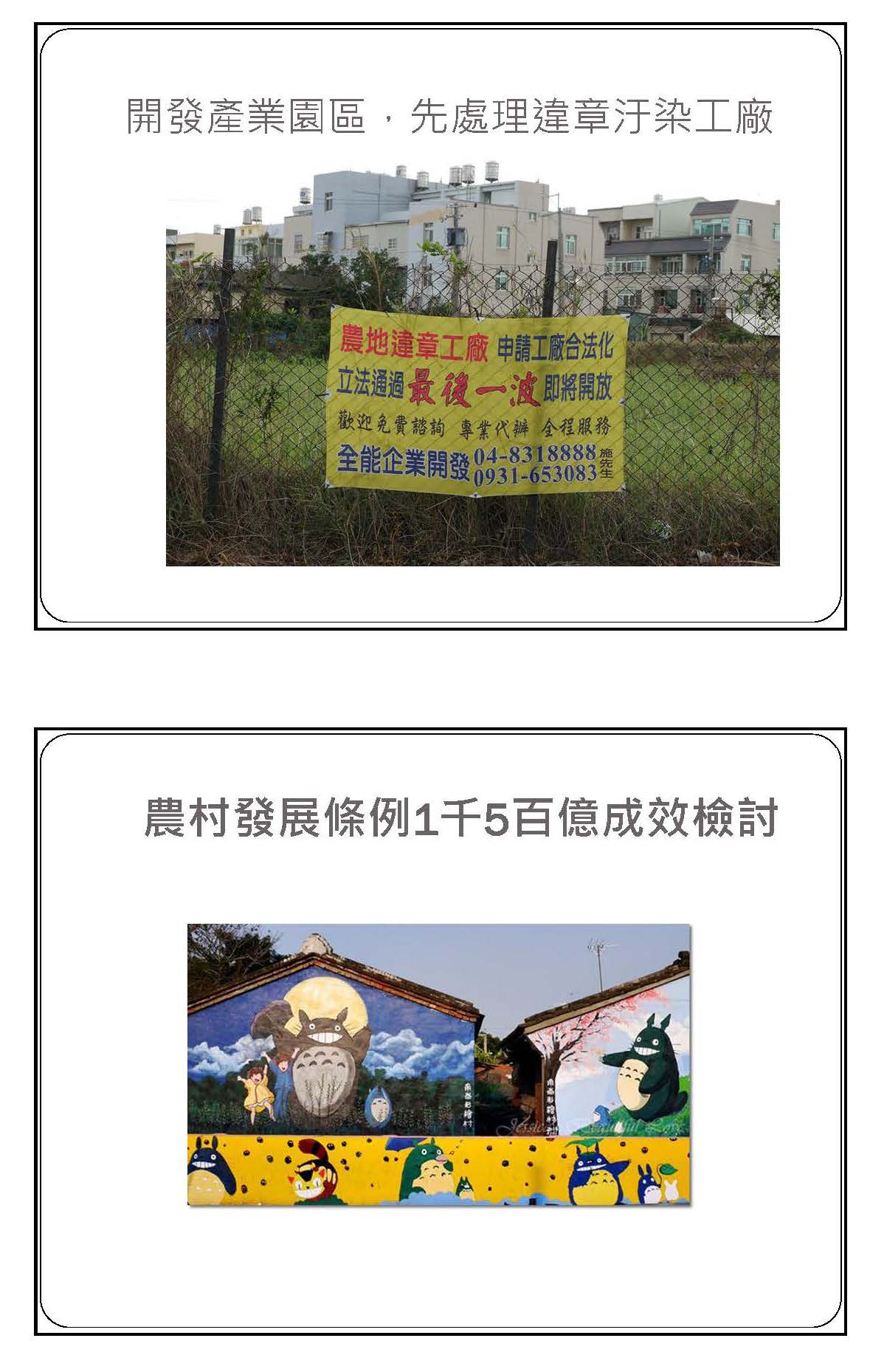 另外,在開發產業園區方面,我們也看到了很多的奇奇怪怪的現象,就違章工廠的部分,有一個最被大家詬病之處就是污染的工廠,在農地就有一些違章工廠存在,現在民間也開始在做一些炒作,就是要趕快把這些工廠變成是合法的,而我們對於污染的層面反而沒有很認真去對待,在這種情況下,我們就看到了大家的擔心,你們讓違章工廠合法化,但污染問題卻是永遠沒有辦法解決的。農村是很重要的地方,農村發展條例過去曾經支付了1,500億元的費用,到目前為止,我相信老百姓是會支持我們需要花錢來做事情,可是如果所做的事情並不能讓大家覺得非常滿意,發現到錢花下去了,但其實並沒有效果的話呢?所以我建議,就農村再生條例應該要先去做一個檢討。我們也到很多鄉村去看,鄉村就會畫一些很奇怪的畫,感覺上好像他們的彩繪對鄉村而言有很大的觀光價值,但事實上大家去一次以後,會覺得沒有連結。如果跟在地沒有連結的話,這樣的東西看過一次之後,或者是我們在網路、雜誌上面都可以看到這些東西的時候,這些東西的吸引力就會大幅降低。要怎麼樣達到一些前瞻性的目的?各位看到這個畫面,這是在日本,日本有一個非常有名的龍貓森林,因為它落實了對於在地的保護,也把在地保護的部分和生態結合,甚至會有故事性的結合,所以很多人到龍貓森林去的時候就會非常感動,因為這是集結居民的力量所建成的。而且不是只有一塊地,上次我去看的時候,他們已經有20幾塊地,我覺得這真的是非常棒。可是我們臺灣有沒有辦法蓋一個石虎森林?石虎在臺灣也是非常有名的,我們對於牠的棲息環境要不要去保護,變成一個森林?