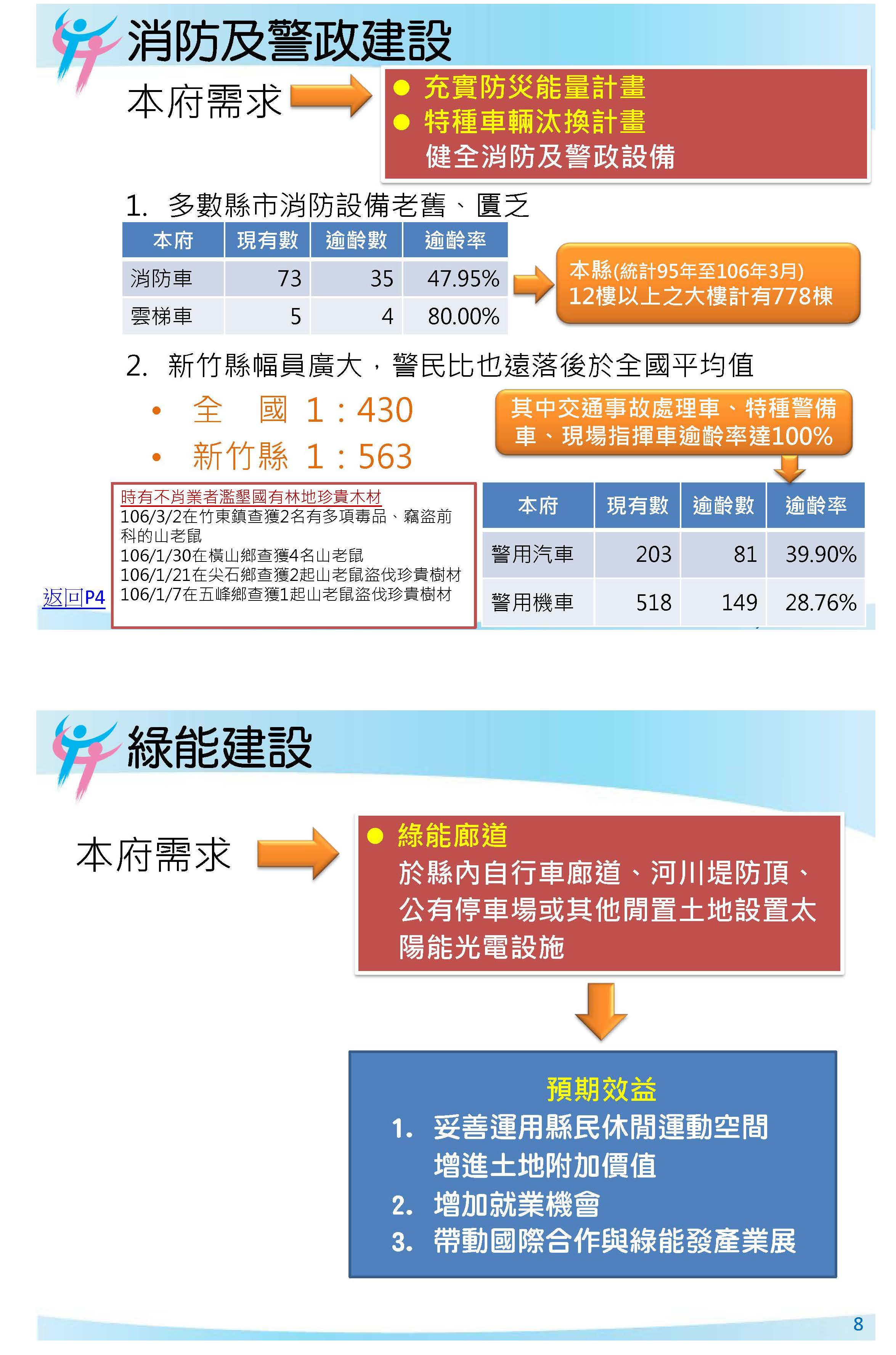 另外,人口一直進來,新竹縣12層樓以上的大樓已經將近有七百多棟,其中重要的問題就是消防與警力,但是到目前為止,警力不足、消防人員不足,再加上機器、消防車都非常老舊,各方面都讓我們發生很多危機。在消防設備方面,我們的消防車有73輛,逾齡的有35輛,逾齡率達到50%;雲梯車有5輛,逾齡的有4輛,逾齡率更是高達80%。在這樣的情形下,再加上我們的大樓又有這麼多,然後生活品味又要提高,尤其生醫園區的科技新貴,國外回來的居多,既然我們到目前為止都是在搶人才,就需要有更好、更優質的生活環境,所以我們提出來的計畫都是要使生活水平能提高,包括我們的交通建設在內,我們提出的幾個交通方面的建設,都是迫切需要的。