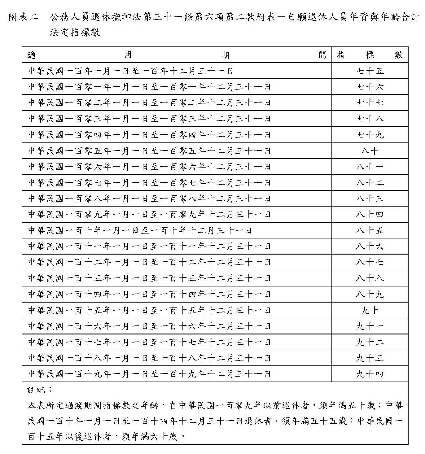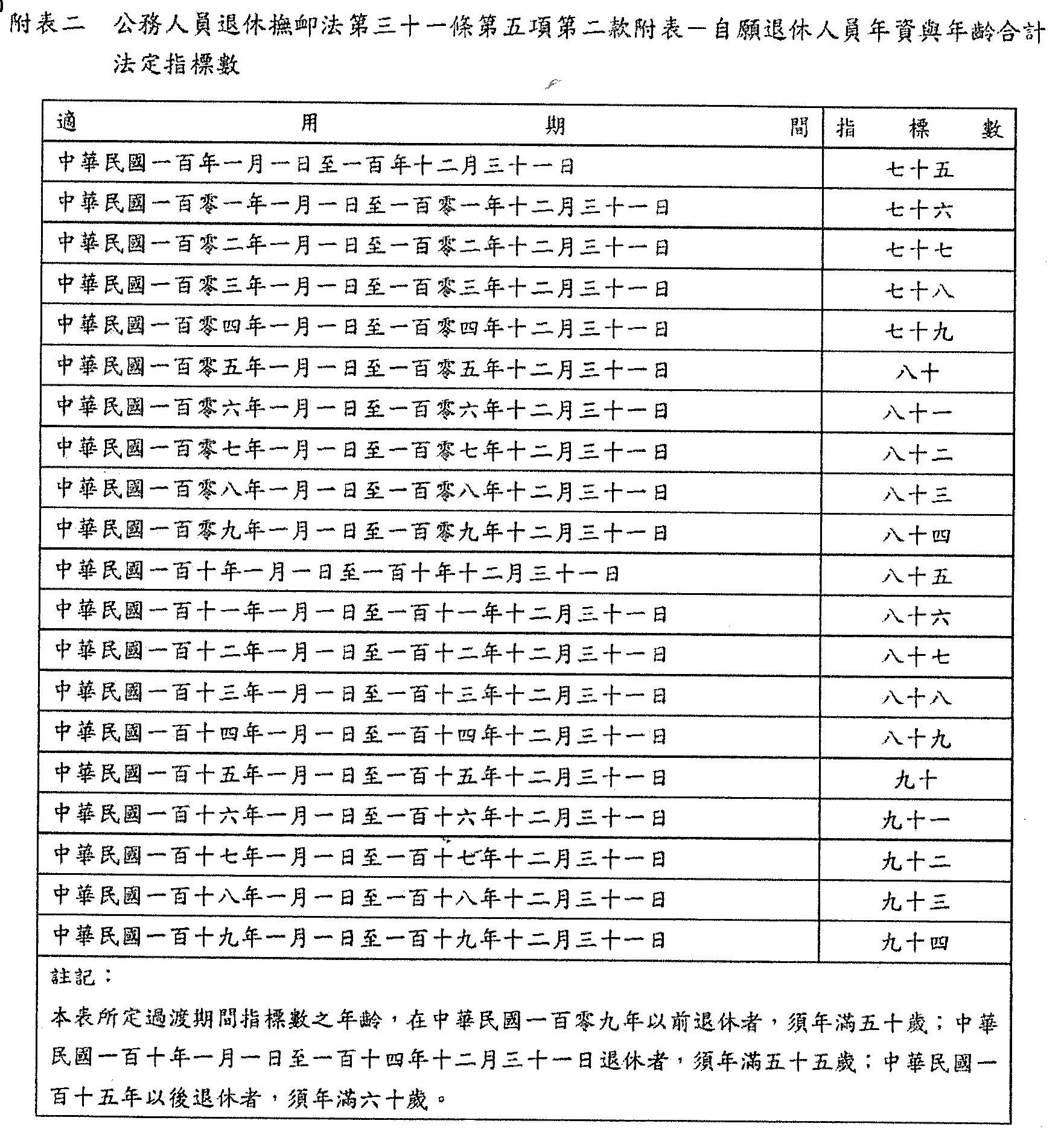 二、退休生效時符合下列年齡規定,且可採計退休年資與實際年齡合計數大於或等於附表二所定年度指標數: