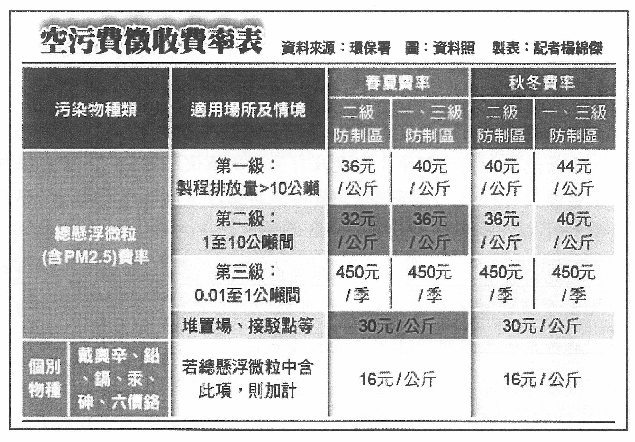 第一級是總懸浮微粒排放量超過10公噸者,春夏時依防制區不同每公斤收36至40元、秋冬則是40至44元;第二級1公噸至10公噸間,春夏收32至36元、秋冬收36至40元;第三級則是0.01公噸至1公噸間,每季收費450元。
