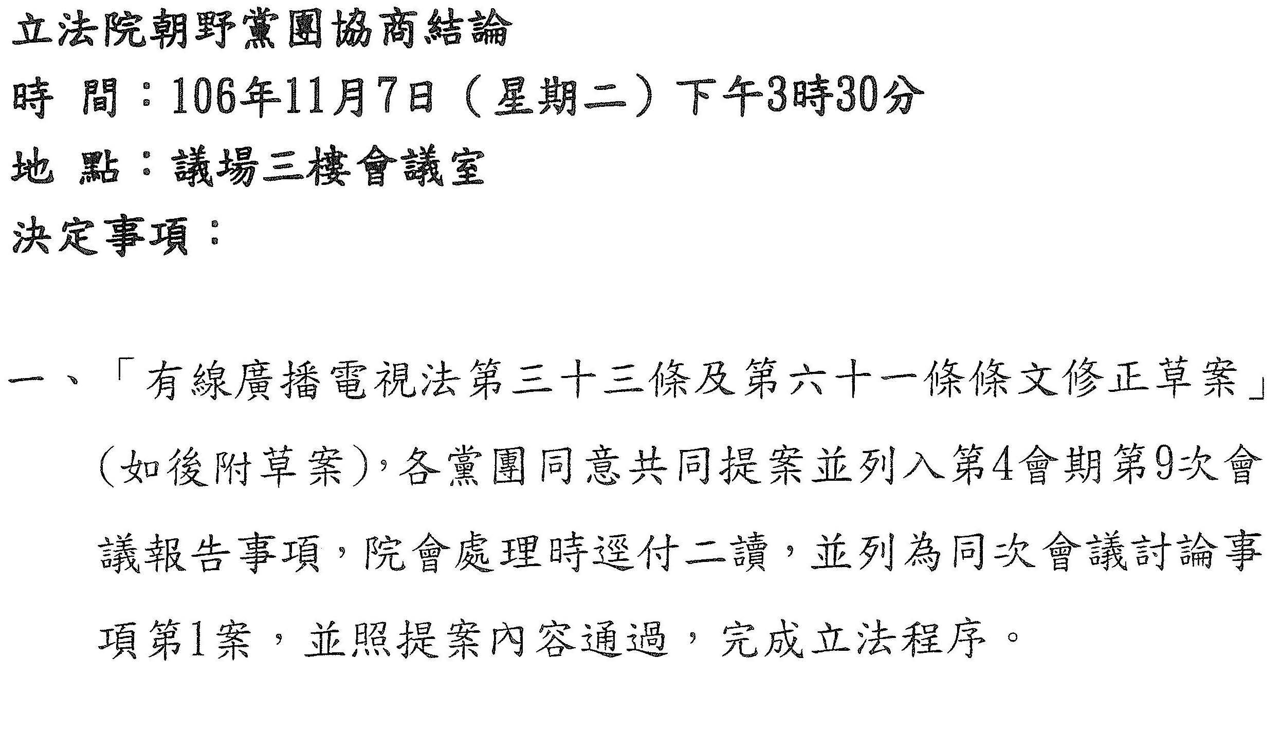 一、「有線廣播電視法第三十三條及第六十一條條文修正草案」(如後附草案),各黨團同意共同提案並列入第4會期第9次會議報告事項,院會處理時逕付二讀,並列為同次會議討論事項第1案,並照提案內容通過,完成立法程序。