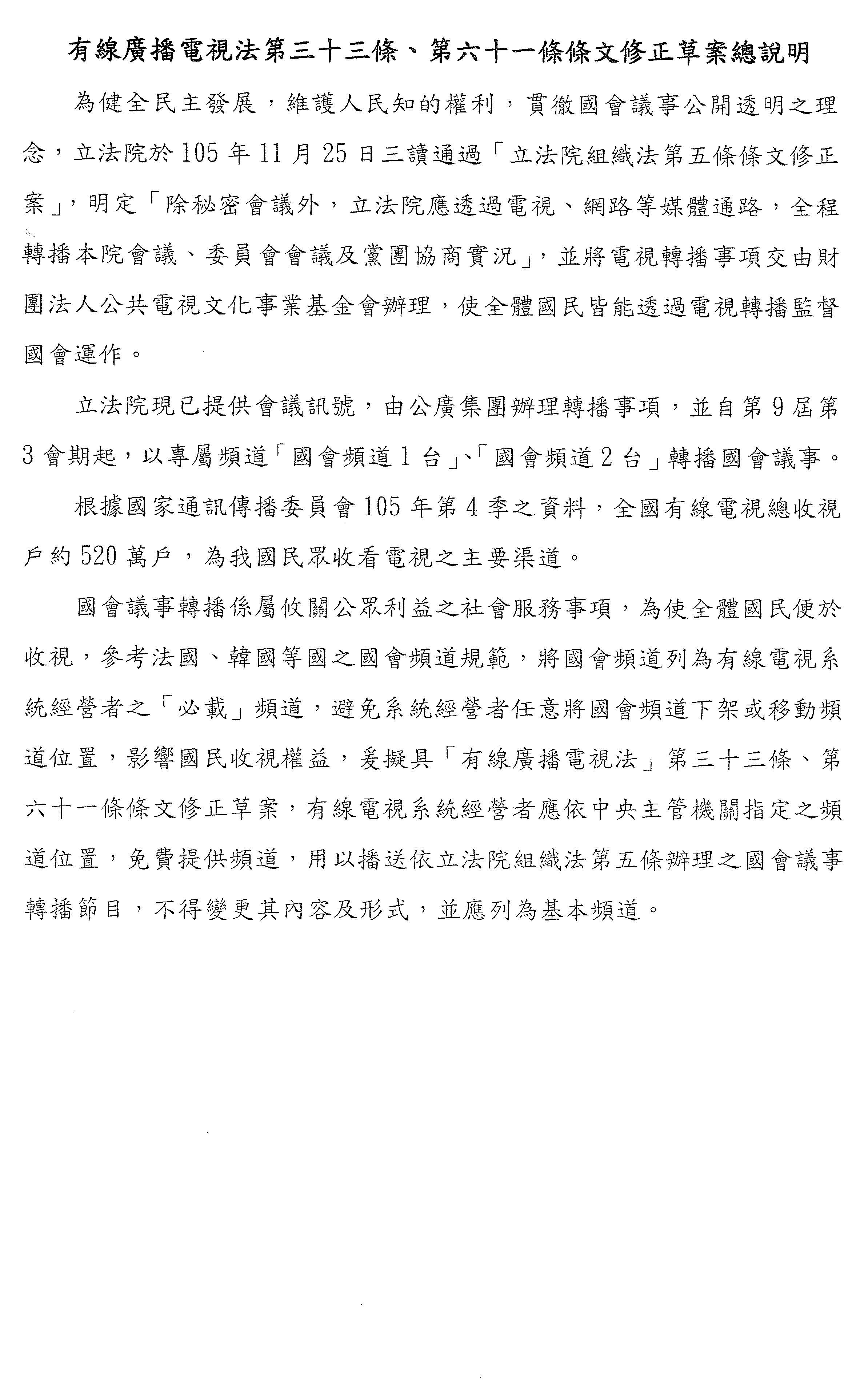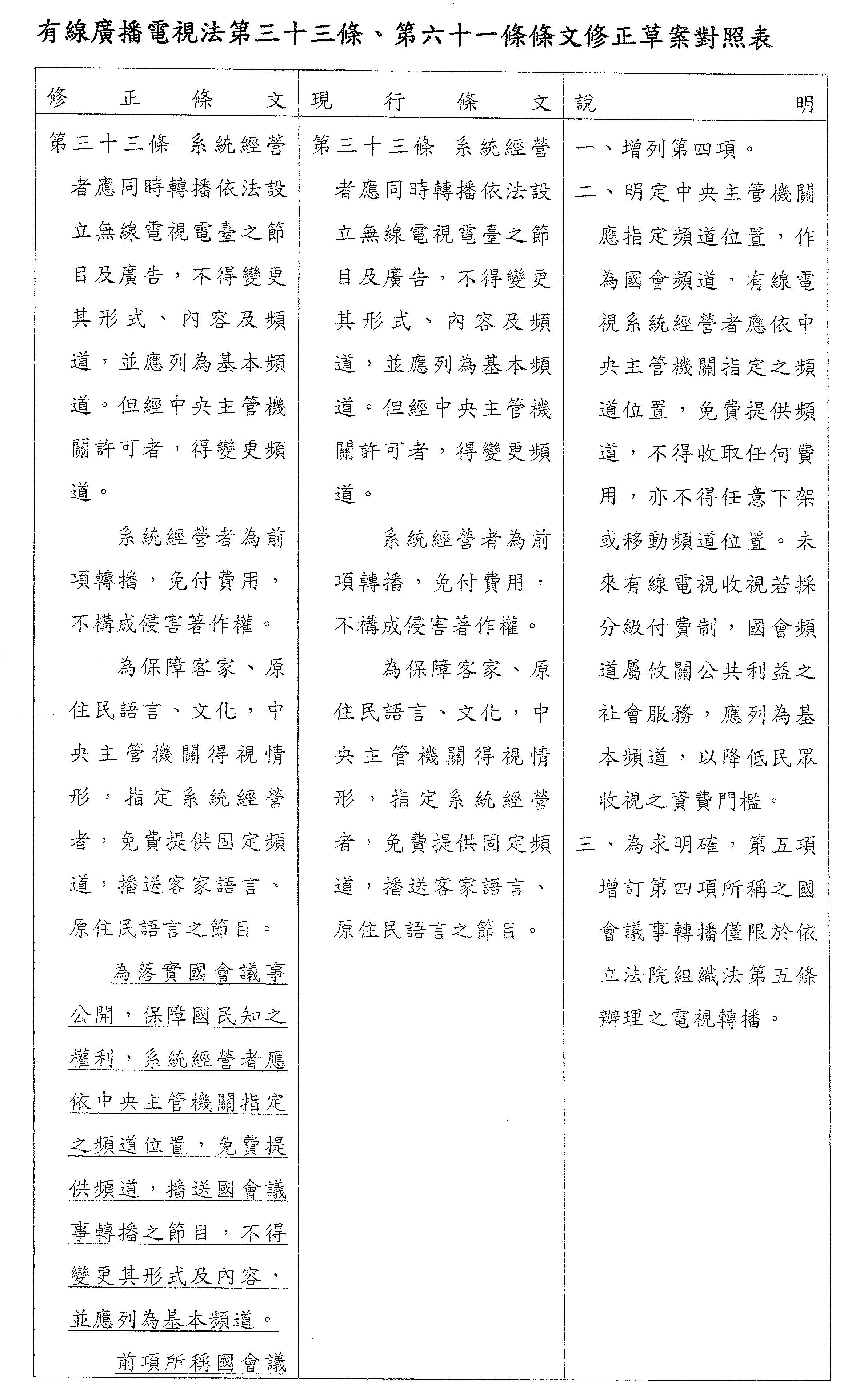 尹處長章中:院長、各位委員。國會頻道從今年第3會期開始就設定在123頻道及124頻道,全國統一就把頻道確定下來。但是這個頻道終究是各個業者善意提供給我們的,我們希望能將此制度化,因此必須修正有線廣播電視法第三十三條。第三十三條修正的重點是增列第四項,規定有線電視業者必須在中央主管機關指定的頻道位置,就是NCC指定的123頻道及124頻道,免費提供頻道,不得收取任何費用,也不可以任意下架、不可以搬動任何位置,將來假如有線電視採分級付費制度時,就列入必載,也不可以向民眾收費,確保民眾收看國會頻道的權益。另外並增列第五項,說明國會頻道的定義是指依照立法院組織法第五條第三項所指的國會頻道。至於第六十一條修正條文則是配合第三十三條第四項的修正,在罰則部分增列「或第四項」四個字。