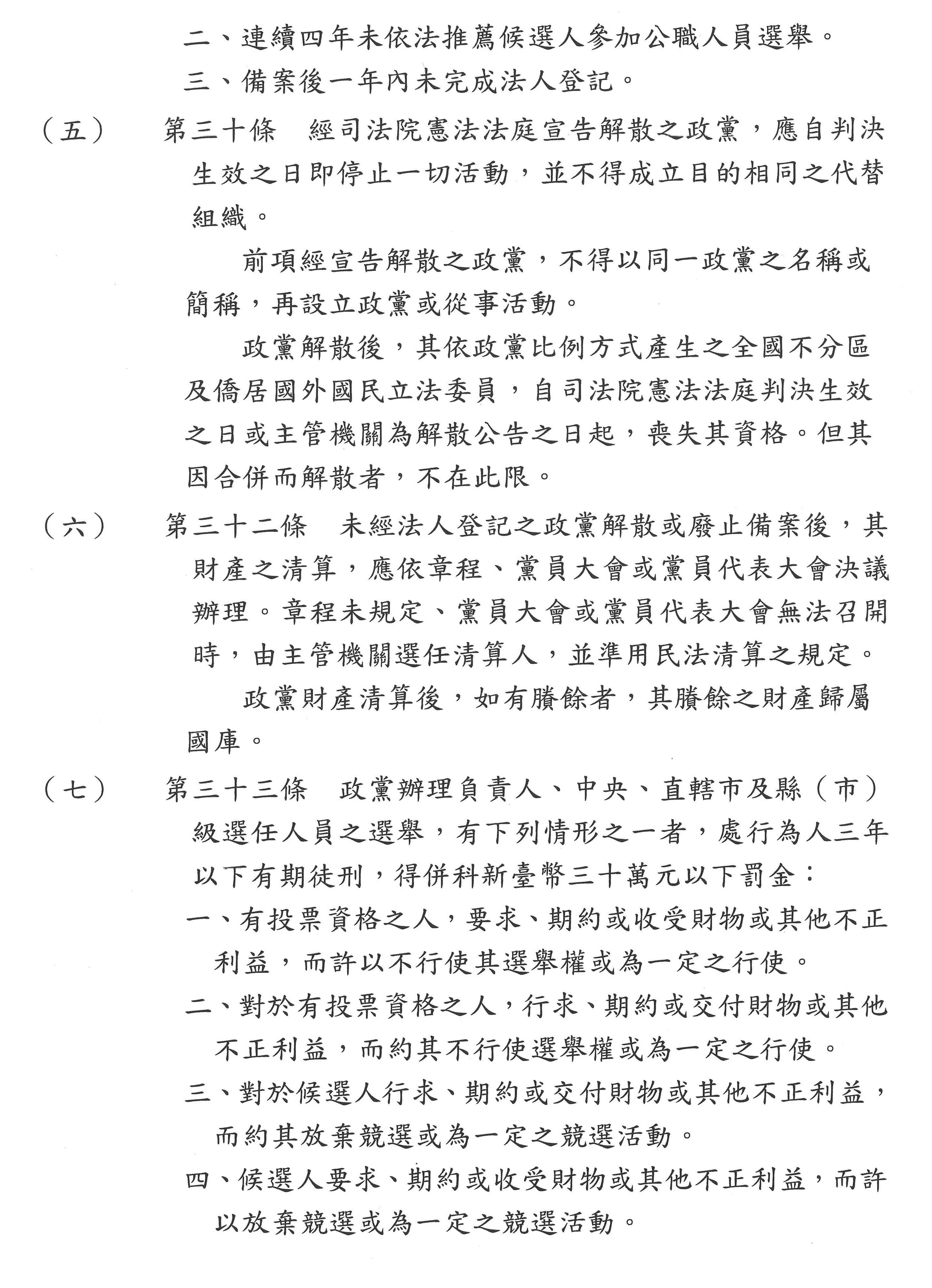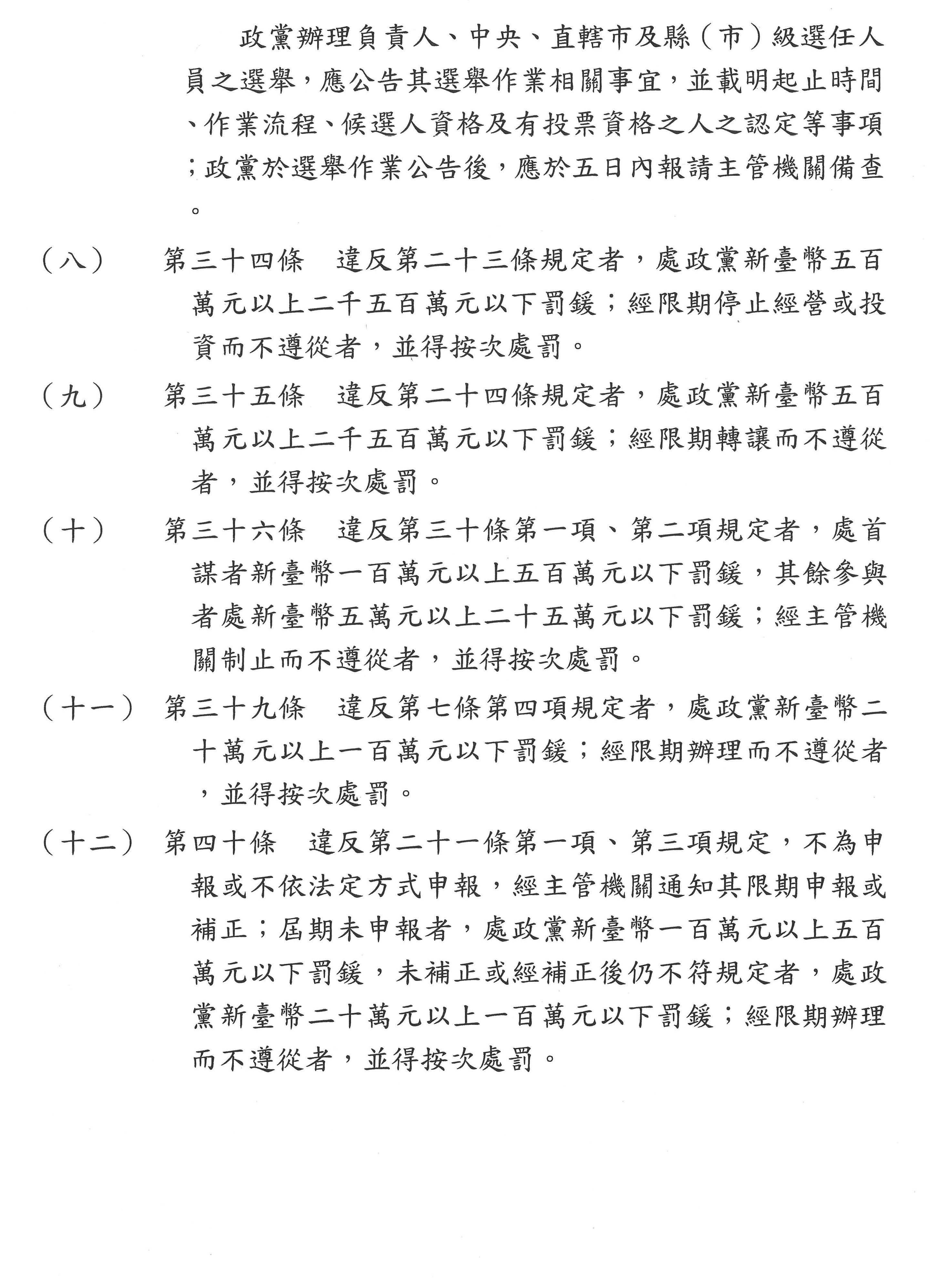 陳局長清雲:我們有針對第三十三條做了整理,關於政黨內部選舉的賄選是否要明定刑責,當然有不同的意見,有一種看法是以法律明定政黨選舉賄選的刑責會有限縮人民參政權之虞,基於尊重各政黨的自主性,政黨內部選舉如果有賄選的問題,應由各政黨透過內部黨紀自行規範之,不宜再刑責化。但是我們也看到外國的立法例,像德國的政黨法就沒有政黨內部選舉賄選的規範;韓國在政黨法有明定政黨主席選舉提供金錢物質招待者處三年以下有期徒刑或易科六百萬韓元罰金。我們另外有一個看法,就是政黨具有公共利益的性質,透過法律規範政黨選舉之賄選事宜,得以使廉能政治從政黨內做起;況且政治人物擔任黨職後經常擔任公職黨職歷練,為政府未來人才之重要培育過程,對黨職選舉設有規範,可透過公平的選舉選出有才能、品德優秀的人士來為這個政黨和國家服務。實務上國內政黨對其內部賄選已經有規範,然賄選情事仍時有所聞,故應由國家介入規範使有效嚇阻。所以政黨就已提名候選人的選舉如有賄選情事,我國公職人員選舉罷免法第一百零一條、總統副總統選舉罷免法第八十九條已將該等事項明定刑責於法律,所以我們建議第三十三條可以維持,在內政委員會召集委員協商的時候,內政部有提出修正條文,就是為了配合刑法沒收規定之施行,所以刪除第三十三條第二項的規定。