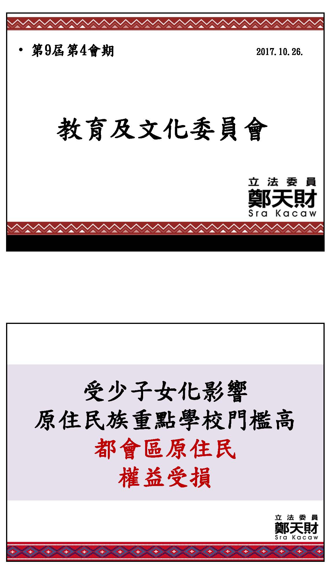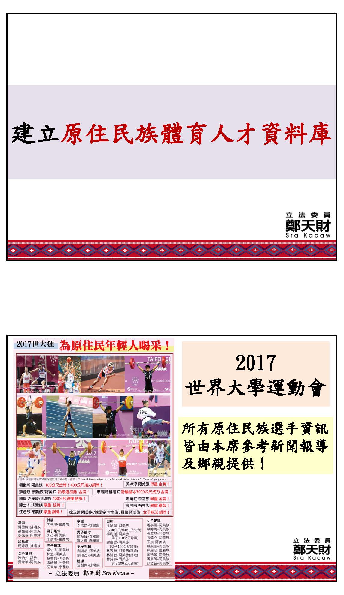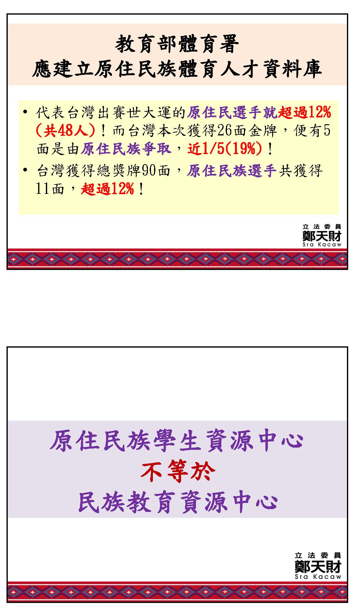 高潞‧以用‧巴魕剌Kawlo.Iyun.Pacidal委員:再來,有關12年國教已經有國小教育的課程將族語課程列為必修,可是現在出現列為必修可能看得到吃不到的問題。從我的觀察,主要是因為師資人力不足跟師資來源穩定性的問題。本席之前所提原住民師培專班或是師培中心,其實就是要試圖解決人力不足的問題。有一些師培大學也願意做這件事,我希望教育部能夠傾力支持,如果它們願意成立師培中心的話,我就讀的學校也有這樣的想法。