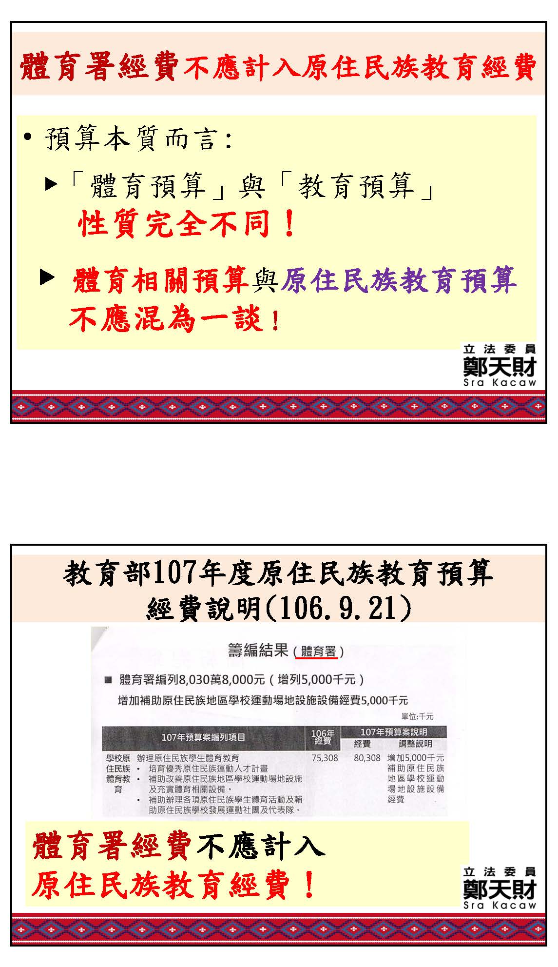 1.原住民族教育經費107年度編列35.28億元,連同原住民族委員會編列之12.28億元,合共47.56億元,較106年度預算數增加0.37億元,占本部主管107年度歲出預算總額之1.98%。