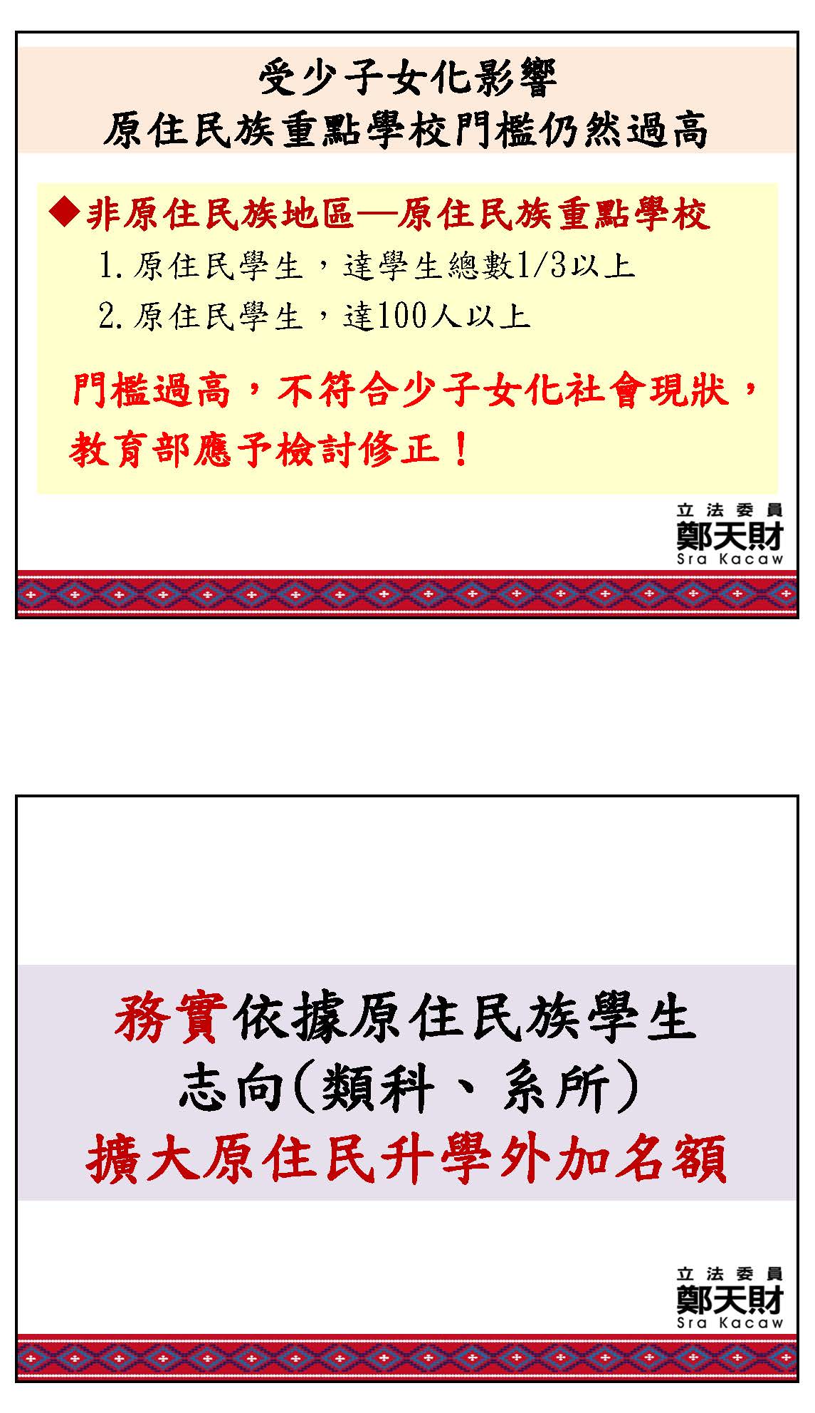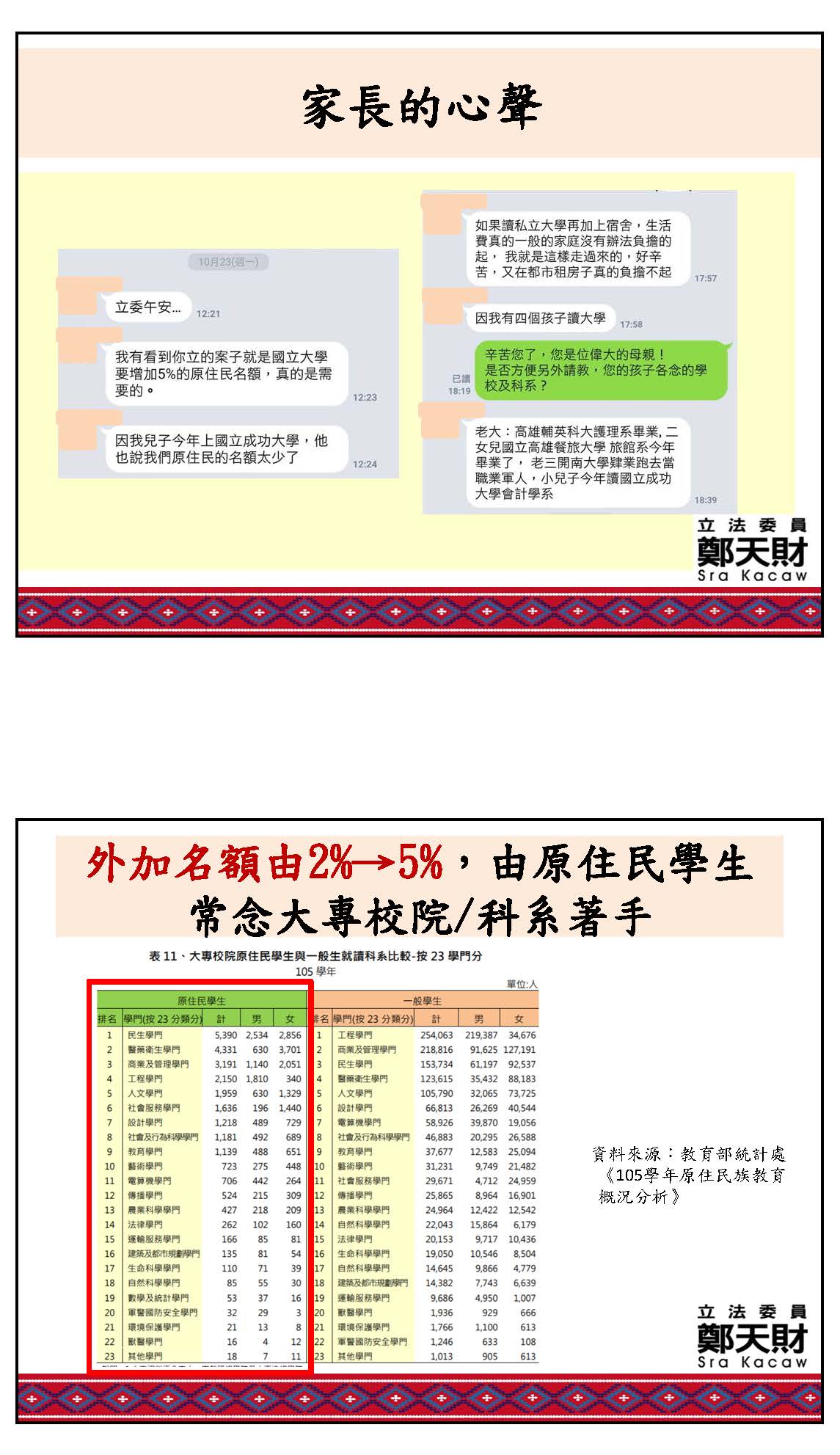 高潞‧以用‧巴魕剌Kawlo.Iyun.Pacidal委員:部長,這裡不要少掉原住民,在這個部分希望能夠讓原住民參與。此外,很多大學都有成立原住民專班,我當然知道每個大學都有成立原住民專班的目的,但比較難聽的也有人說是為了因應少子化的階段性策略,從我手上106年的資料來看,原住民學生從24,198人到23,844人,其實學生人口並沒有減少,只差200人,顯示原住民在少子化的速度比主流社會還緩和,可是原住民人口是成正比,但是為什麼我們在學校都是客體?所以未來在整個高教轉型的推動機制上,我要求一定要有原住民專家跟學者參與以及民間團體的聲音在裡面,請問教育部能做到嗎?