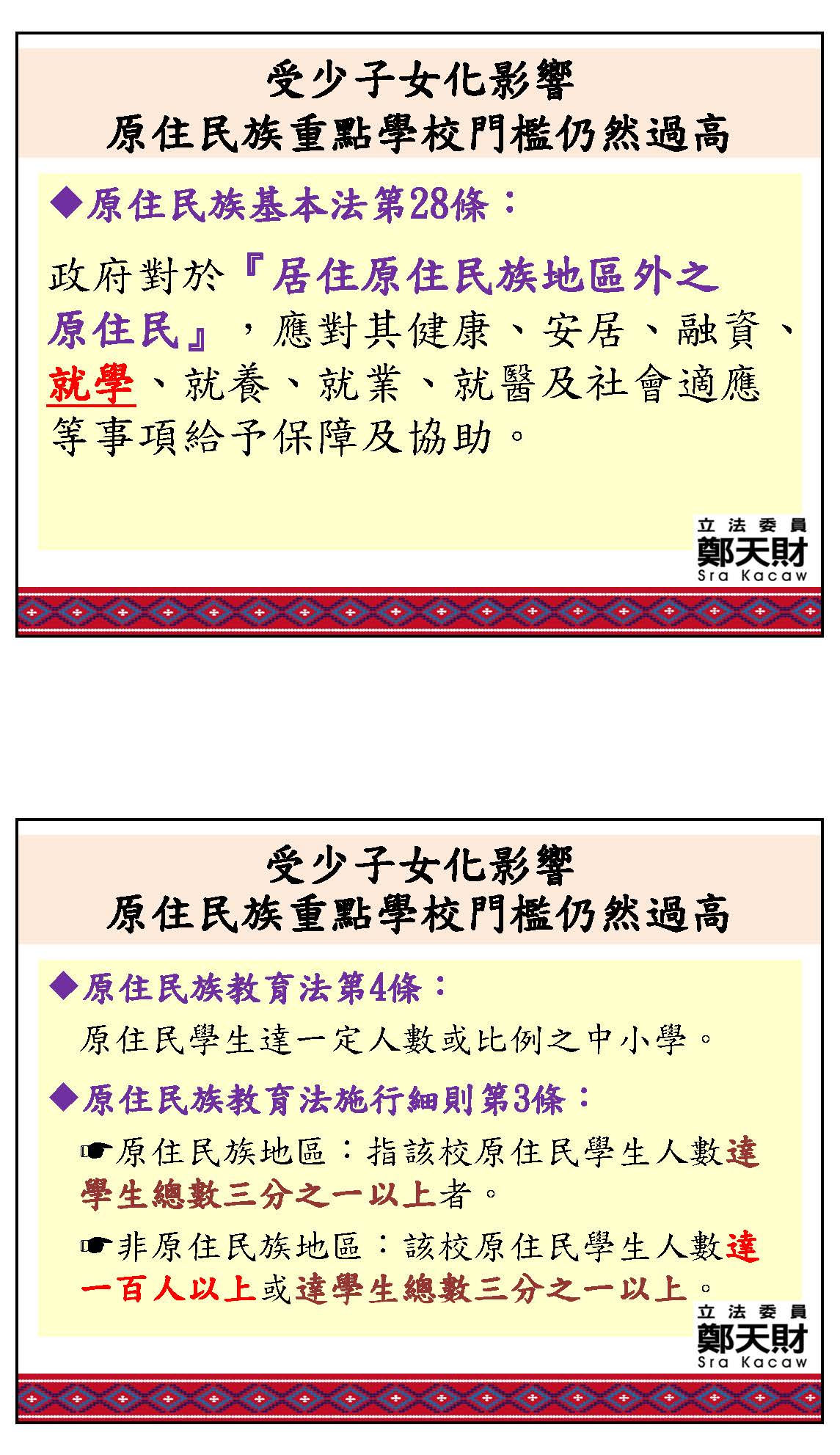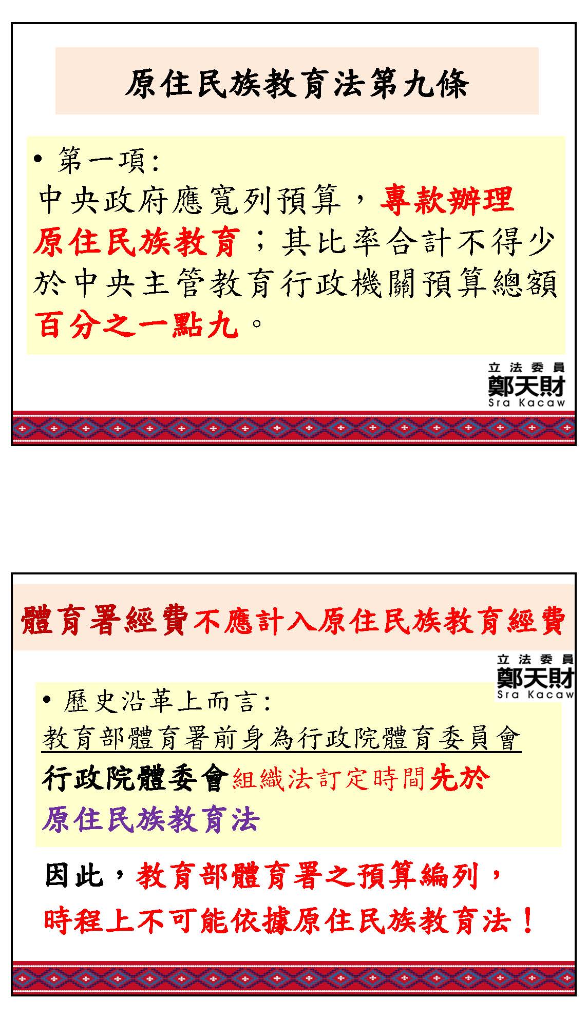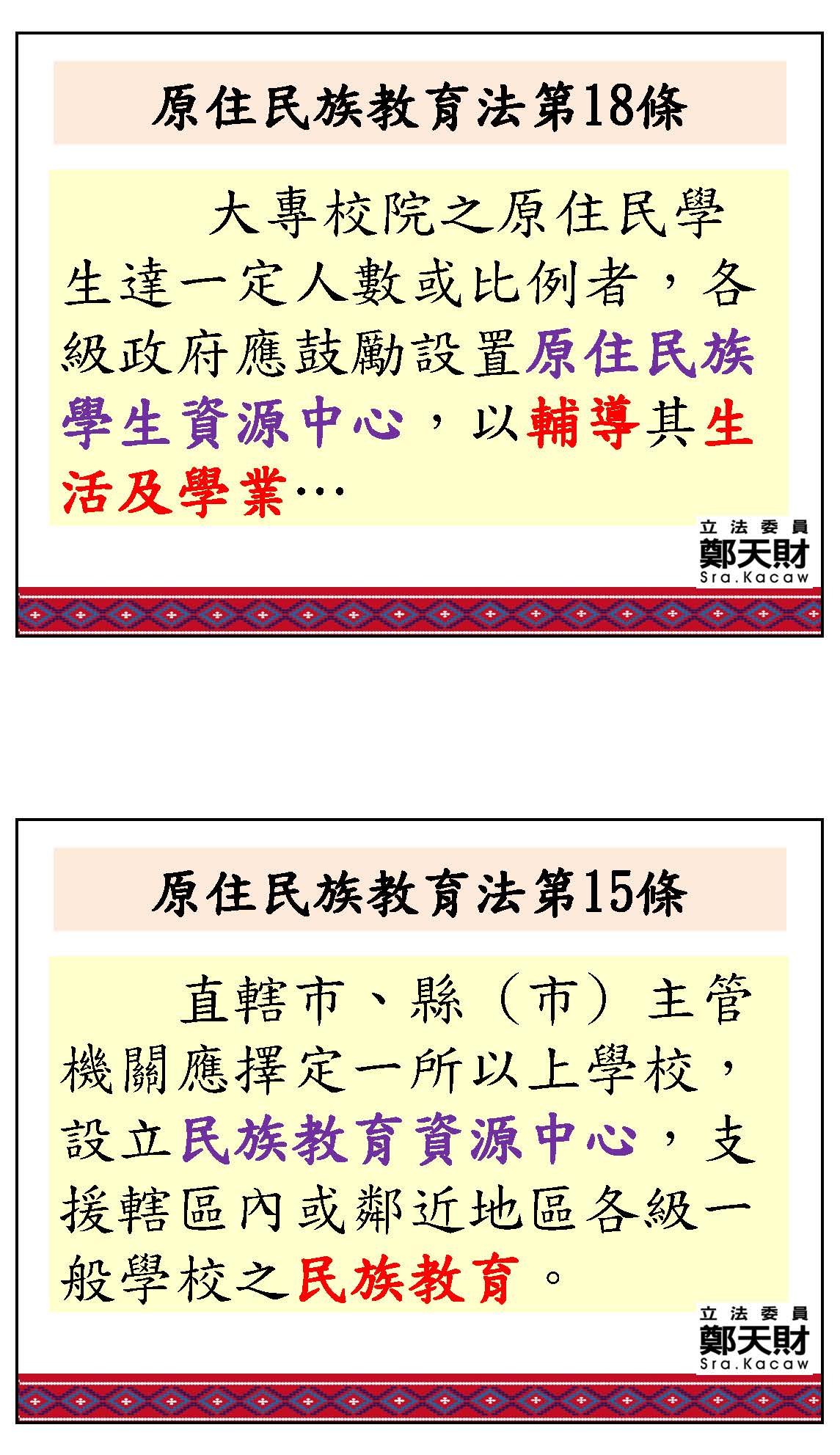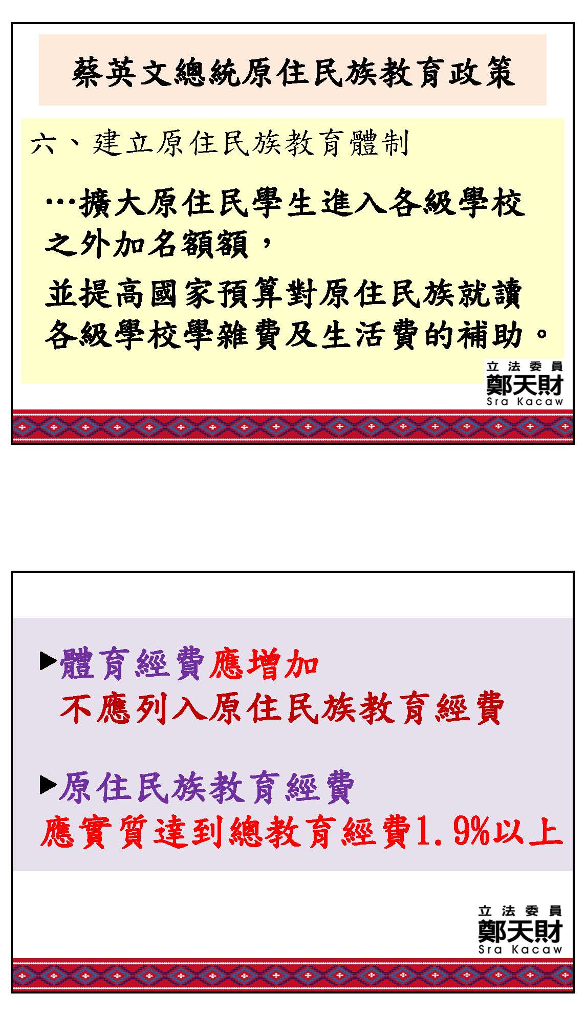 潘部長文忠:剛才署長特別提到有幾個政策方向也是用這個方式來做,不過對於族語教師的部分,大家比較傾向多軌,因為除了專職化的部分外,原來的資源、人員也有其地域分布的問題,委員提到的「共聘」制度,在我們的機制中如果區域合適,後續我們也會朝這個方向跟地方政府共同促成。