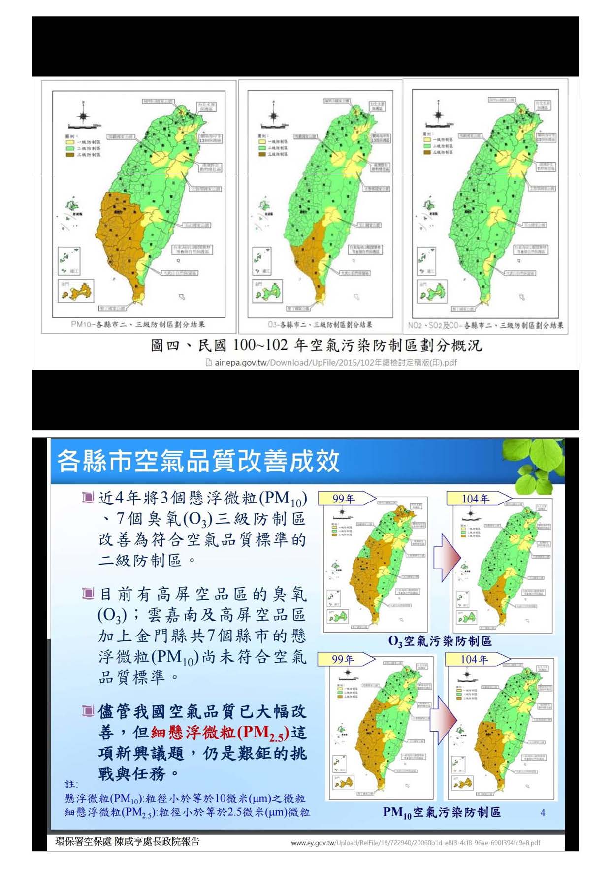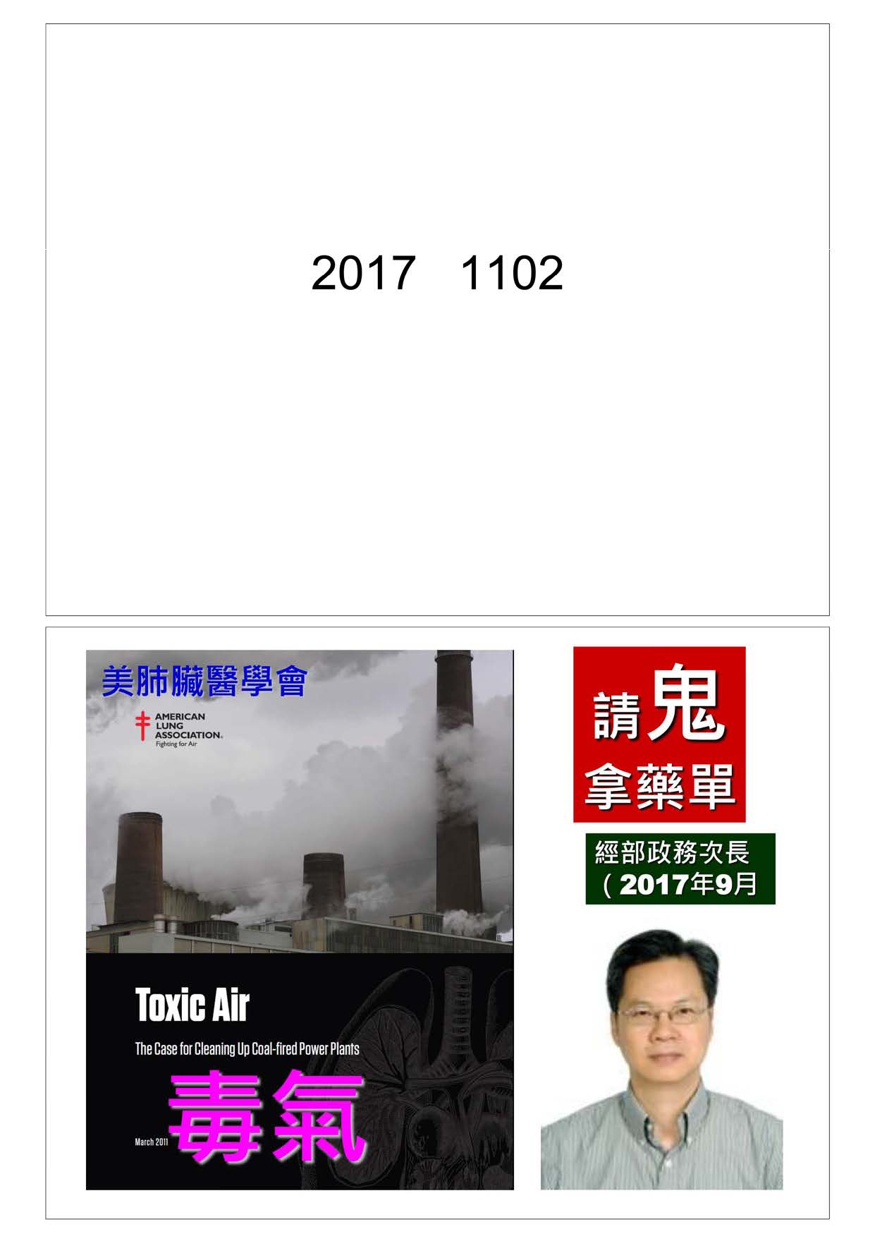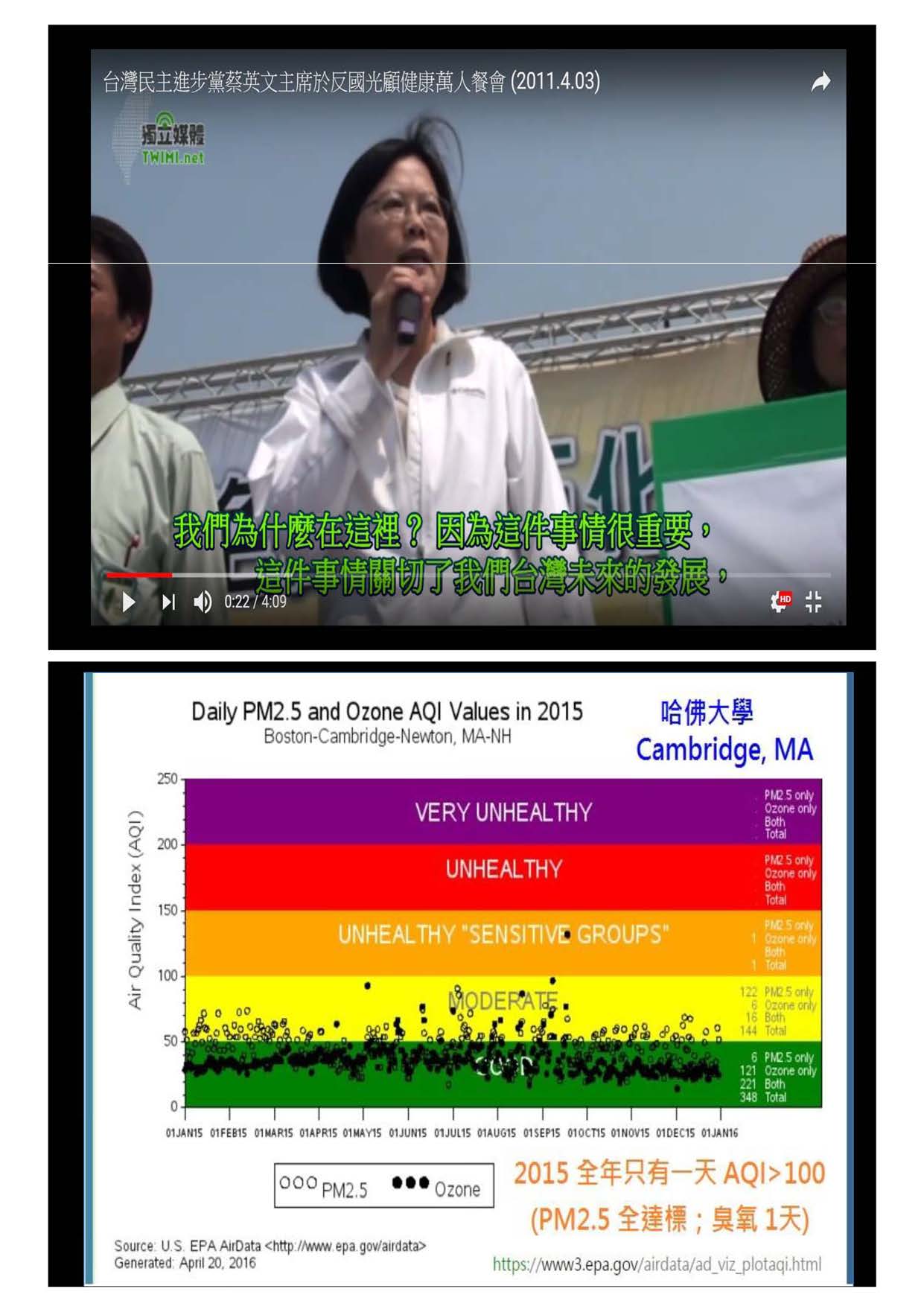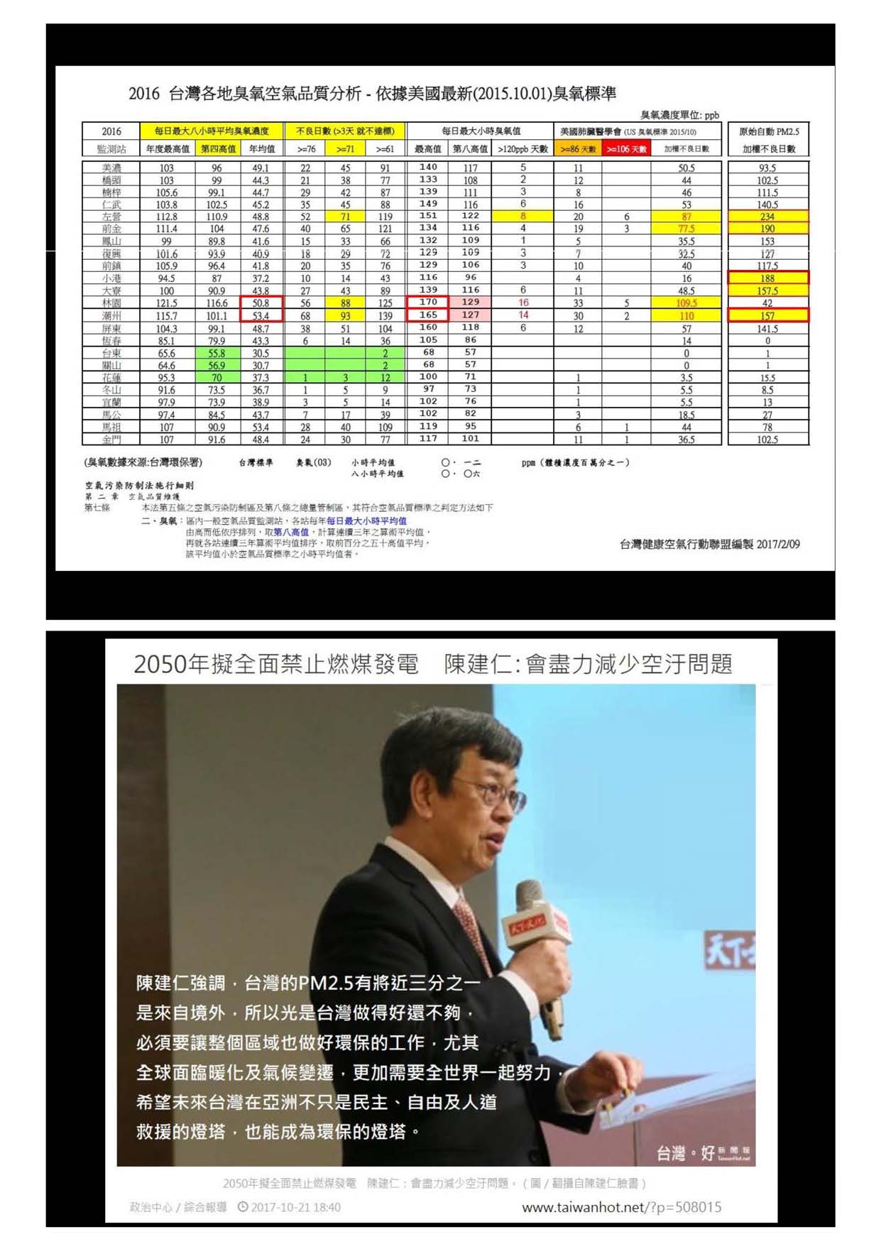 這張圖是公視的新聞,上半部是2014年報導PM2.5超標,下面則是2017年10月3日報導霾害入侵旭光國小。2014年是國民黨執政,2017年是民進黨執政,三年的時空都在這裡,一樣。劉建國委員也質詢過。如果核災食品是謀殺人民,臺灣的空氣正在謀殺人民,假如沒有修正、好好保護臺灣人民,那就是合法殺人。小英最近講過,清廉、勤政、愛鄉土,勤政是什麼?連環保署跟經濟部溝通一年半還在說要轉達。藍與黑,南部是藍的。林全說坐高鐵到臺中就晚了。這個世界不公不義,修法一定要修正、終結不公不義。燃煤是毒氣,如果連這個知識、常識都沒有的話,已經沒有資格做中華民國的知識分子,怎麼有資格領導臺灣?我點名經濟部的次長,他完全不適合做這個,連中華民國的知識分子都不適合當的時候,他還要怎麼領導臺灣的經濟?它對經濟是有損害的,對健康是有損害的,對環境是損害的,連這個概念都沒有。我受到2011年美國肺臟醫學會啟發。