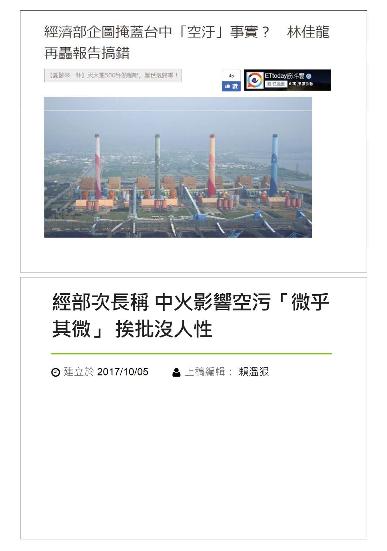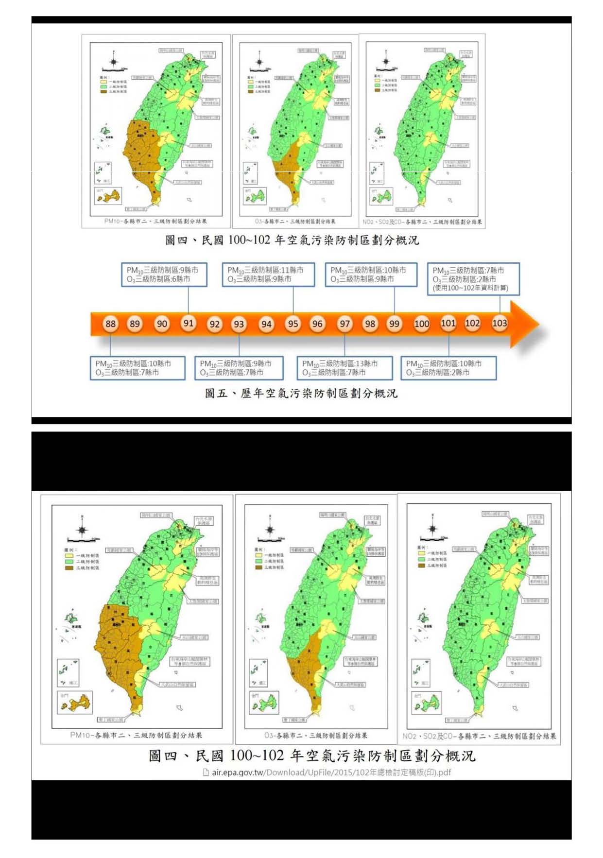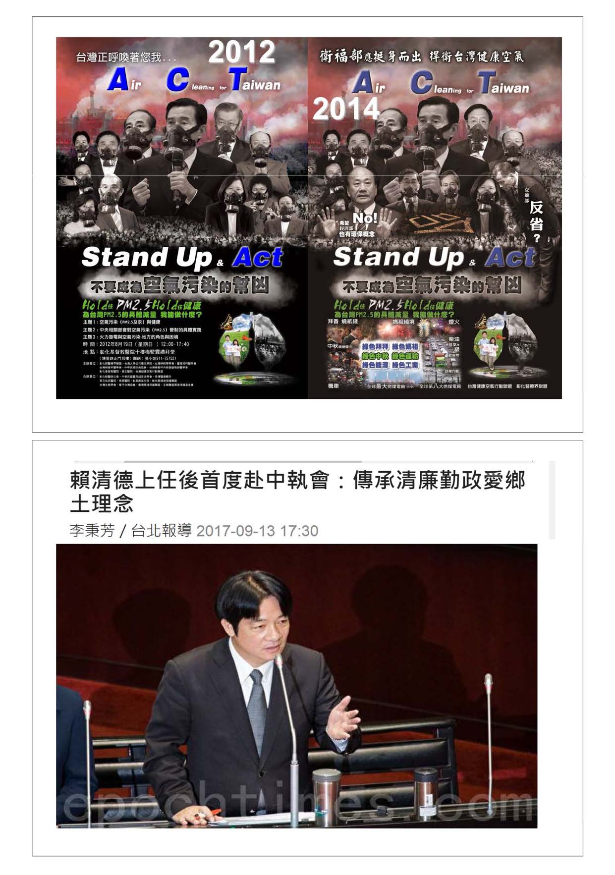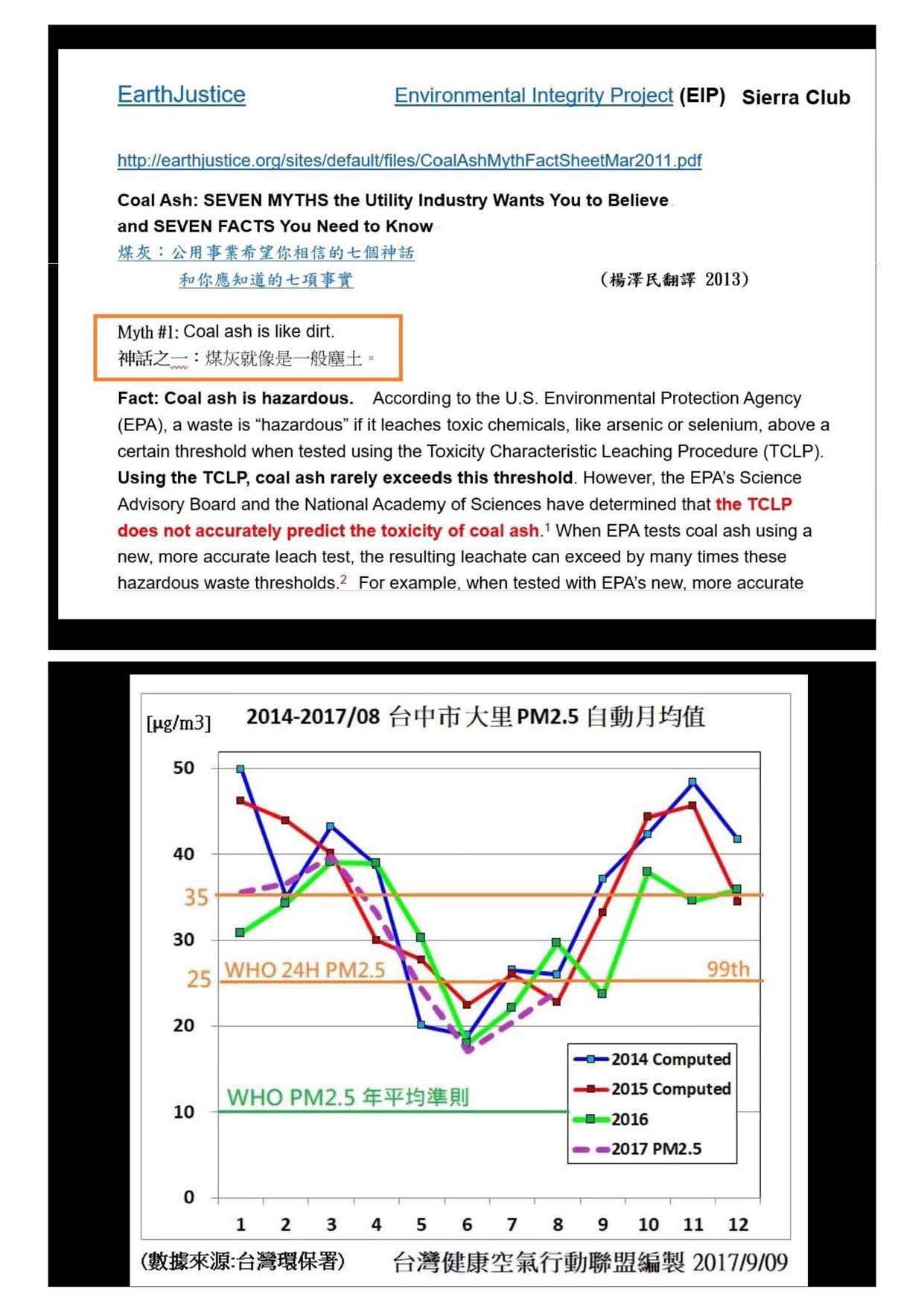 這張圖是公視的新聞,上半部是2014年報導PM2.5超標,下面則是2017年10月3日報導霾害入侵旭光國小。2014年是國民黨執政,2017年是民進黨執政,三年的時空都在這裡,一樣。劉建國委員也質詢過。如果核災食品是謀殺人民,臺灣的空氣正在謀殺人民,假如沒有修正、好好保護臺灣人民,那就是合法殺人。小英最近講過,清廉、勤政、愛鄉土,勤政是什麼?連環保署跟經濟部溝通一年半還在說要轉達。藍與黑,南部是藍的。林全說坐高鐵到臺中就晚了。這個世界不公不義,修法一定要修正、終結不公不義。燃煤是毒氣,如果連這個知識、常識都沒有的話,已經沒有資格做中華民國的知識分子,怎麼有資格領導臺灣?我點名經濟部的次長,他完全不適合做這個,連中華民國的知識分子都不適合當的時候,他還要怎麼領導臺灣的經濟?它對經濟是有損害的,對健康是有損害的,對環境是損害的,連這個概念都沒有。我受到2011年美國肺臟醫學會啟發。