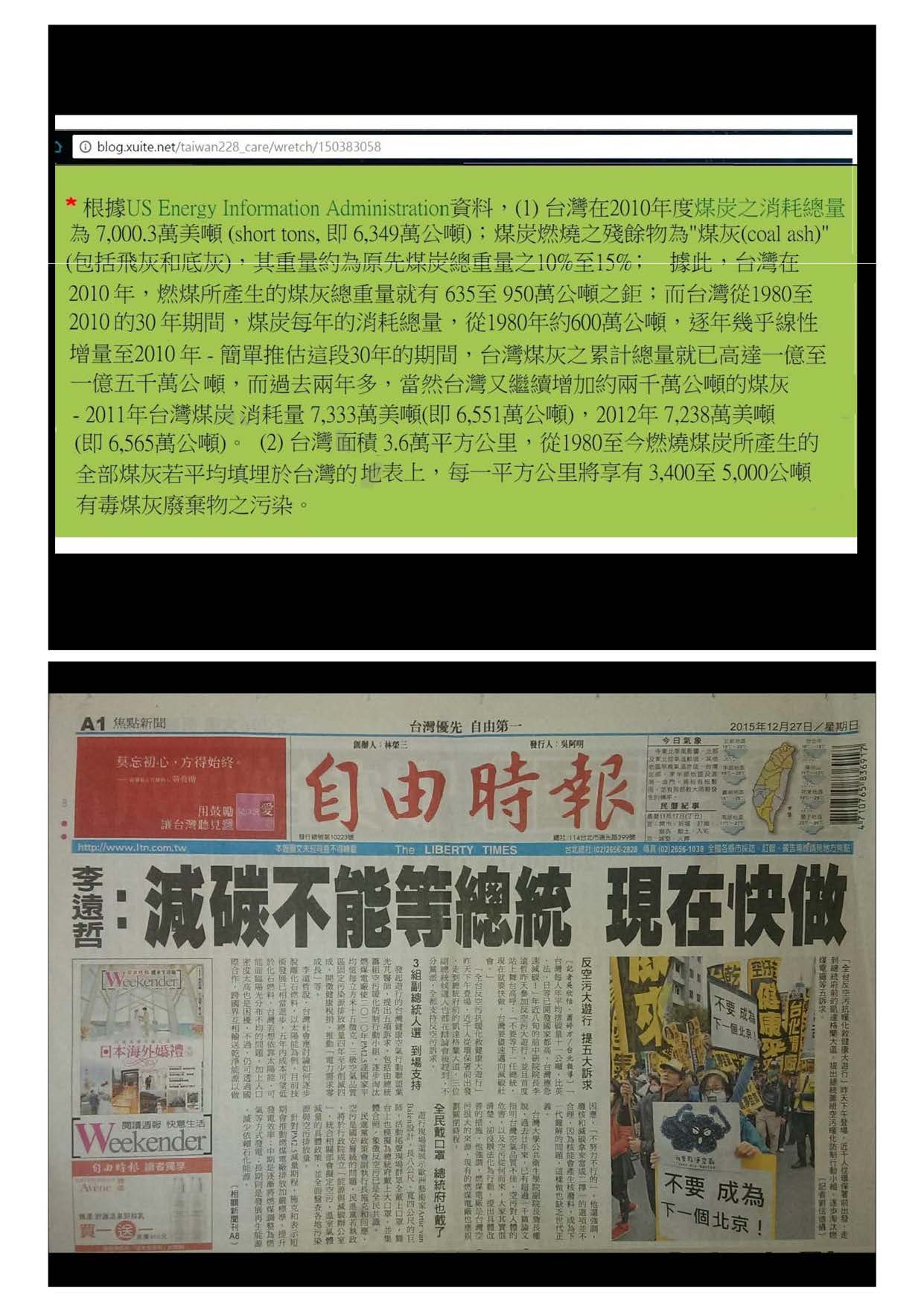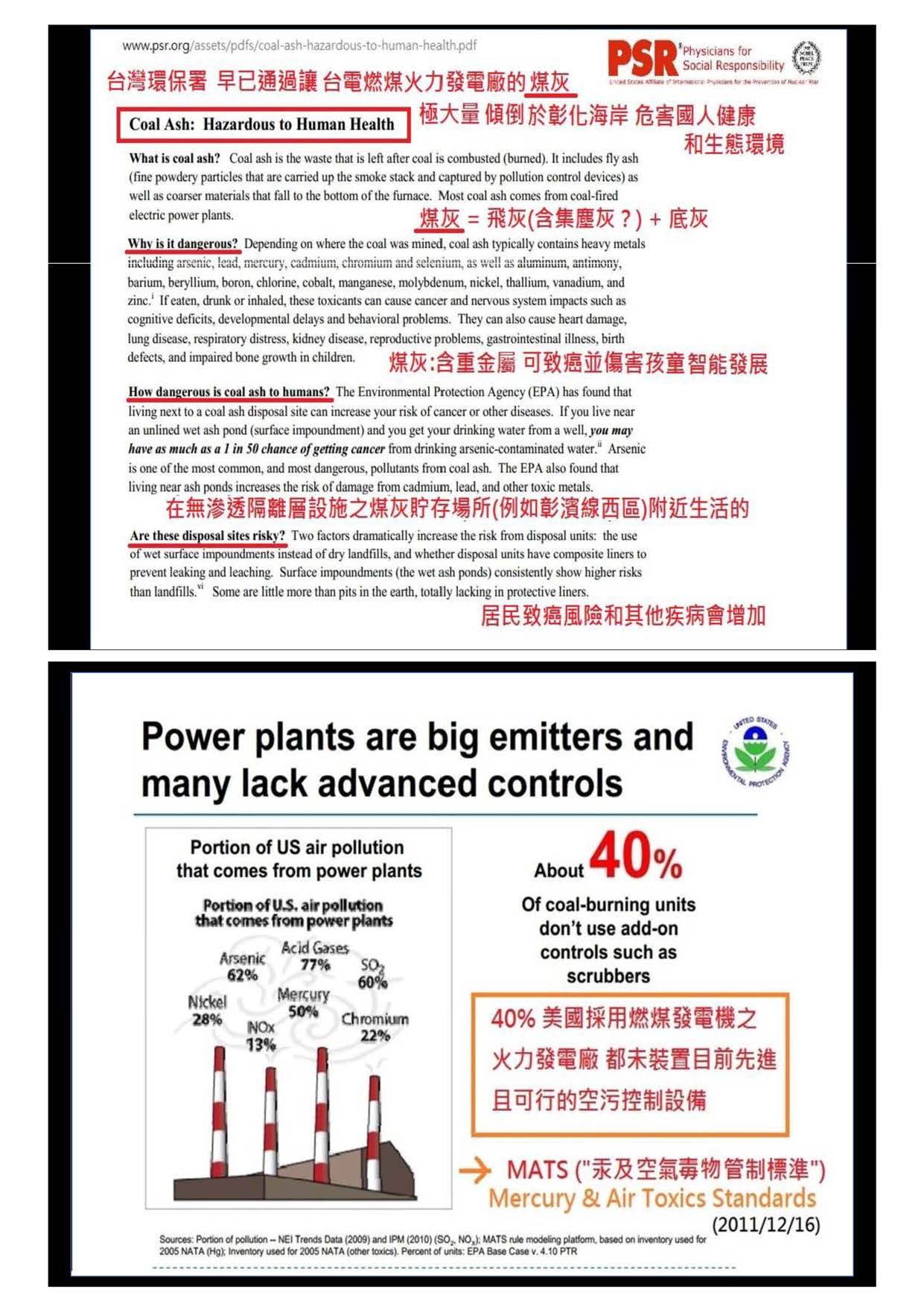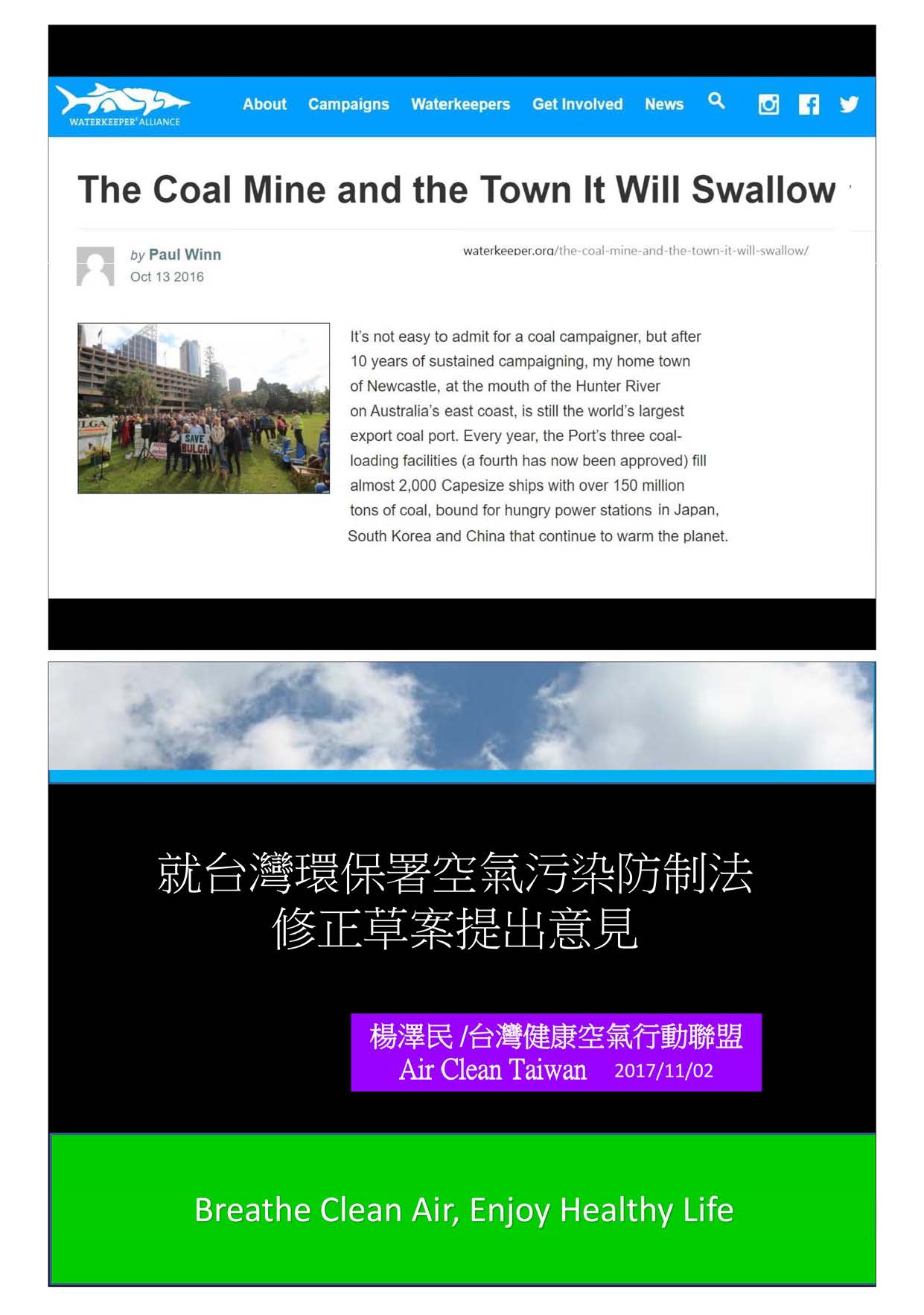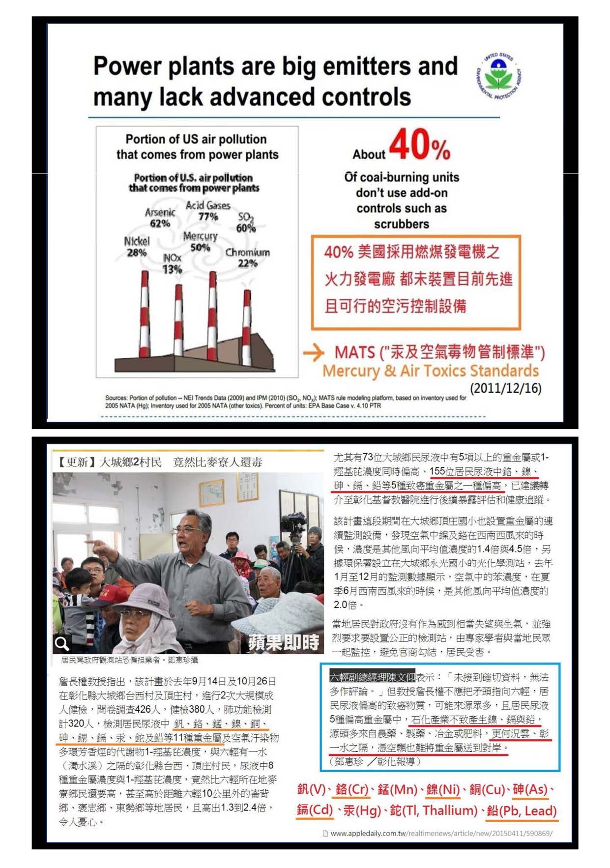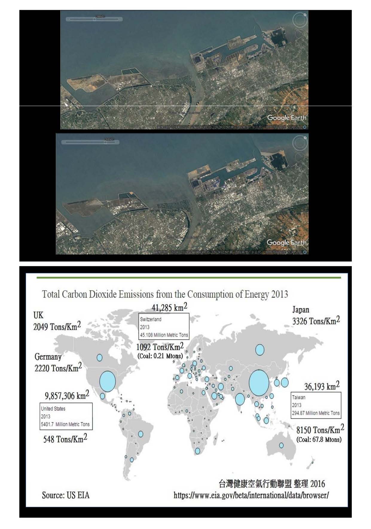 這張圖是公視的新聞,上半部是2014年報導PM2.5超標,下面則是2017年10月3日報導霾害入侵旭光國小。2014年是國民黨執政,2017年是民進黨執政,三年的時空都在這裡,一樣。劉建國委員也質詢過。如果核災食品是謀殺人民,臺灣的空氣正在謀殺人民,假如沒有修正、好好保護臺灣人民,那就是合法殺人。小英最近講過,清廉、勤政、愛鄉土,勤政是什麼?連環保署跟經濟部溝通一年半還在說要轉達。藍與黑,南部是藍的。林全說坐高鐵到臺中就晚了。這個世界不公不義,修法一定要修正、終結不公不義。燃煤是毒氣,如果連這個知識、常識都沒有的話,已經沒有資格做中華民國的知識分子,怎麼有資格領導臺灣?我點名經濟部的次長,他完全不適合做這個,連中華民國的知識分子都不適合當的時候,他還要怎麼領導臺灣的經濟?它對經濟是有損害的,對健康是有損害的,對環境是損害的,連這個概念都沒有。我受到2011年美國肺臟醫學會啟發。