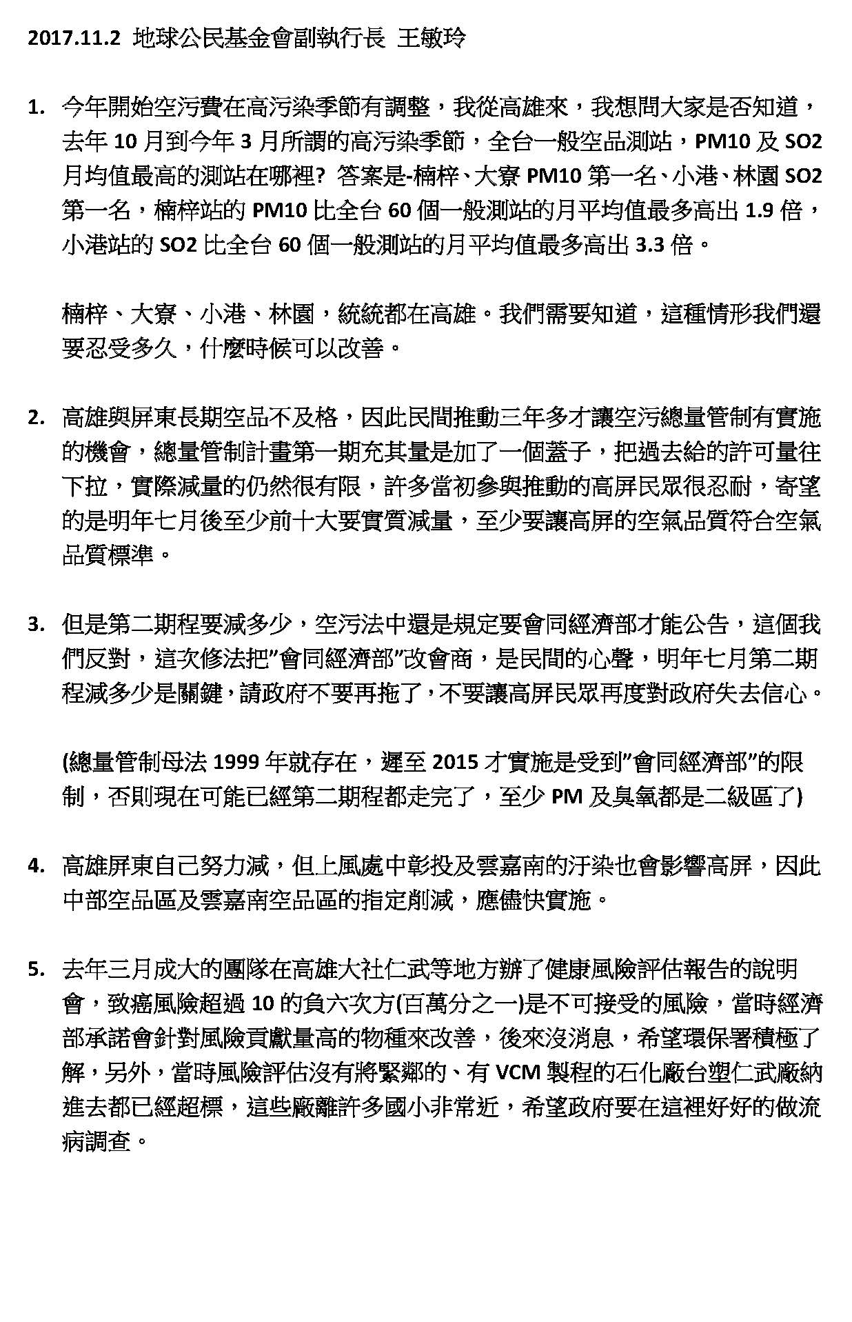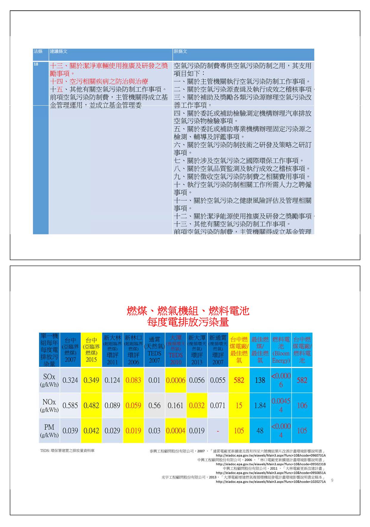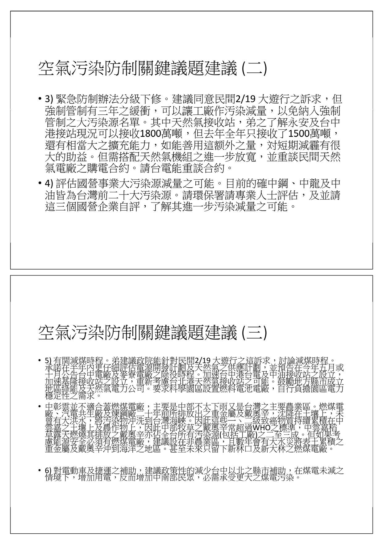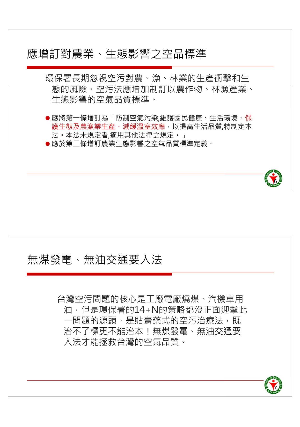 我手上這個是剛才台電公司給我的簡報,老實講,我看了有一點失望啦!當然,講到空污法的部分,因為涉及很廣,不是只有台電公司的電廠問題,固定污染源、移動污染源裡面涉及到怎麼樣管制、怎麼樣處罰這些,我想有很多內容可以再進一步討論,不過我覺得這一次空污法的修法,整體來講,雖然行政部門的版本有提到關於加強罰則或者加強管制的部分,但是有一塊是我在這部法律裡面一直沒辦法看得出具體內容的,就是空污與健康的關係如何在這裡面被體現?健康的因素如何配置在法律的內容當中?我們防制空污的目的是為了什麼?當然是為了健康啊!這是最大的一個目標嘛!這一點在整個修法的主體性當中,並沒有被很明顯地凸顯,然後,它是怎樣被具體地評估而受到法律的約束,以及對健康危害之後相關罰則的律定,這部分我覺得不夠清楚,所以我在這邊特別提出來,是不是能夠請行政部門再加以考量?讓這個修法可以更完備,也達到我們整個空污防制的最大目的,也就是捍衛民眾跟人民的健康。