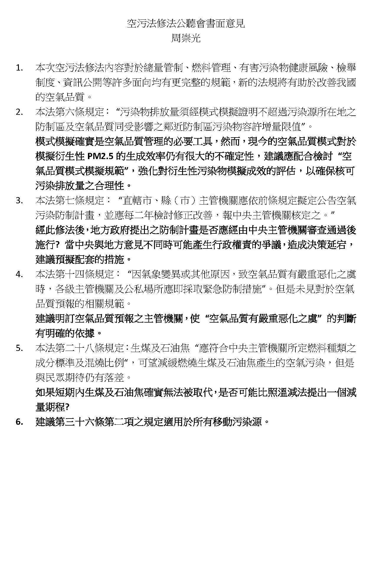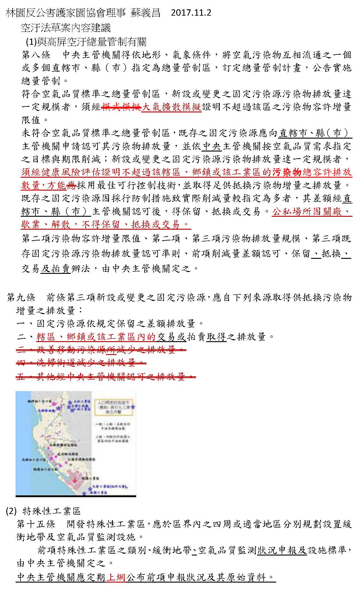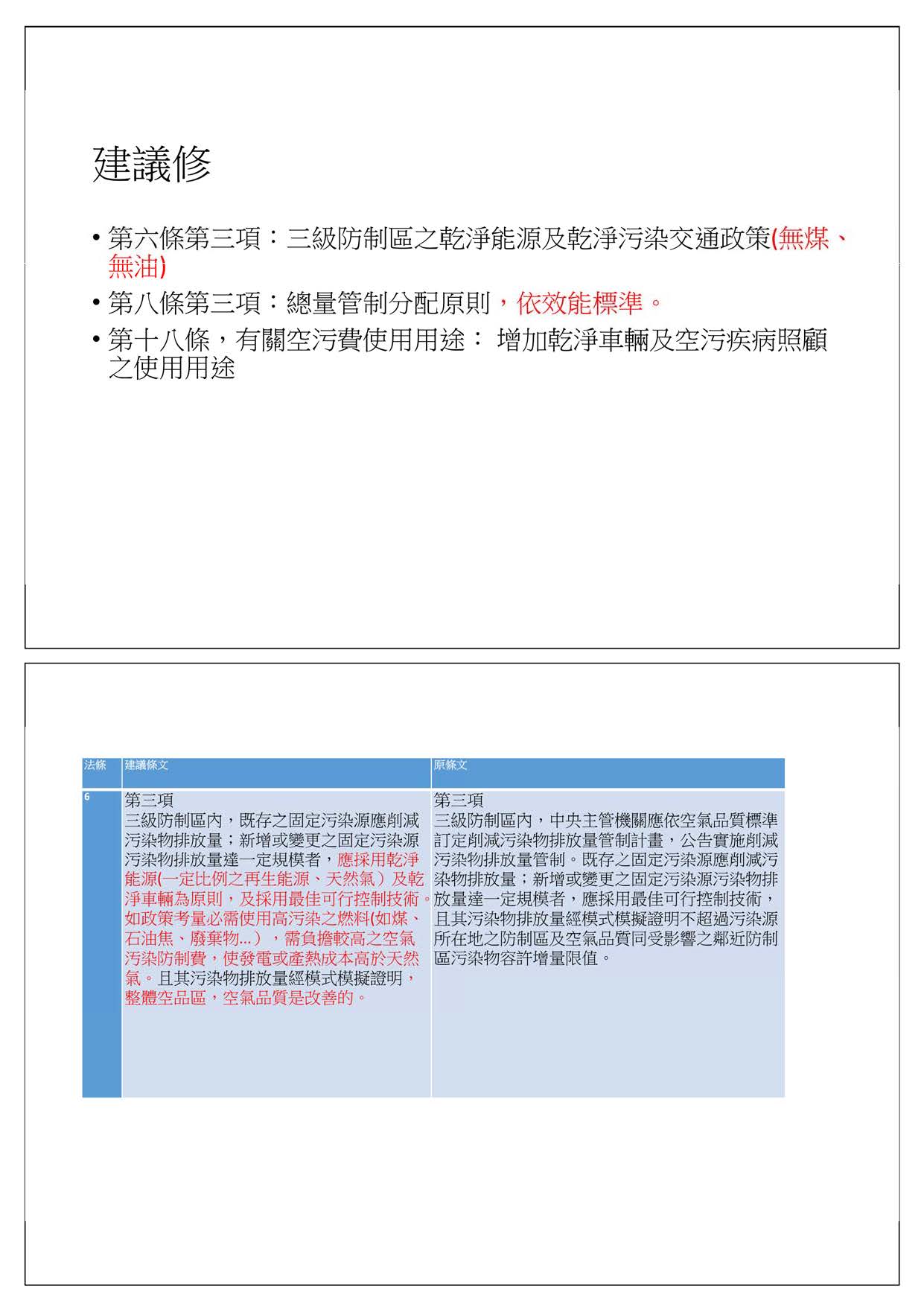 我自己有提出空污法的修法版本,今天也看到很多委員的版本,大家可以再看一下,思考這樣的修正文字是否能讓大家比較滿意。以上,謝謝。