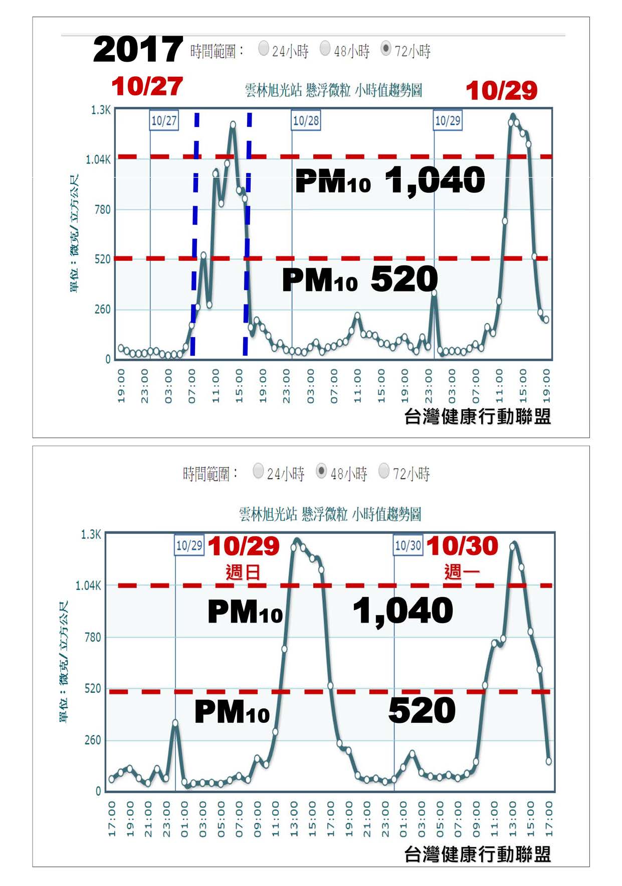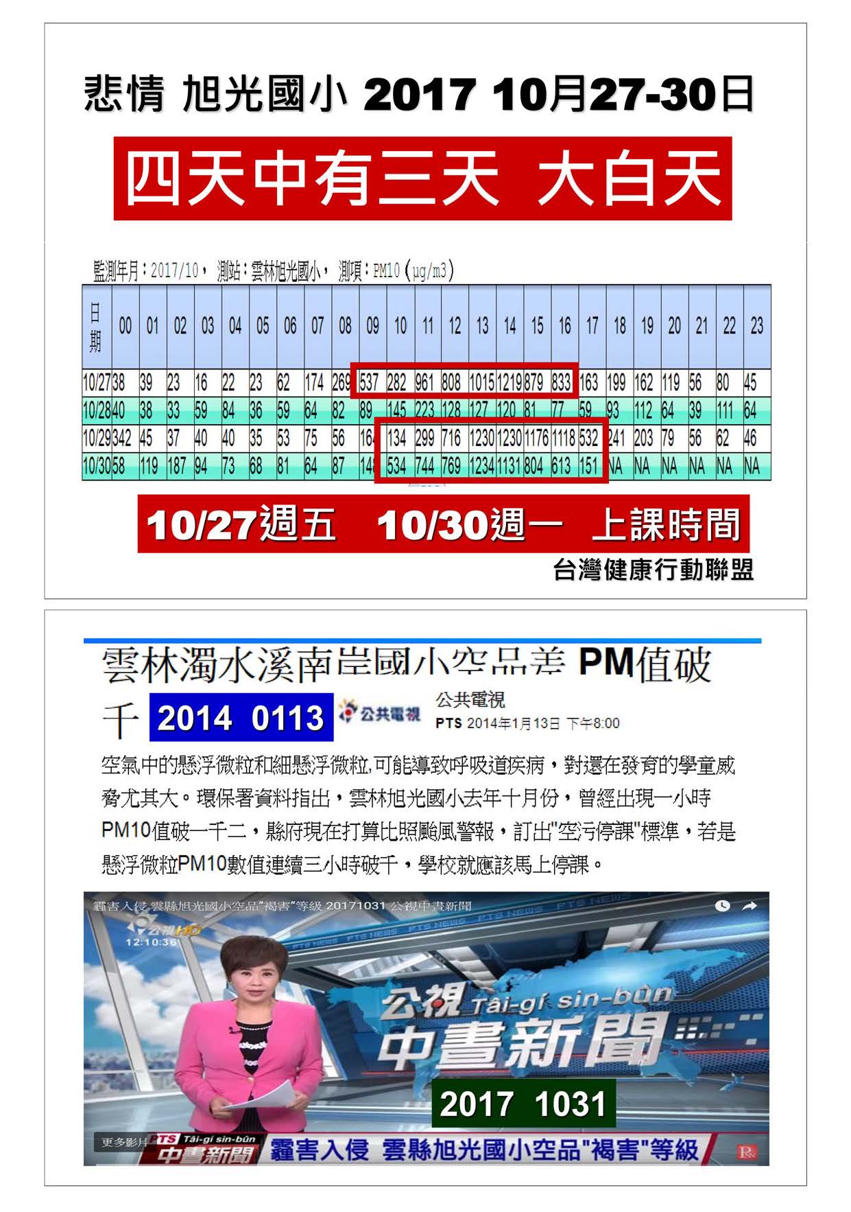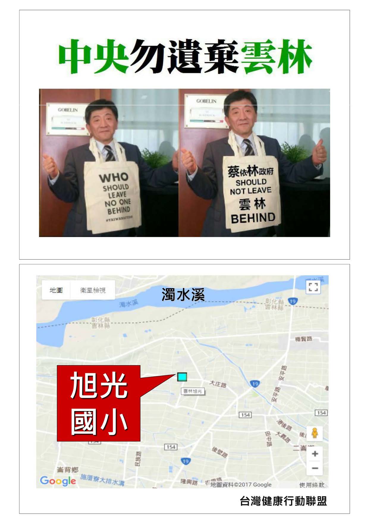 另外這一張簡報是他們去參加世界衛生組織時拍的照片,我們希望世界衛生組織不要放棄臺灣,我們想要加入世衛,但我們也要說,請「蔡」依「林」政府不要放棄雲林,這也是我們610行動的訴求,當時我的演講就是說這個議題。關於旭光國小的監測值,連續四天,其中有三天超標,狀況就和三、四年前一樣,但我不知道新政府有什麼行動。