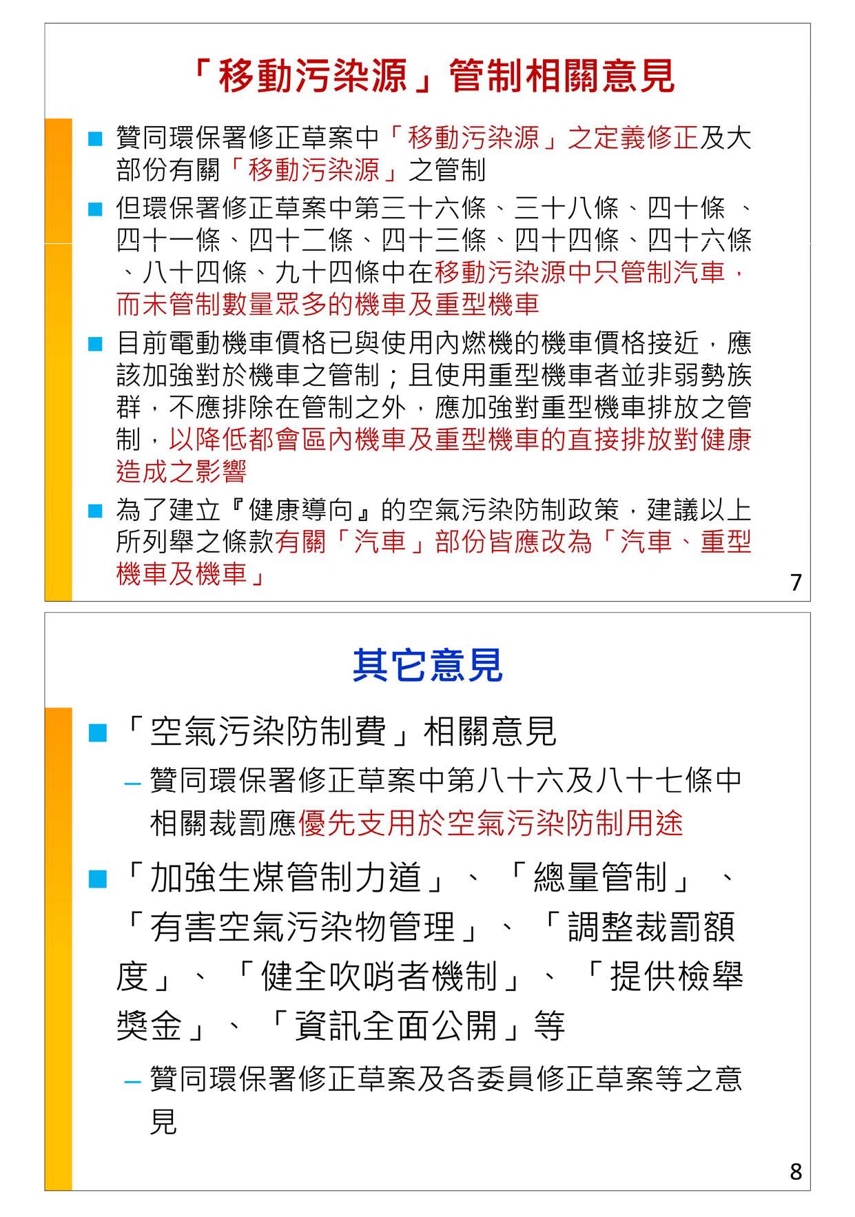 針對移動污染源的定義,我都非常贊同,但是對於環保署的修正條文中有一些條文只針對汽車,沒有管制數量眾多的機車及重型機車,我覺得很有疑慮。目前電動機車的價格和內燃機的機車價格非常接近,如果大家覺得使用機車是弱勢族群的話,但重型機車並不是弱勢族群,不應該被排除在管制之外。因此我認為這些條文都應該對汽車、重型機車、機車加以管制。其他部分我都非常贊同目前管制的方向,這就是我的具體修正意見,謝謝大家。
