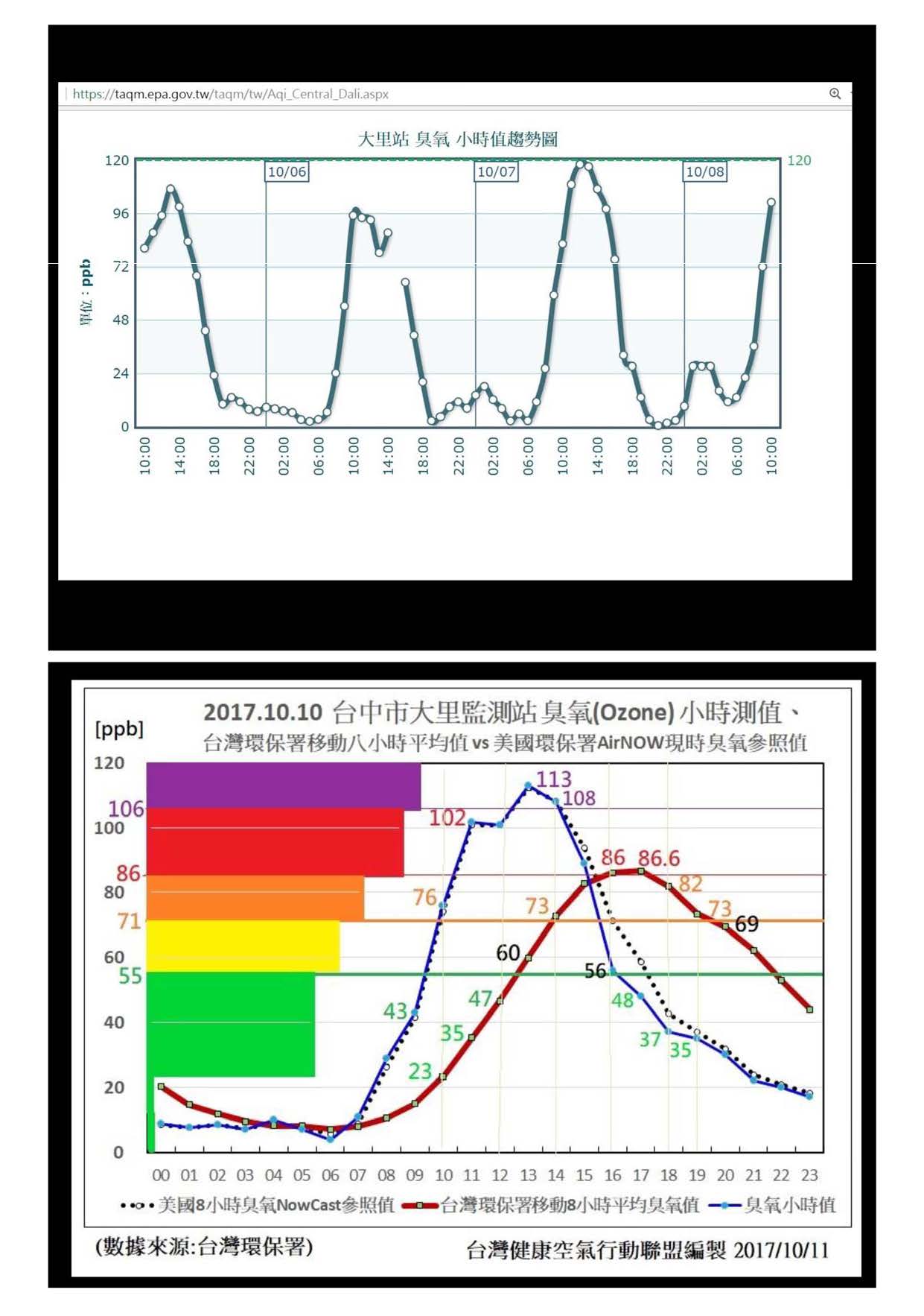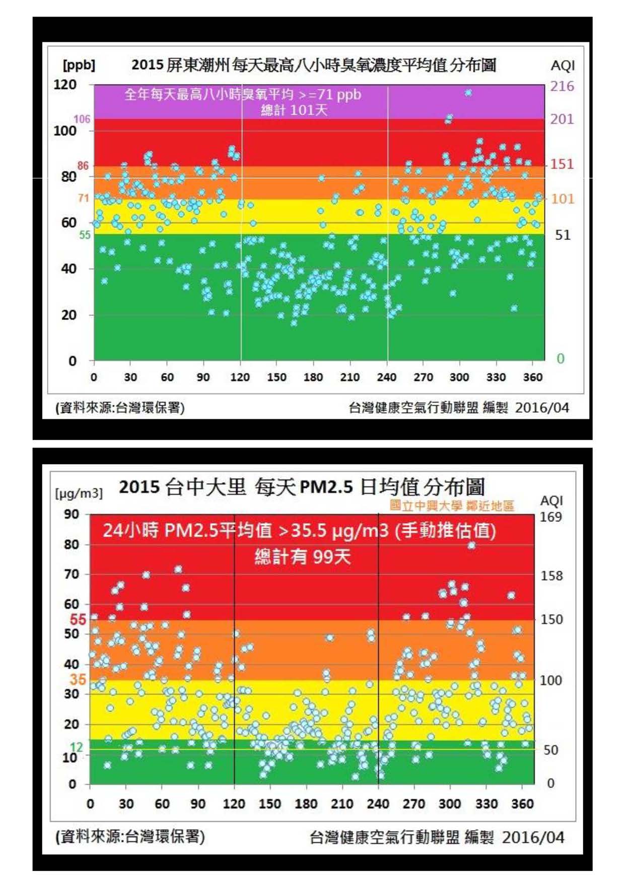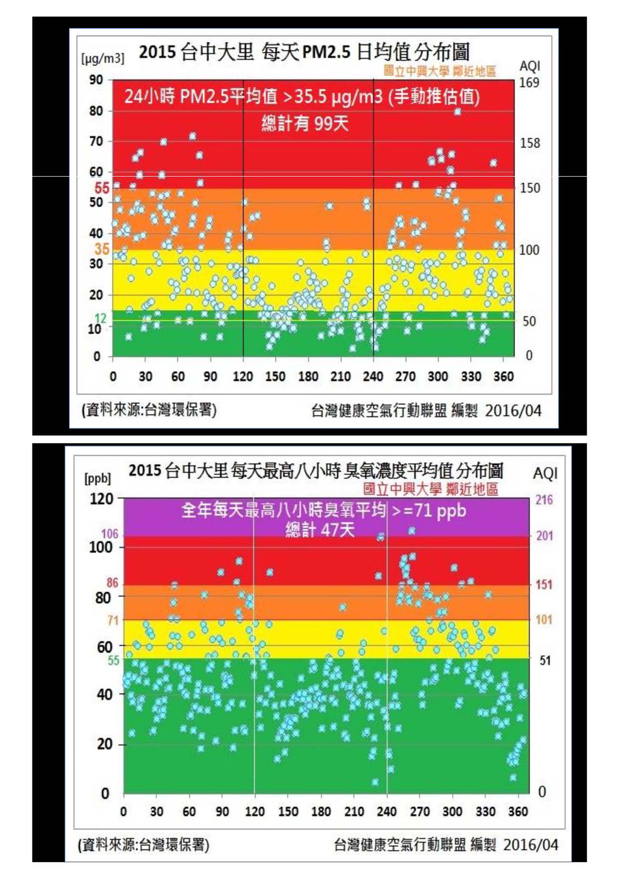 我們就講大里好了,當地PM2.5平均值大於35.5μg/m3的多達99天;8小時臭氧平均值大於、等於77ppb的總計47天。我們希望中興大學的學生能和哈佛大學的學生一樣呼吸健康的空氣;能和馬英九前總統、李應元署長享受同樣的空氣品質。請讓那邊的學生、孩子能夠呼吸健康的空氣。