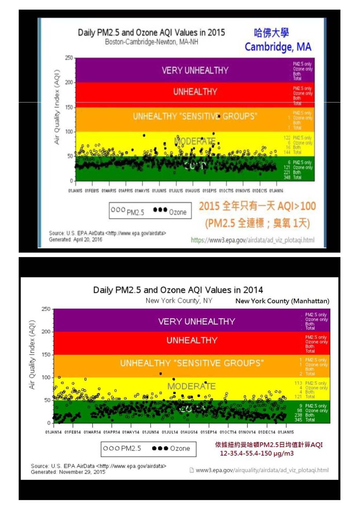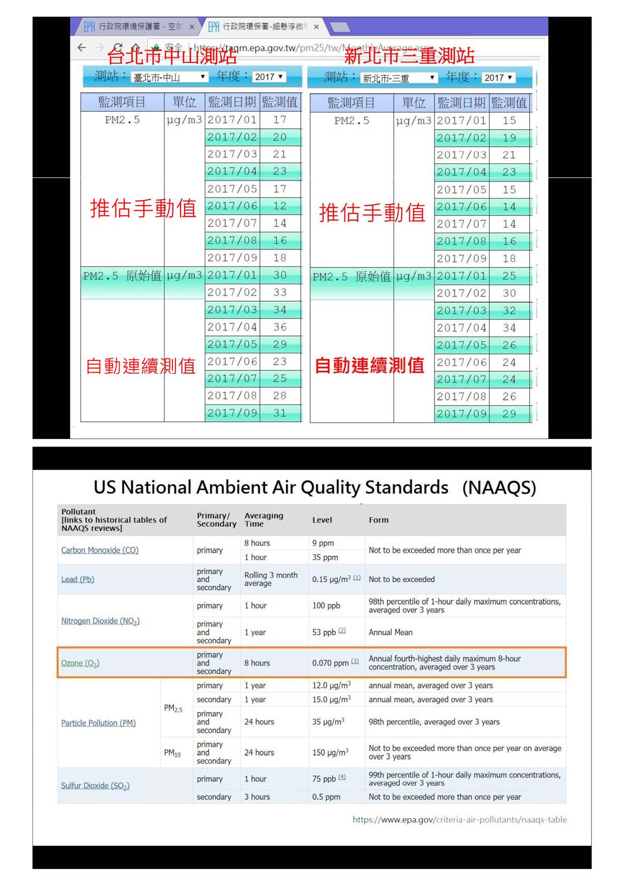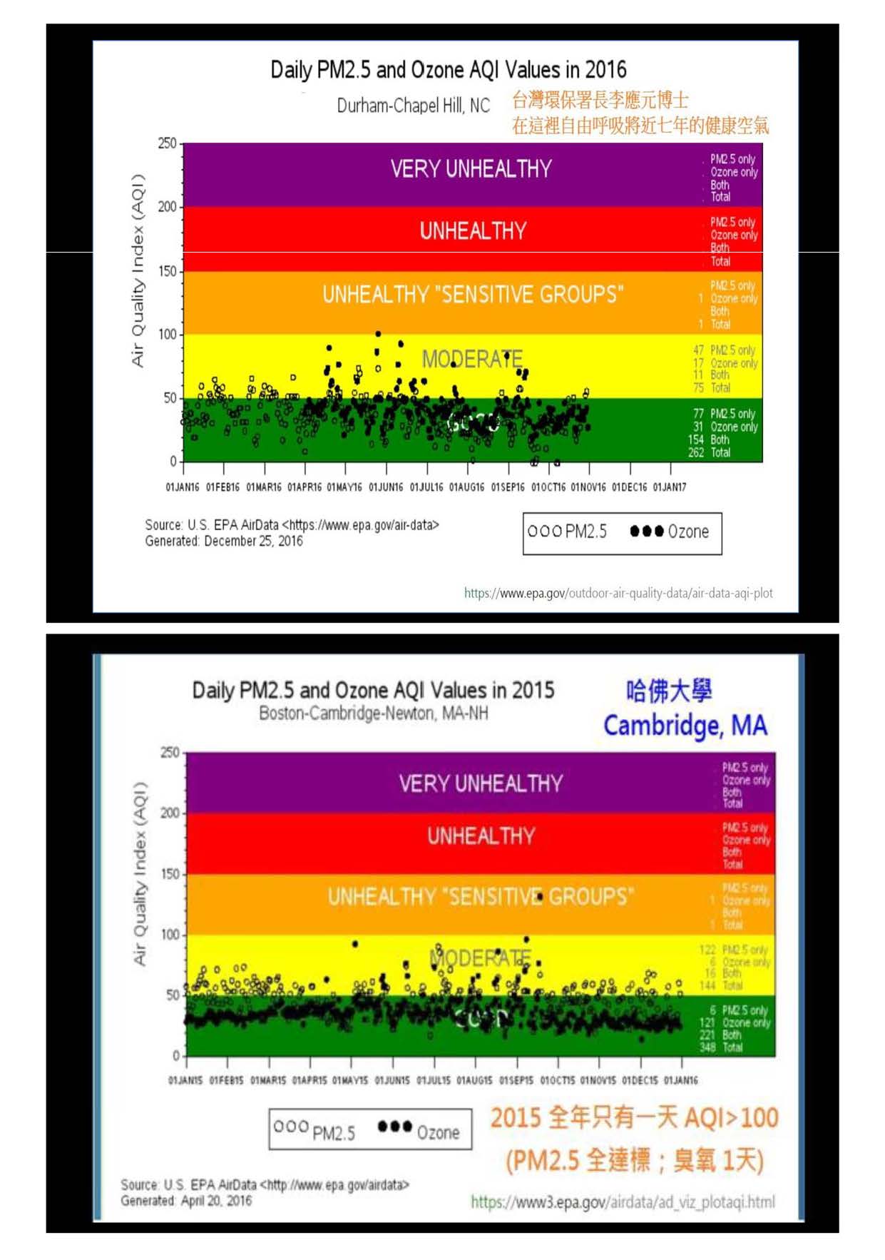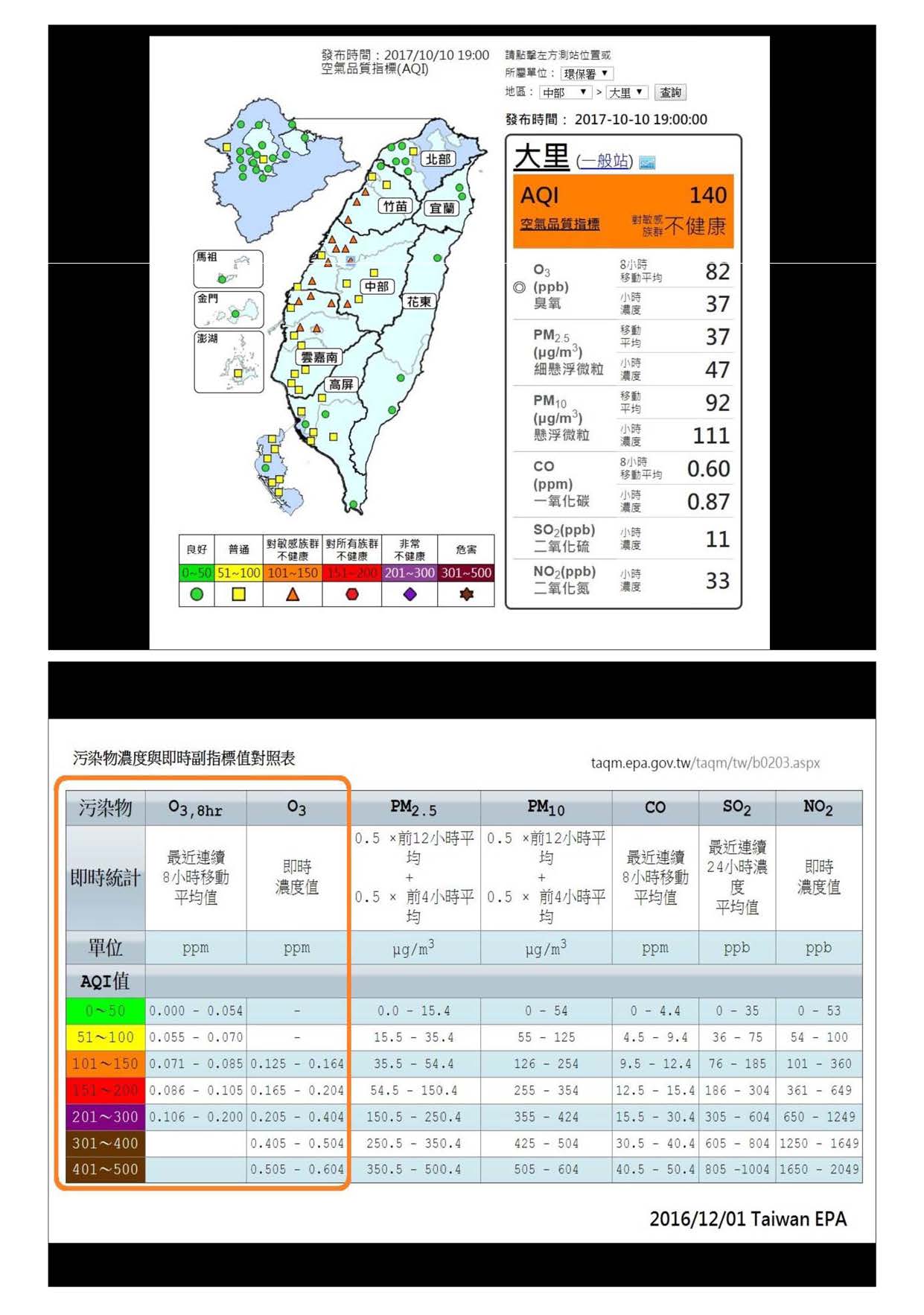 我們就講大里好了,當地PM2.5平均值大於35.5μg/m3的多達99天;8小時臭氧平均值大於、等於77ppb的總計47天。我們希望中興大學的學生能和哈佛大學的學生一樣呼吸健康的空氣;能和馬英九前總統、李應元署長享受同樣的空氣品質。請讓那邊的學生、孩子能夠呼吸健康的空氣。