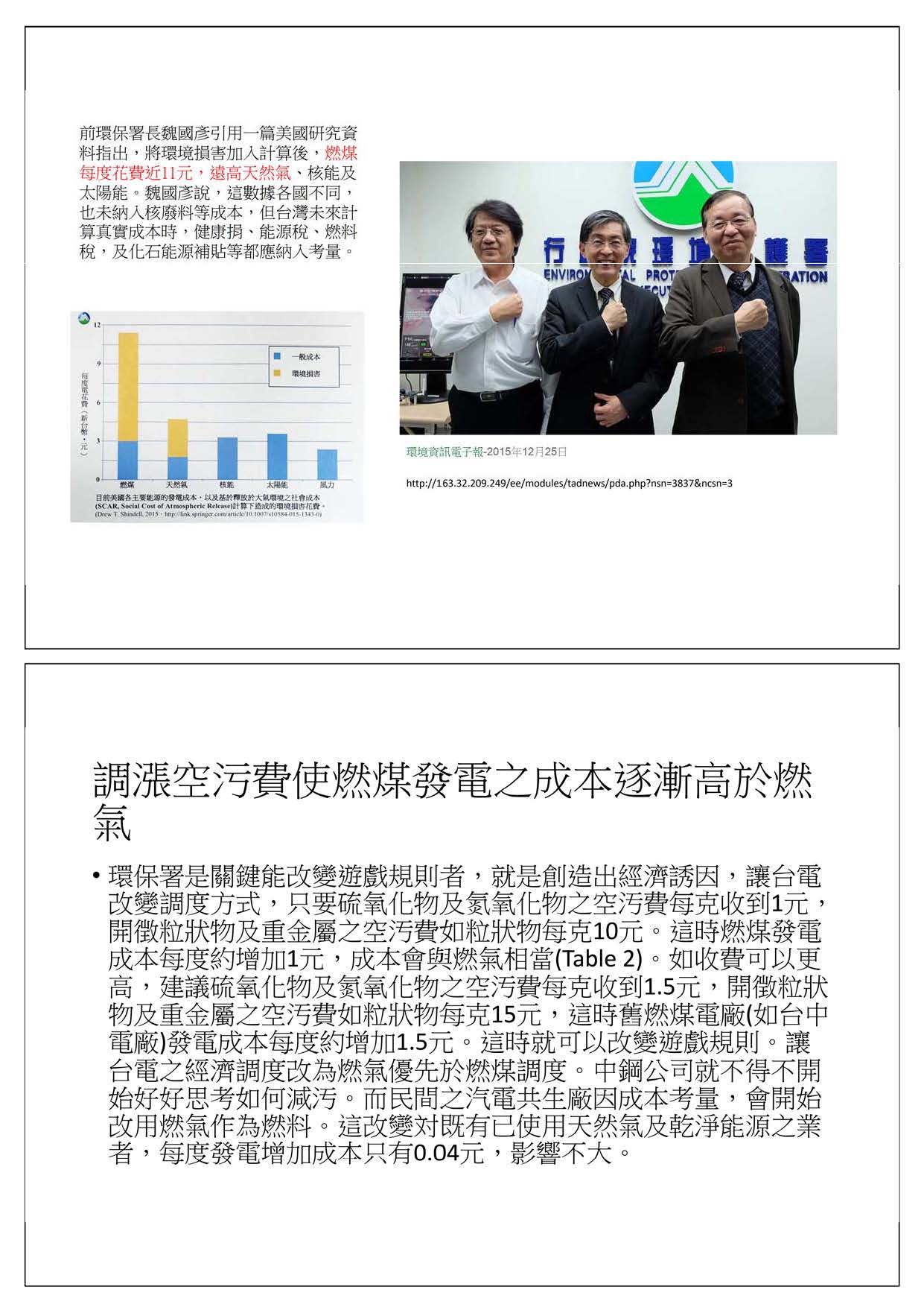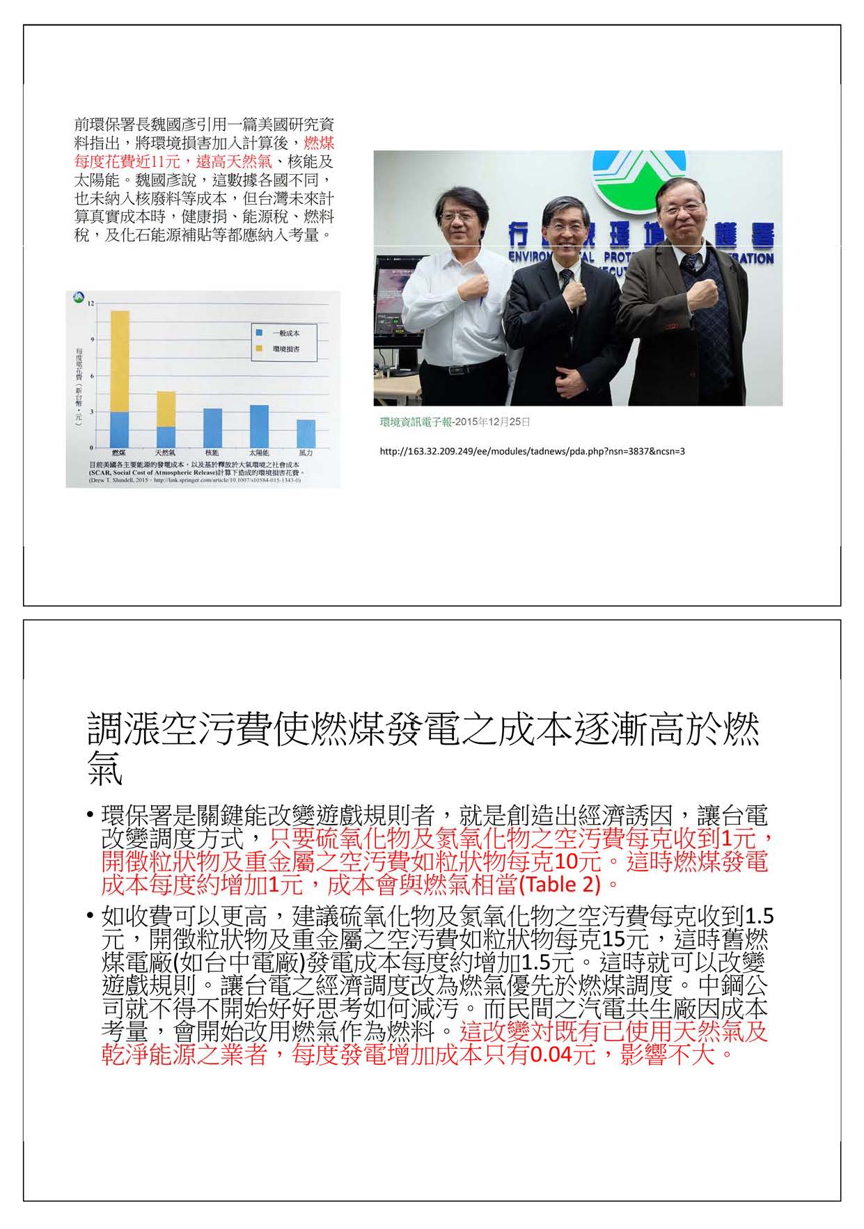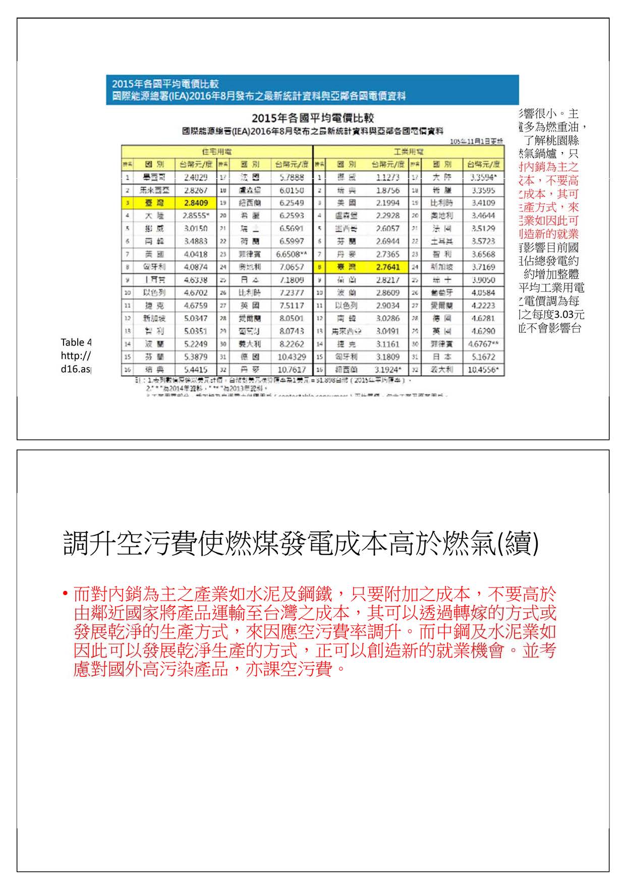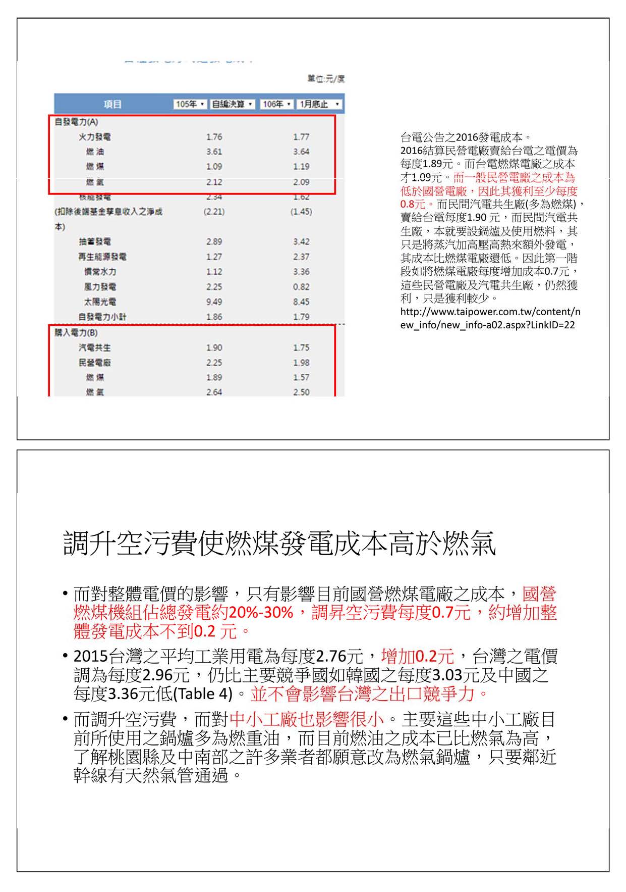至於它的成本,其實我也有算過,電價大概只增加2毛錢而已,因為現在是燃煤機組,如果空污費增加,我們的電價會增加2毛錢,這對我們國際競爭力的影響,以電費來說還是低於中國和韓國,對經濟的影響有限,而且多了這1,000億元之後,我們還可以創造新的產業。
