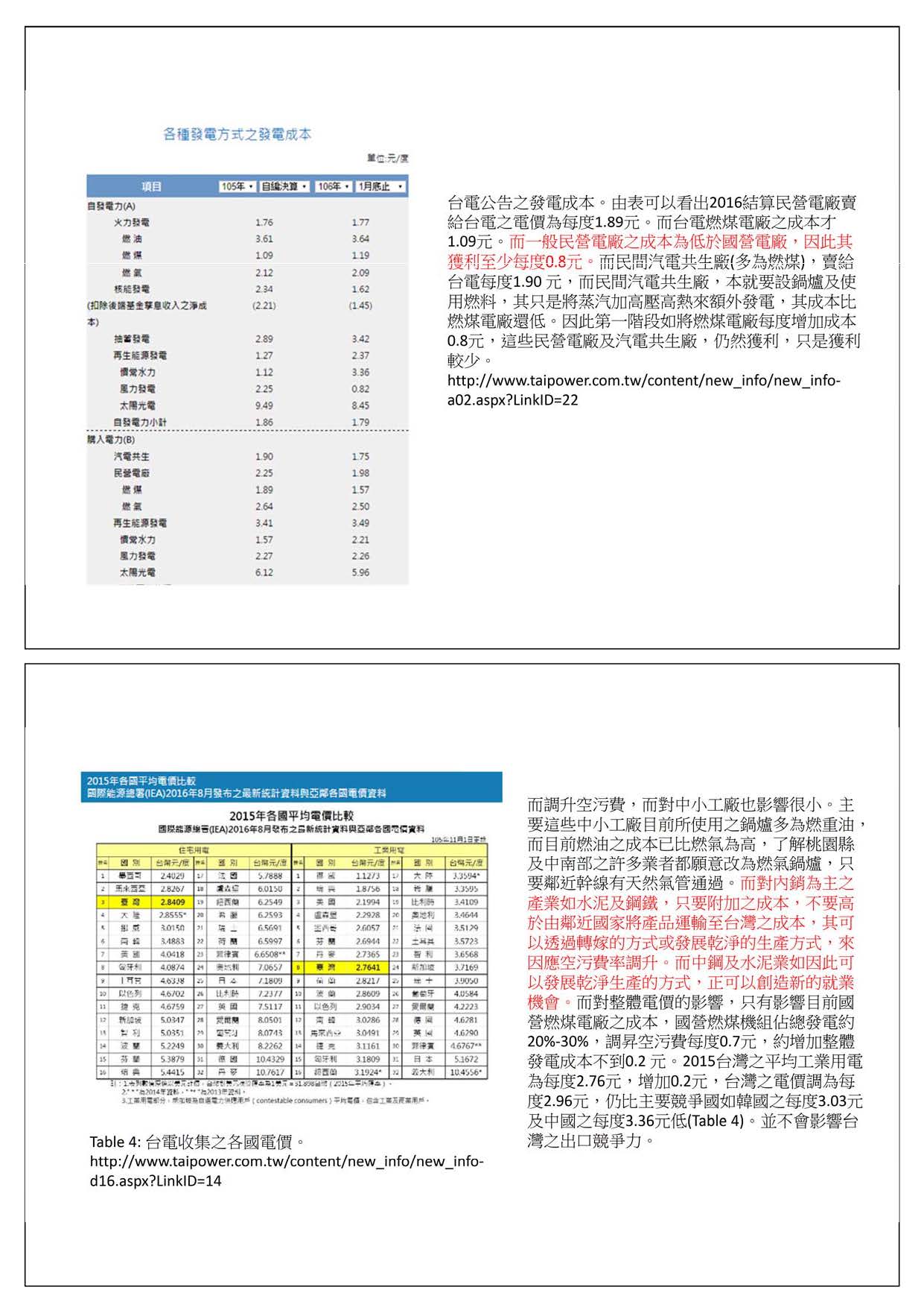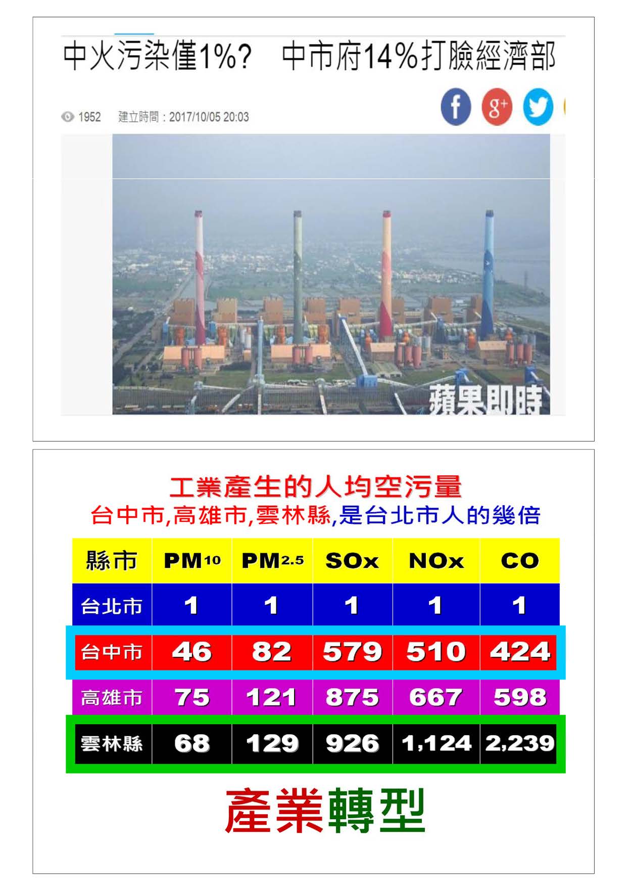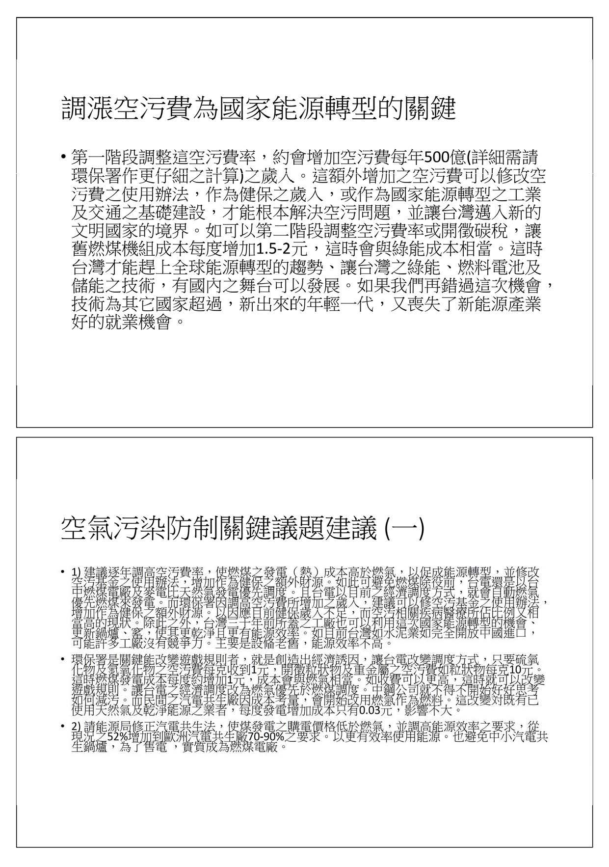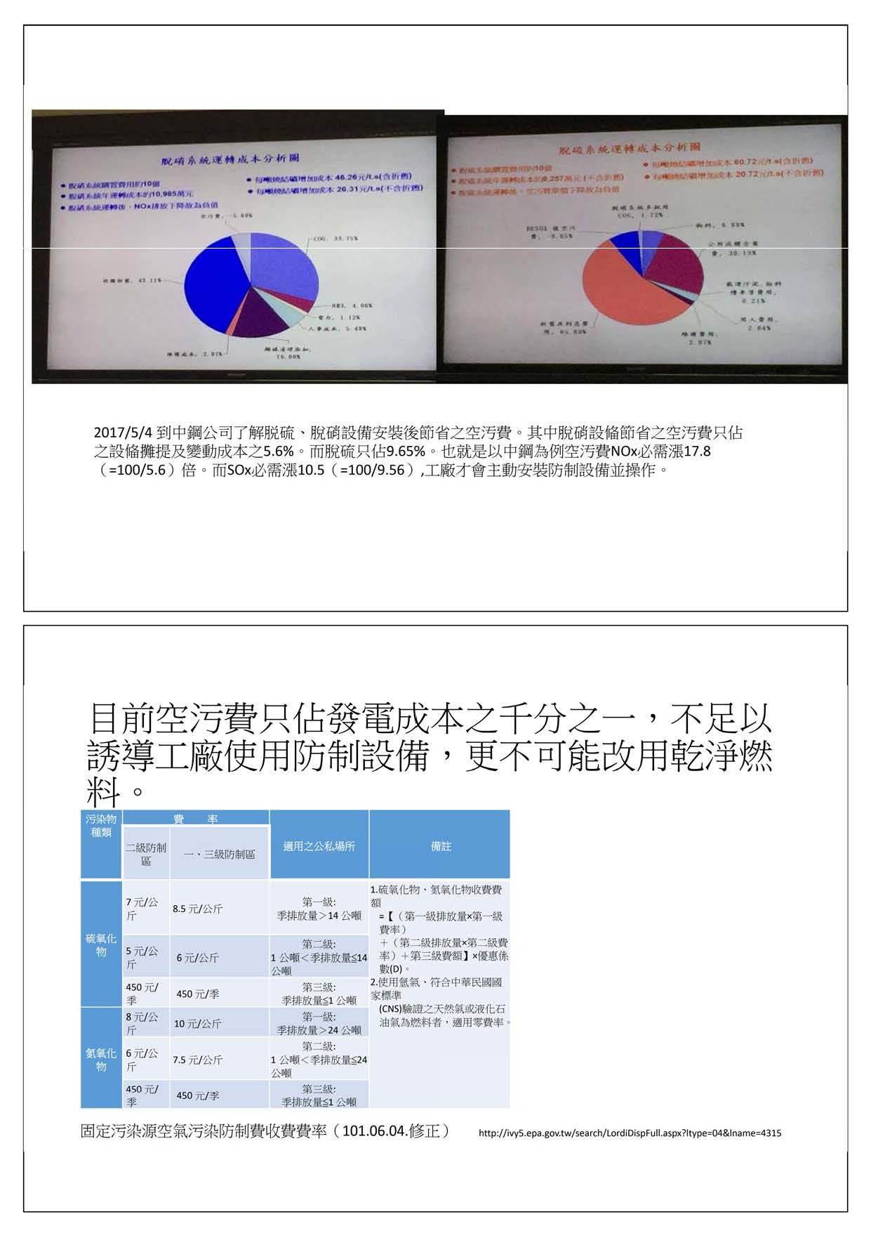 至於它的成本,其實我也有算過,電價大概只增加2毛錢而已,因為現在是燃煤機組,如果空污費增加,我們的電價會增加2毛錢,這對我們國際競爭力的影響,以電費來說還是低於中國和韓國,對經濟的影響有限,而且多了這1,000億元之後,我們還可以創造新的產業。