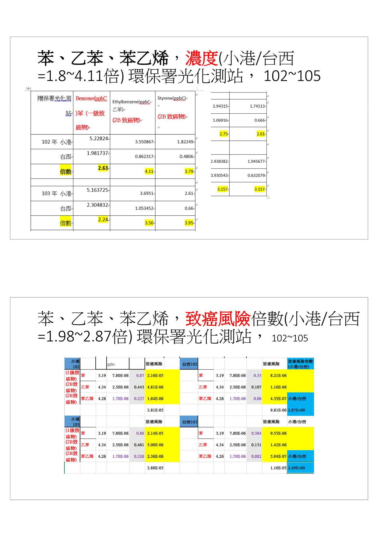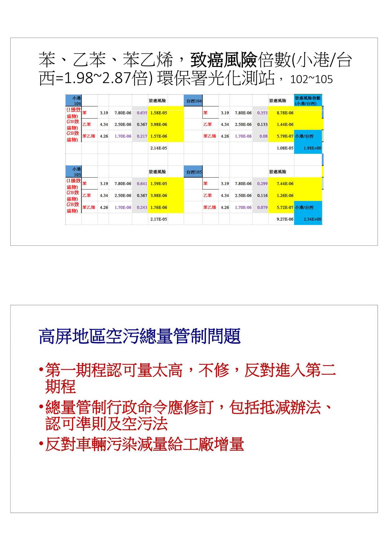 空污法二十幾年才修一次,環保署今年願意修,我個人還是抱持感謝的態度。本人現在僅針對空污法有關總量的問題加以說明,其他部分再以書面提供。總量部分現在高屏在試辦,但是包括空污法母法和行政命令等相關法規都有一些問題,譬如天花板設在高屏,這樣不合理,剛剛有人提到模式模擬的問題,就是現在不能用大天花板,而是應該採用各個工業區都做一個天花板的概念,所以就是用健康風險評估來訂定總量,而且是各個工業區的總量。為什麼要這樣講?因為從癌症死亡率的相關報告,我們可以看到林園、前鎮、旗津、小港比整個高雄多很多;從環保署光化測站的數據,我們也看到小港的苯、乙苯和苯乙烯的平均濃度大概都是臺西的1.8至4.11倍,致癌風險算起來也是他們的兩倍多。