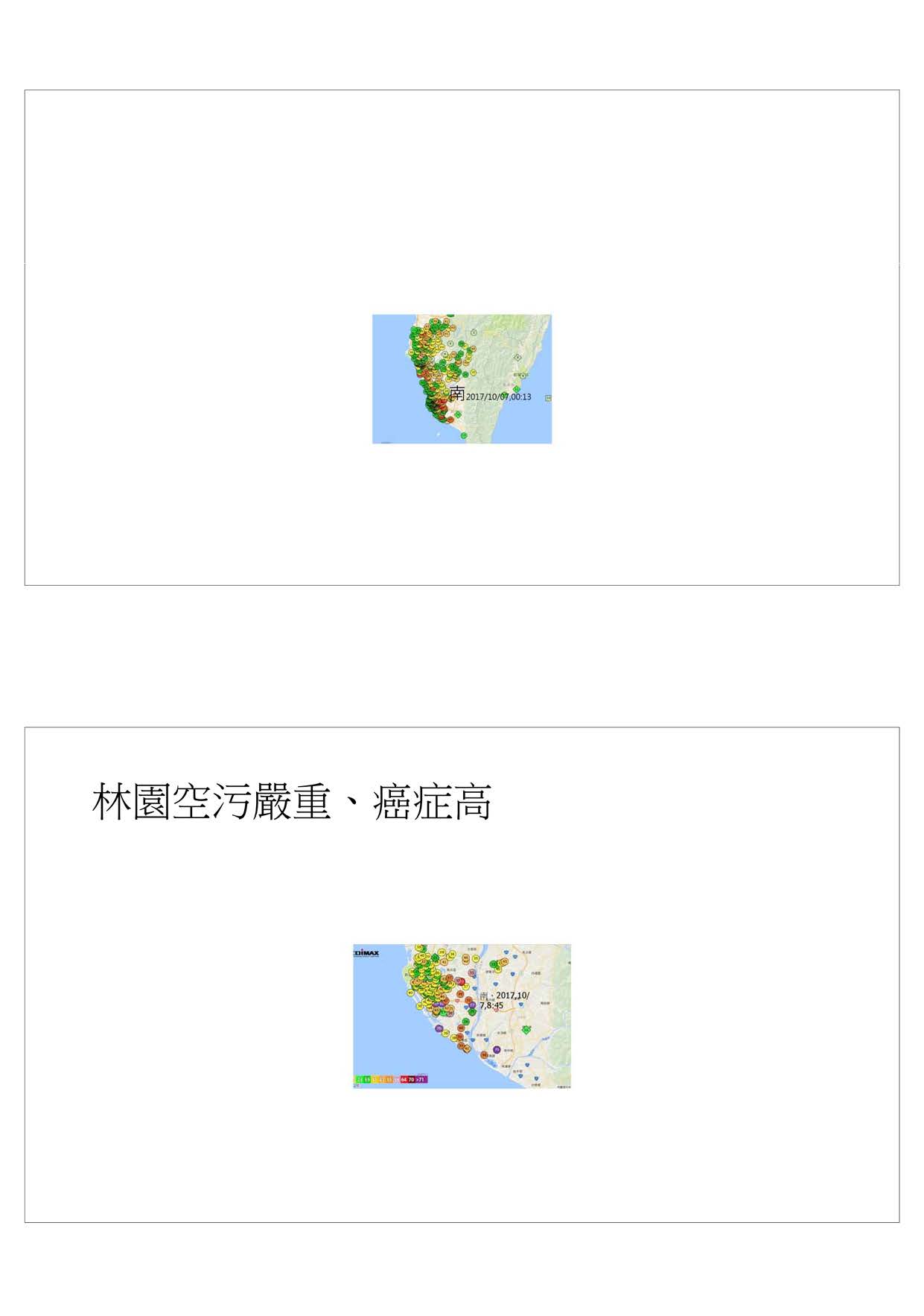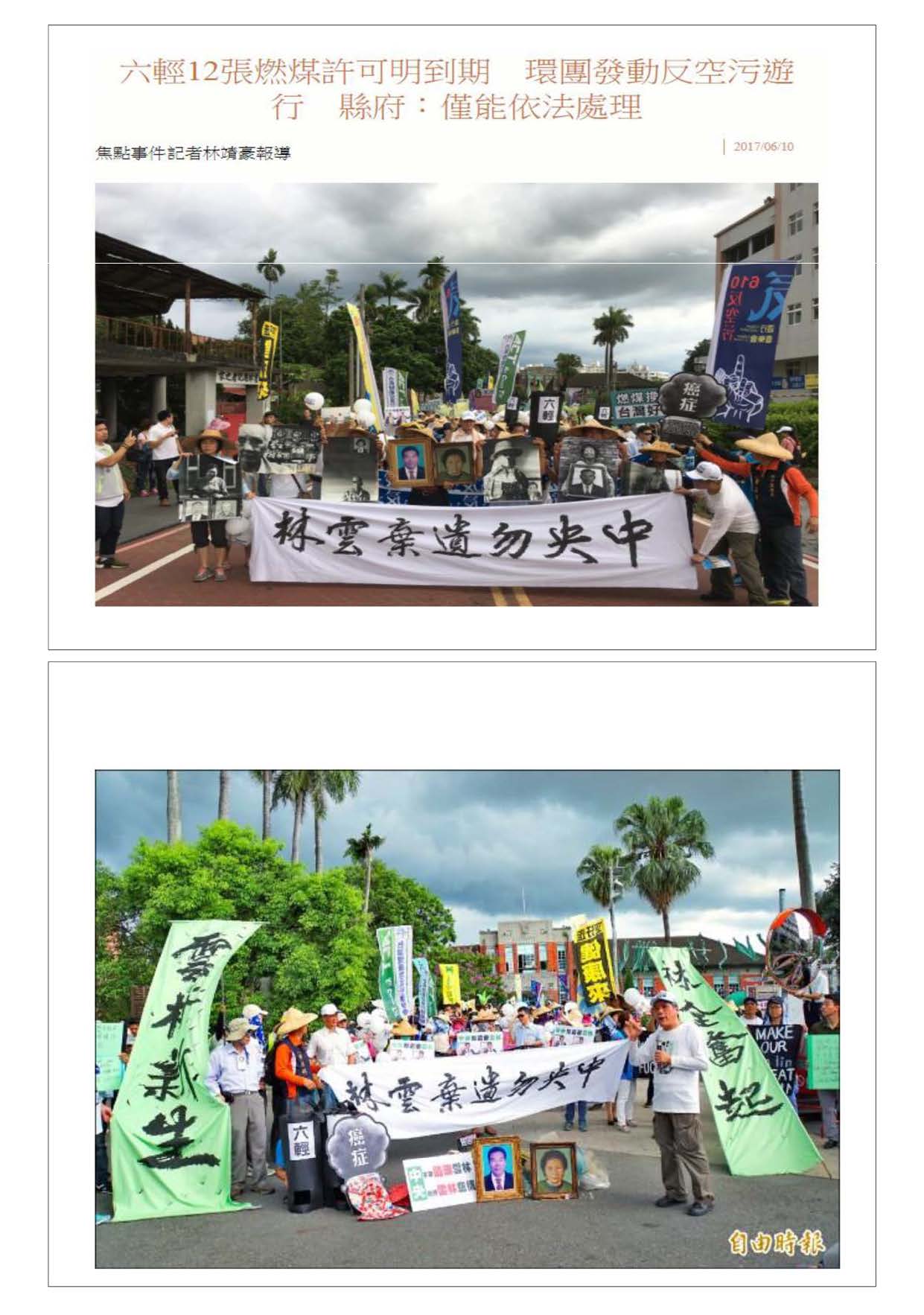 關於呼吸平權,今天我們所有的改善都是為了滿足這件事,國民黨執政的時候,大家要求中央政府重視地方,現在是民進黨執政,中央政府有重視地方嗎?因為經濟部次長說中火影響空污「微乎其微」,所以才會挨批沒人性,如果不重視健康平權,沒有終結空污,我們的法律修正如果沒有往這個方向走,一切都是沒有意義的。所以產業轉型、能源轉型是很重要的,拜託大家一定要重視,如果沒有滿足這些條件,中南部一定會因為空污革命,今天中南部的民意能夠支持你們上台,反之也會讓你們下台。這張簡報是呼籲中央勿遺棄雲林,署長是雲林人,這是今年提出的訴求,他們呼籲中央勿放棄雲林,希望「林全奮起、雲林新生」,現在應該是「賴揆奮起、雲林新生」,因為這樣中南部才有機會新生。