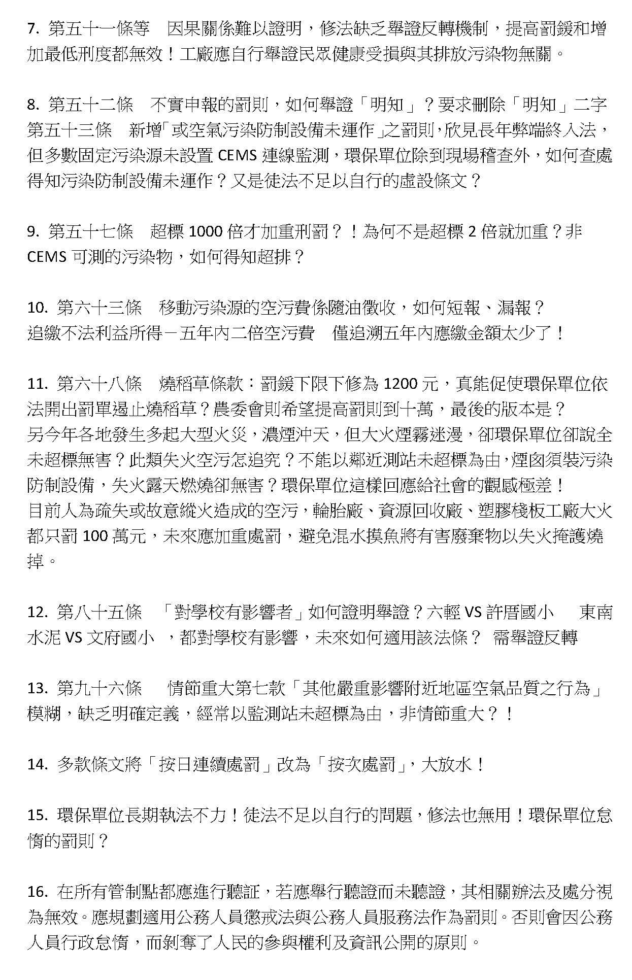 再者,第五十一條也有問題,空污的因果關係真的非常難以證明,所以法律才要納入舉證反轉的機制,讓污染源證明自己跟民眾、附近小學的傷害沒有關係,而不是要民眾舉證。另外,很多都沒有空污防制設備,其實許多都是故意不開,為了省錢,這個弊端應該處理。