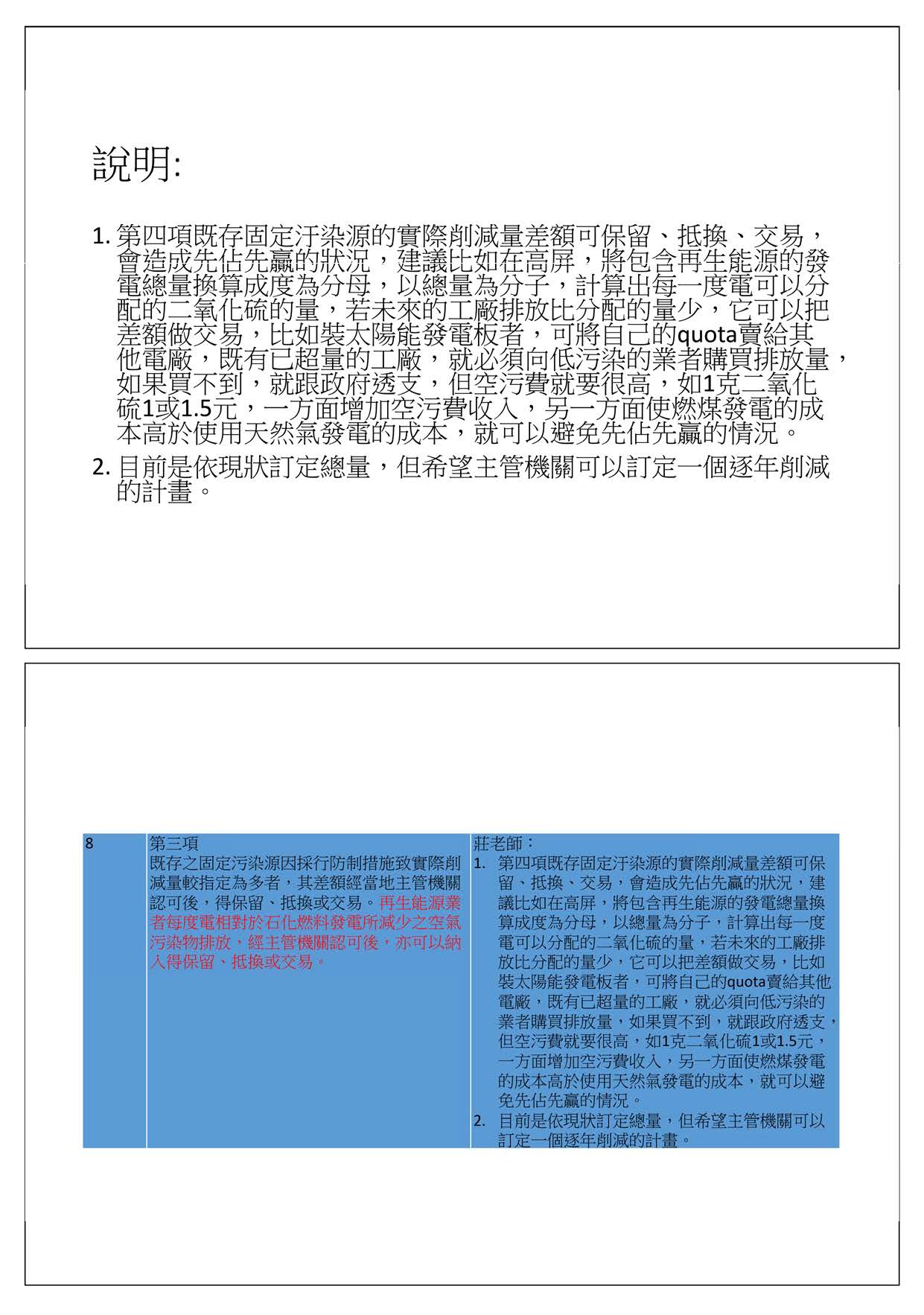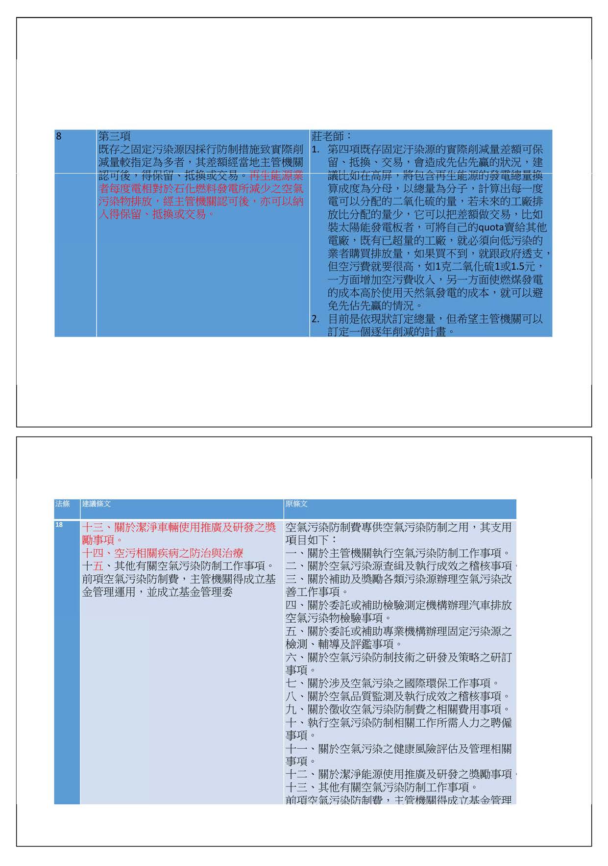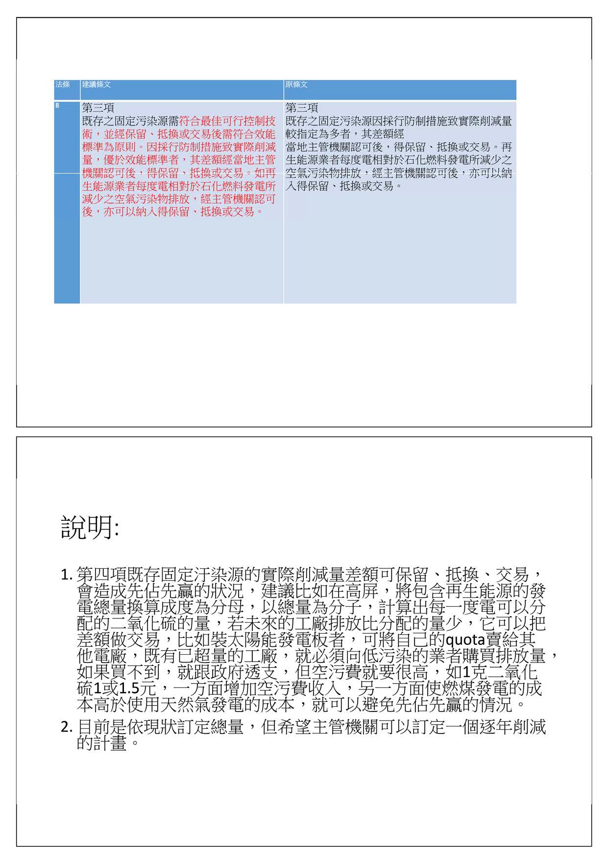 接下來是關於總量管制的分配原則,目前既有的分配原則是先占先贏,建議將條文修改成「既存之固定污染源需符合最佳可行控制技術,並經保留、抵換或交易後需符合效能標準為原則。」,也就是說,在總量管制區的固定污染源要先符合DACT,其次,像燃煤電廠的DACT可能是個數字,它除要符合DACT以外,還要再購買再生能源的quota,像是排放二氧化氮的quota,購買之後就要符合總量管制的效能標準,以上是關於第八條第三項的建議。