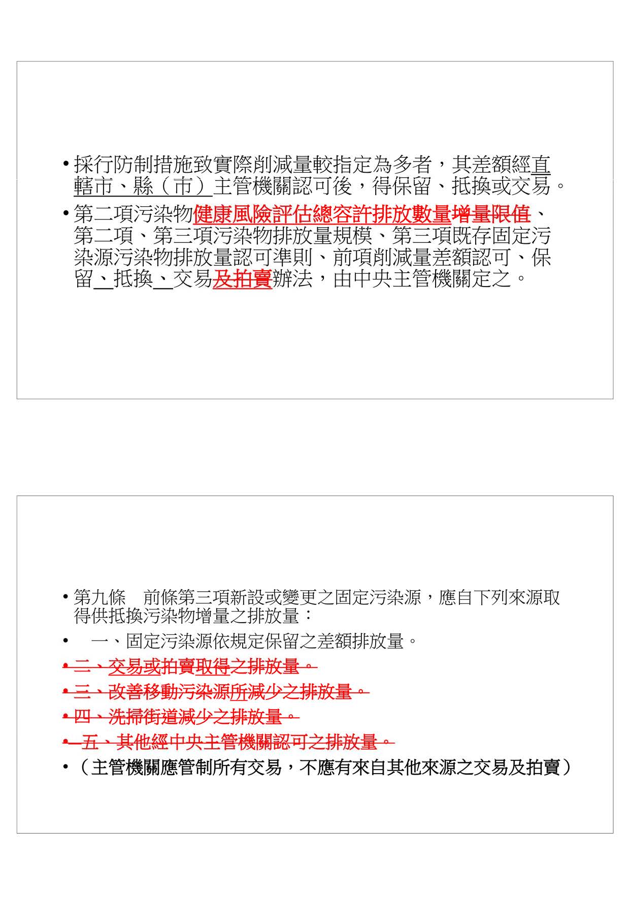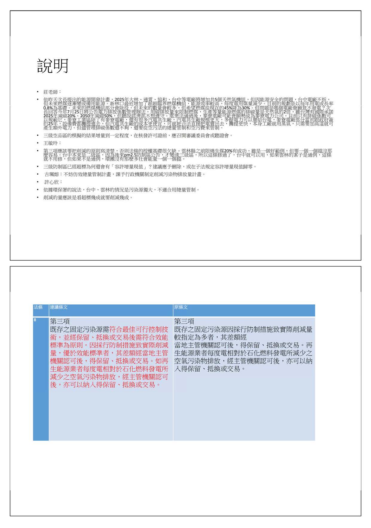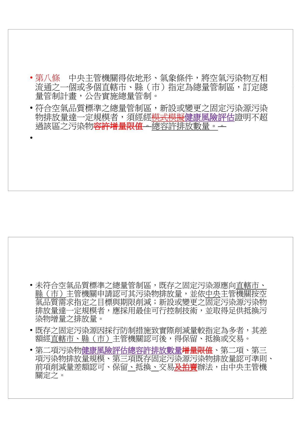 接下來是關於總量管制的分配原則,目前既有的分配原則是先占先贏,建議將條文修改成「既存之固定污染源需符合最佳可行控制技術,並經保留、抵換或交易後需符合效能標準為原則。」,也就是說,在總量管制區的固定污染源要先符合DACT,其次,像燃煤電廠的DACT可能是個數字,它除要符合DACT以外,還要再購買再生能源的quota,像是排放二氧化氮的quota,購買之後就要符合總量管制的效能標準,以上是關於第八條第三項的建議。