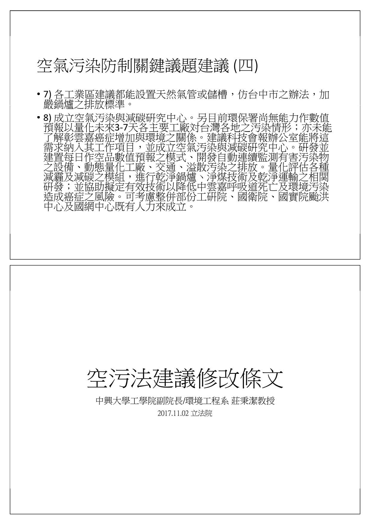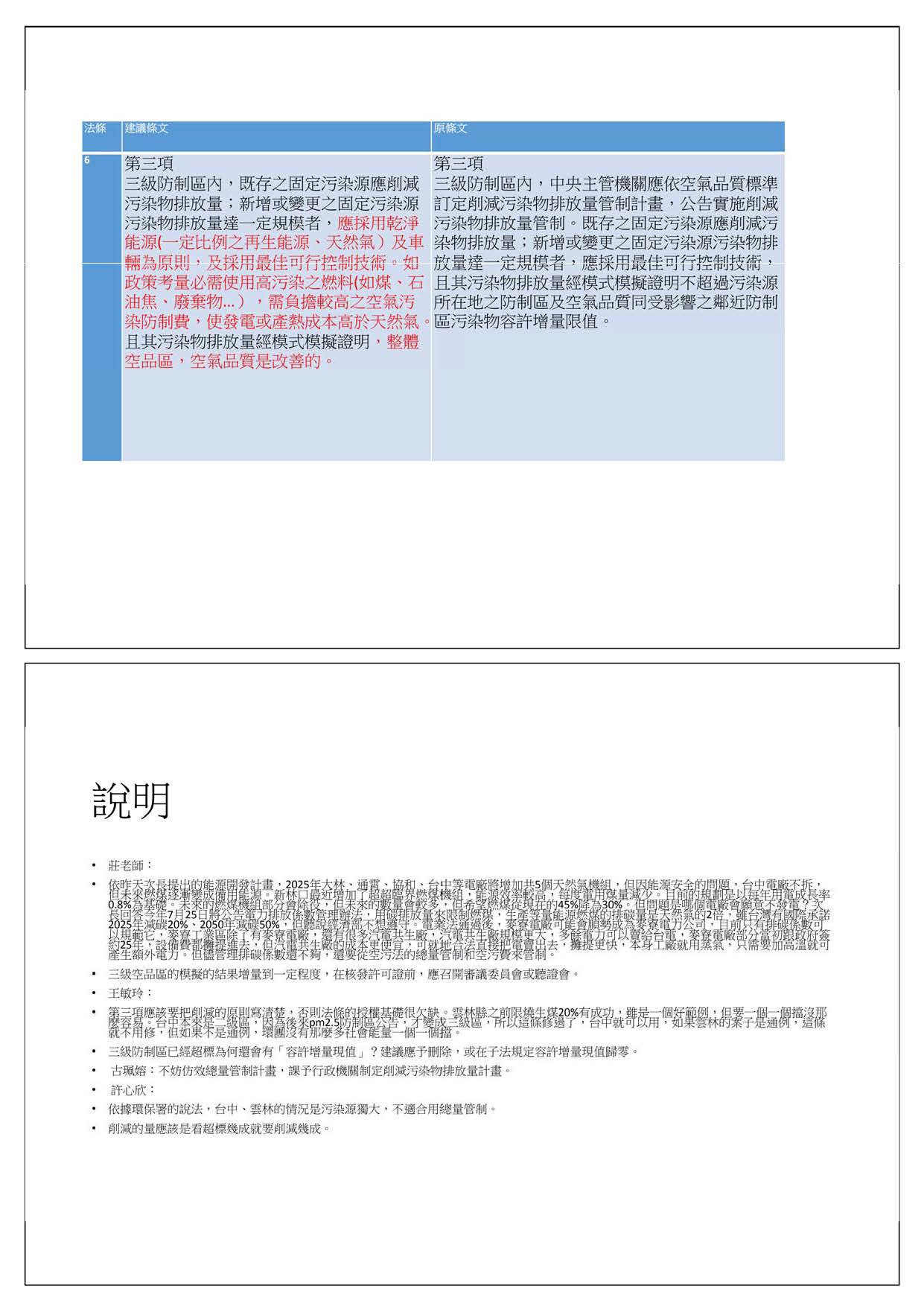 莊秉潔教授:主席、各位委員。剛剛副署長有回應我的建議,就是加上一個效能標準。另外剛剛提到詹老師有建議說無煤、無油,其實在我剛剛的第六條第三項有這個建議,就是在三級防制區如果要新設一些工廠的話,它基本上要用乾淨燃料,所以其實已經有一點無煤、無油的概念擺在三級防制區裡面。