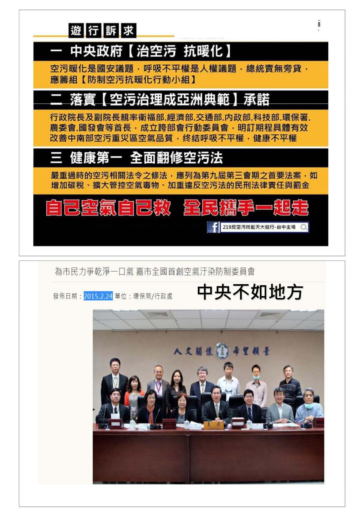 賴清德是做實事的人,他的理念是「清廉、勤政、愛鄉土」,但是我們如果問到如何落實空污防制,你們就說這個問題應該跨部會處理,當時賴副署長也有到臺中,他說會跨部會處理,陳吉仲也是這麼說。嘉義市2015年2月24日已經成立空氣污染防制委員會,這是市長主導的,臺中市也是由市長帶頭批評,但是行政院還在混,而且已經混很久了,到現在經濟部還說那些話,所以林佳龍出面和他們對打,這件事已經溝通兩年了,到現在還在混。