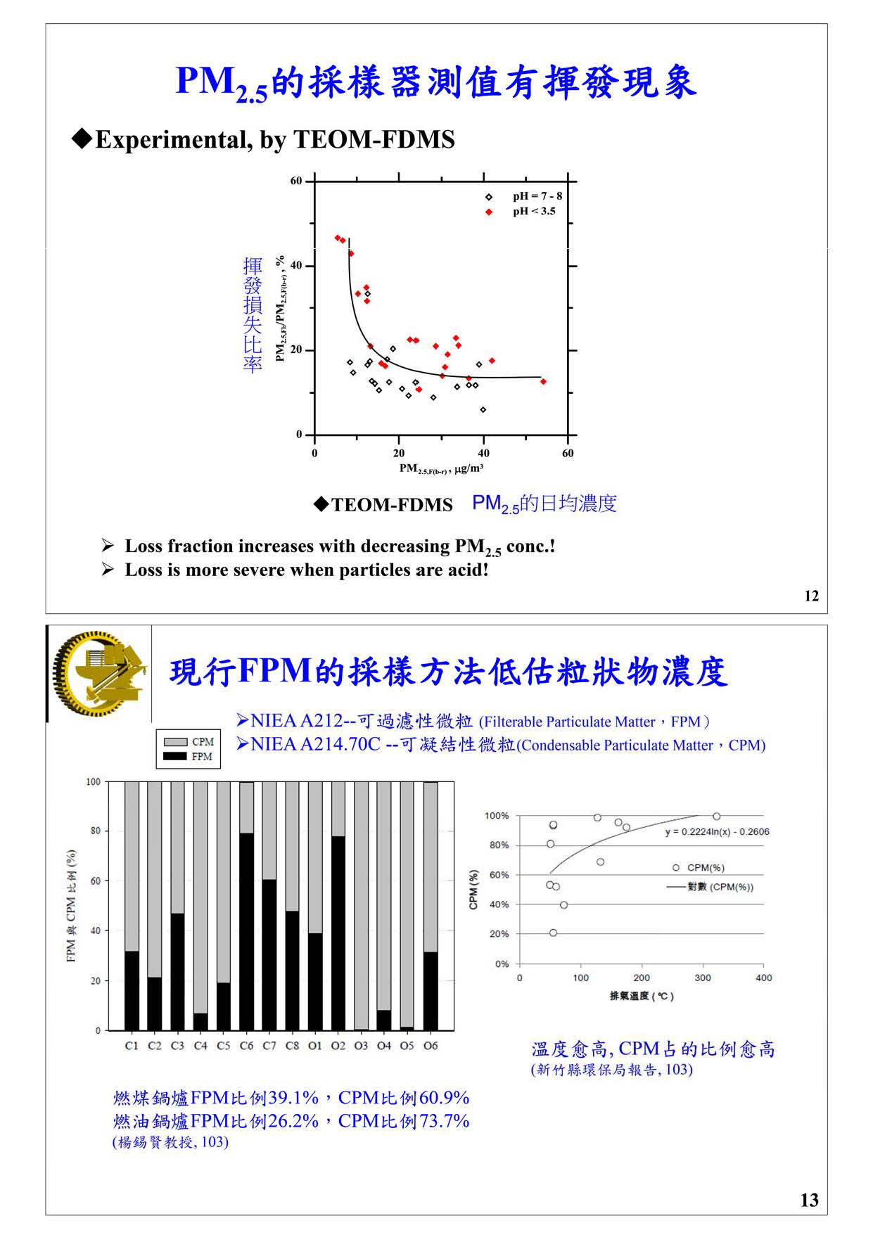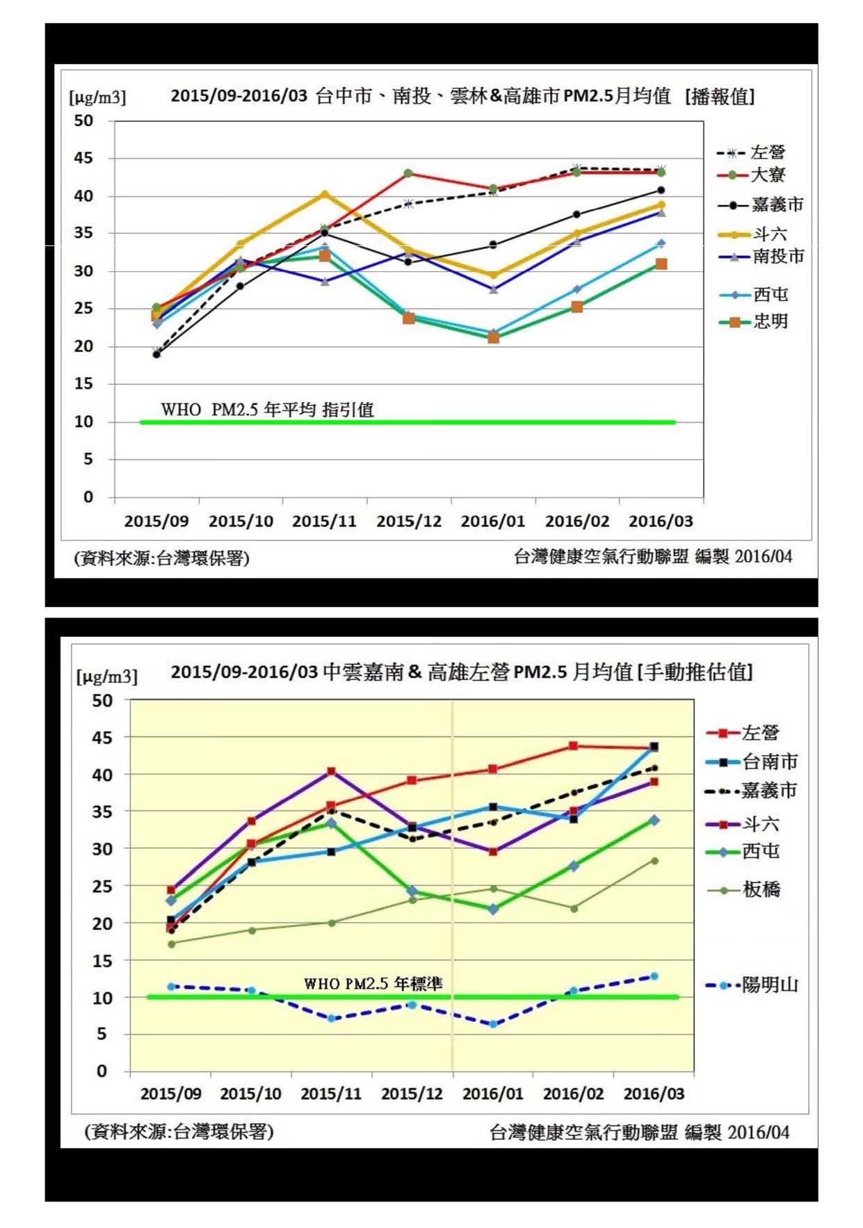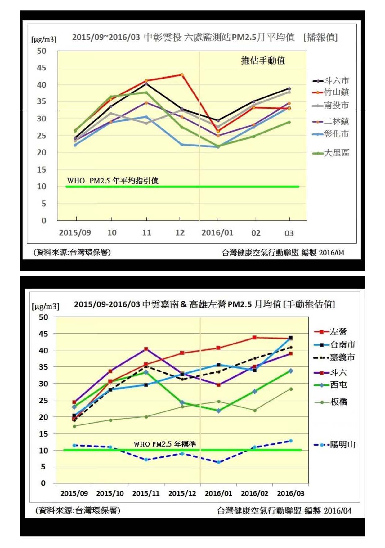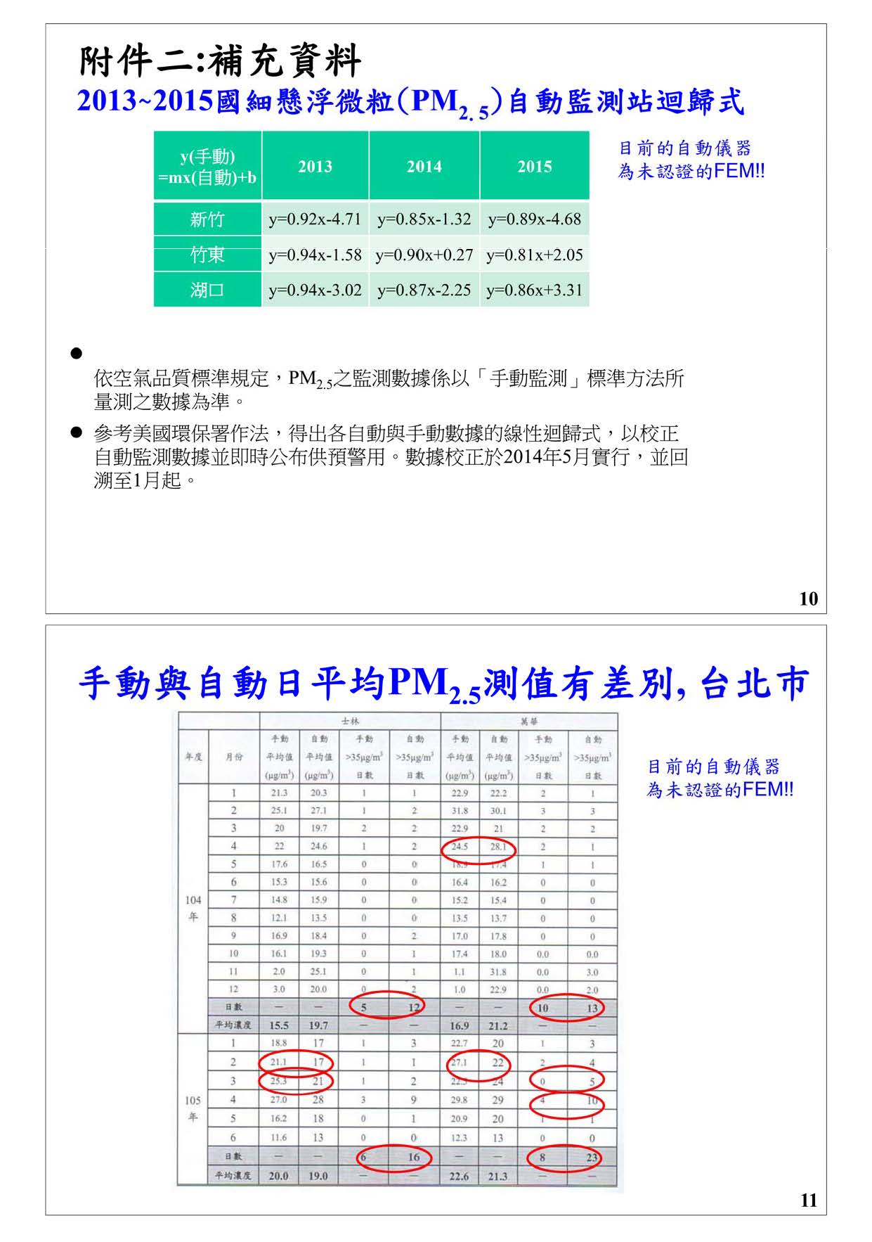 再來是PM2.5用自動監測設備,但是我們的法規卻規定一定要用手動,所以自動監測出來的數據還要經過一個公式回歸、修正,往下降到跟手動差不多的情形,結果那個嚴重性就被低估了。這是我們覺得應該檢討的部分。