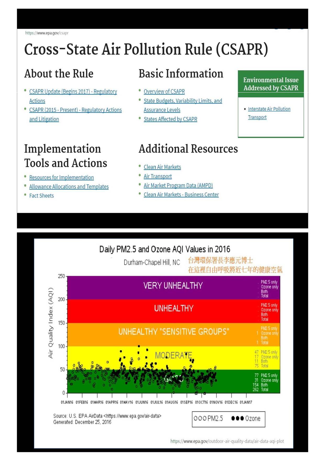 我要告訴各位,我們的環保署長在Chapel Hill唸書念了7年;我在UC Berkeley念了快5年,也是很差勁。那邊的空氣很好,達到橘色等級的不多,紅色等級的完全沒有。此外,他還在哈佛唸過書,那邊的空氣也很好。