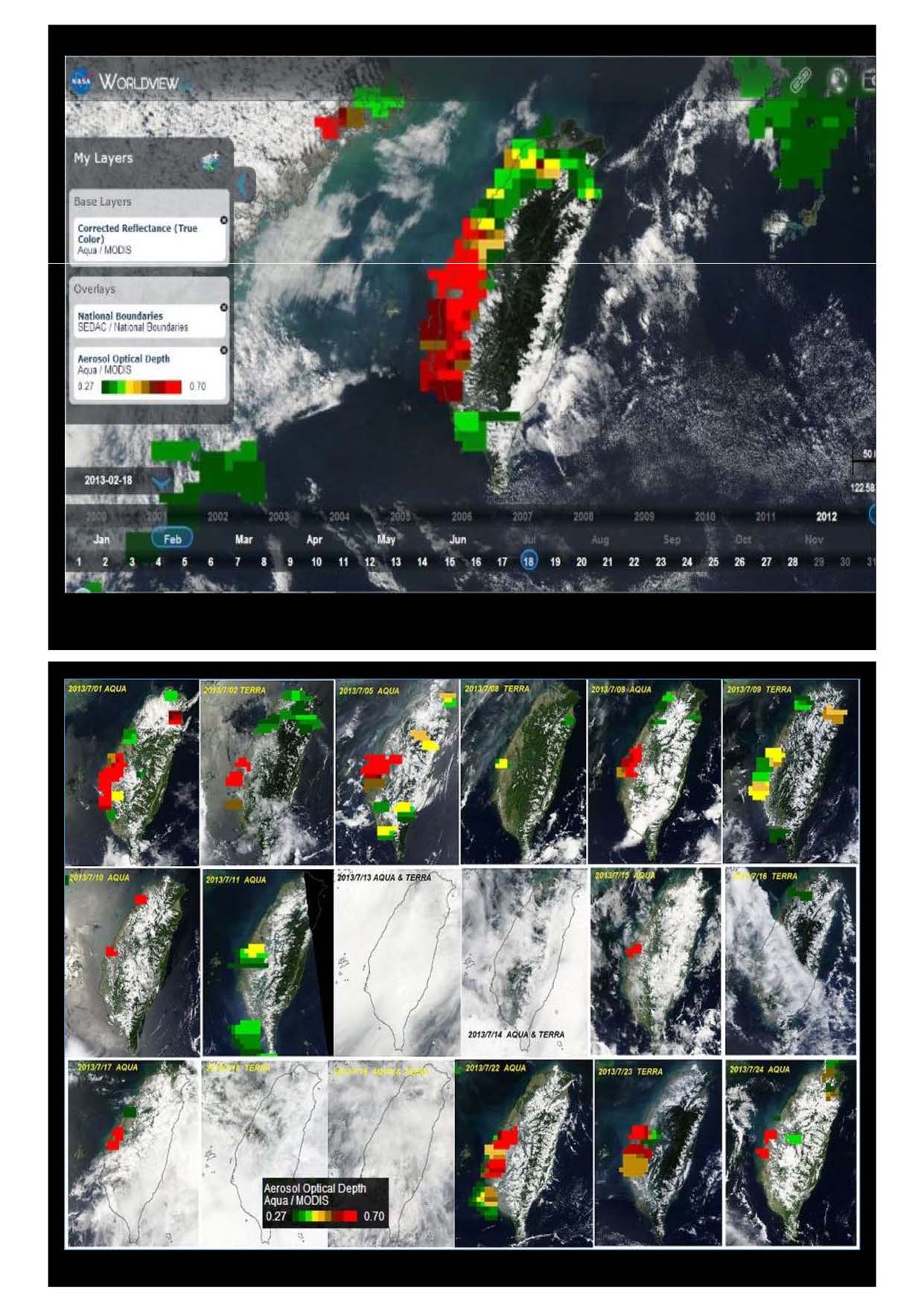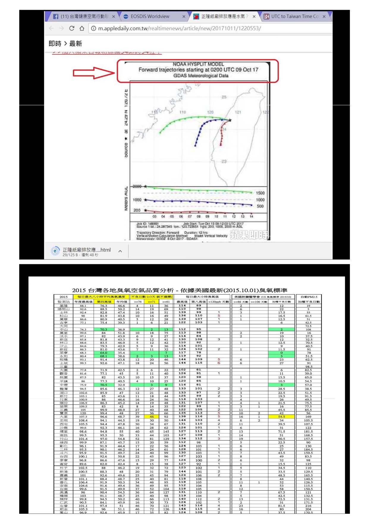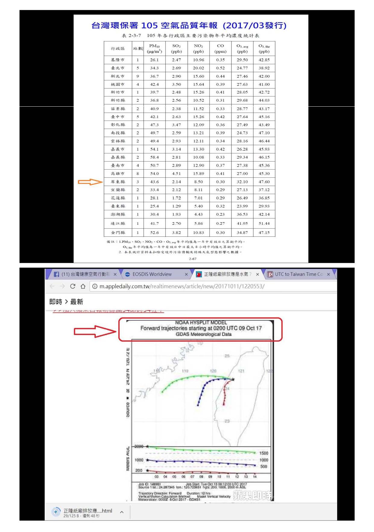 更荒謬的是下一張圖,我不若鄭明典主任那麼重要,為了鄭明典,立法委員還質詢交通部,把他修理一頓。請大家注意看這張圖,鄭明典的圖是10月8日臺中的卷雲或空污圖,我不曉得,那個自有專家鑑定,我只看空氣污染。同一天我比他更早看到,我專門看空氣污染,而不看卷雲,因為雲層太多,空氣污染就看不到,無法分析。請各位注意看,這張圖的時間是October 9(10月9日), 2017。正隆紙廠說不是他們排放的,環保署沒有請內部很多偉大、學有專長的公務員做分析,而要請學界的人來幫他背書。可惜!這張圖的時間是0200 UTC,轉換成臺灣時間要加8小時,而鄭明典那一張圖是10月8日,各位懂我的意思嗎?環保署是不是看不懂英文?以前我就有批判過環保署的英文網站根本亂七八糟!可能是用Google Translate吧?「每日平均」還翻譯成Average Japanese(平均的日本話、日本人)。以上,謝謝。