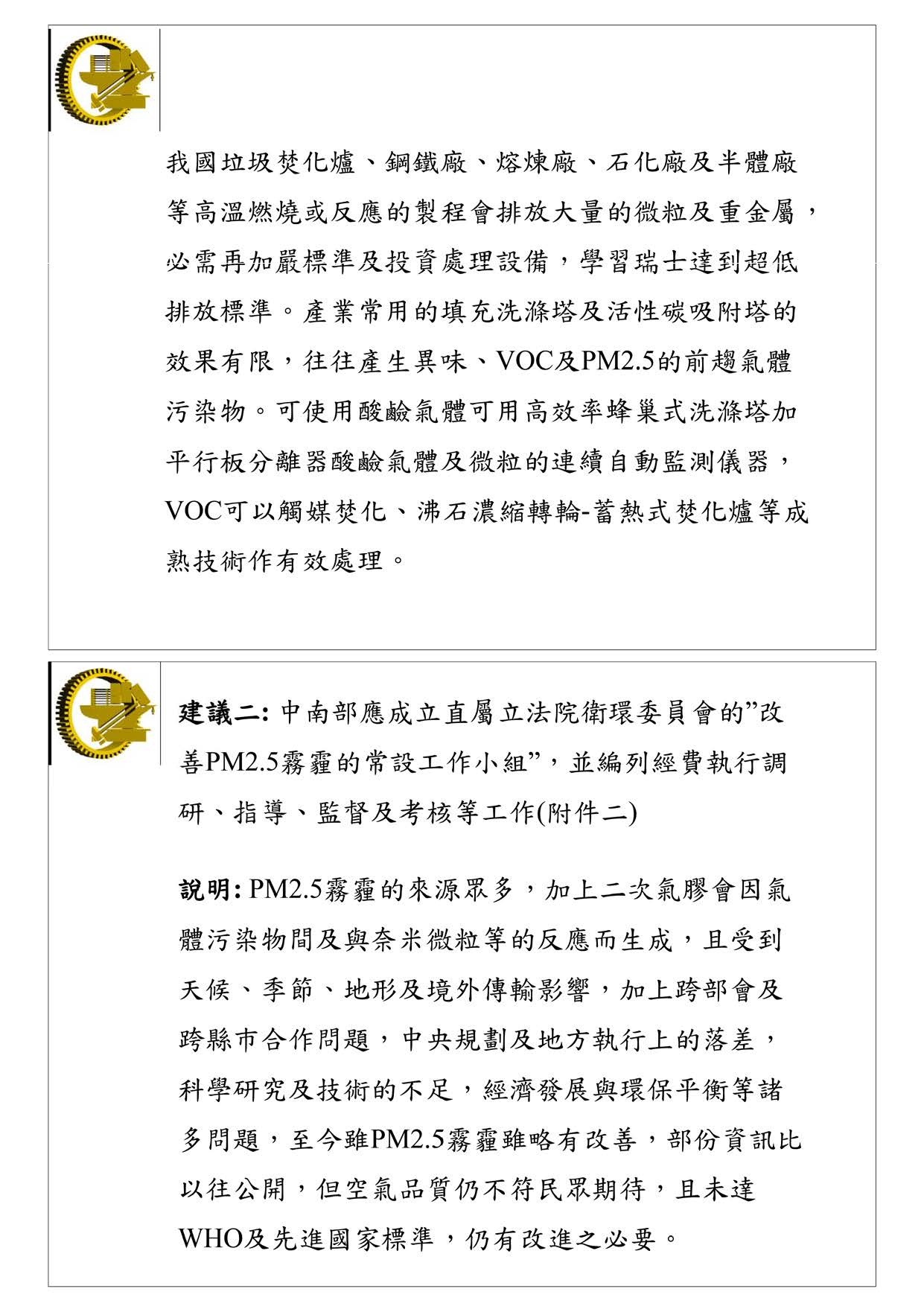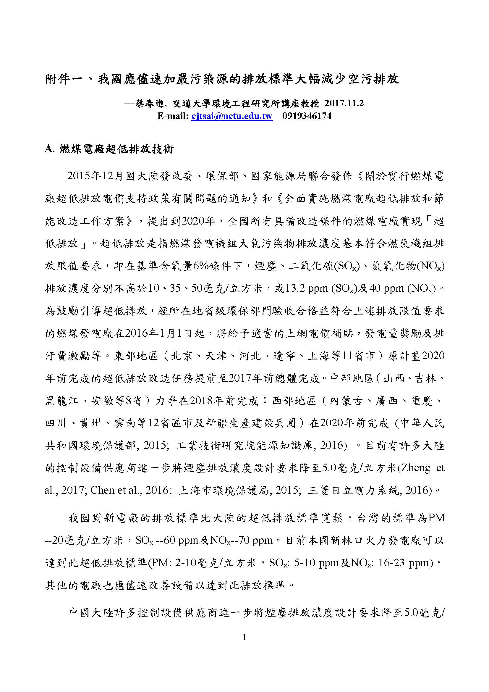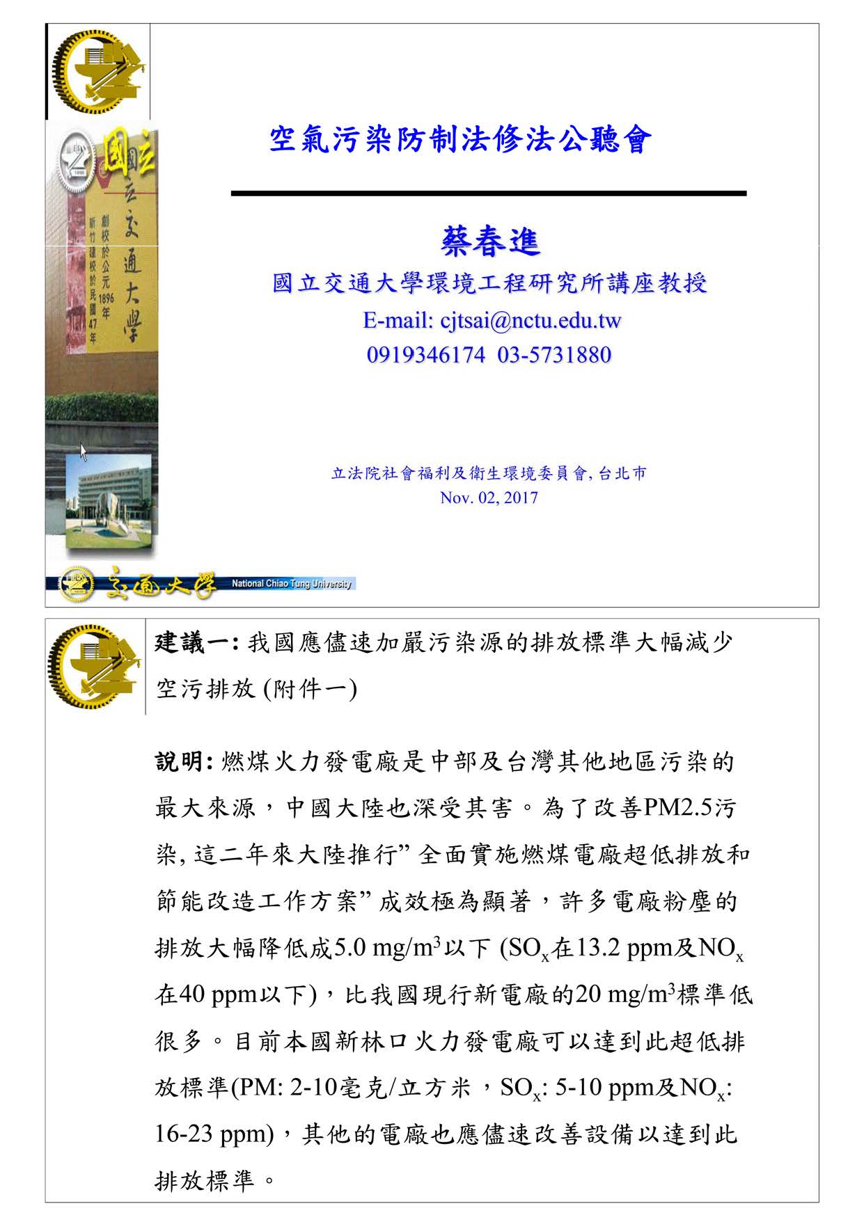 蔡春進講座教授:主席、各位委員。今天很榮幸花五分鐘的時間來報告我準備的建議事項。我的建議比較具體一點,1、我覺得目前的排放法令還不夠嚴格,這兩年大陸燃煤火力發電廠以及瑞士有比較先進的作法,我把相關作法列在附件裡,他們訂有一個超低排放標準,我比較一下我們台灣新電廠的法令還是比超低排放標準寬鬆,而且這些排放標準都具體可行,且大部分都裝設兩套除塵設備,除了原來的靜電集塵之外,最後再過濾或是用濕式靜電集塵,所以幾乎可以做到零排放,像瑞士的焚化爐,甚至比外面的空氣品質還要好。火力發電廠的PM2.5都降到個位數,但我們現行法令是規定20ug/M3,所以其間有巨大的差別,在短時間之內我們沒有辦法改成天然氣,估計還需要6到8年,甚至2025年還有30%要用到燃煤,所以這個議題是很重要的,所以我們應該大膽採取超低排放,現有排放的不是只有燃煤電廠,所有燃燒的污染源都會排放,像我們的垃圾焚化爐、鋼鐵廠、半導體廠、石化廠,都應該採取超低排放,盡量做到最好,而具體可行的方法在我所提18頁的附件裡面都有,包括用哪些技術也都列明,有些是本土開發的,有些是大型國外公司像是Mitsubishi、大陸的飛達公司,此外台灣也有很多廠商在做,但是經濟部所提出的標準還是不夠,譬如其提出台中電廠更新所達到的標準還是不夠低,一樣會造成問題,甚至它所採用的技術也有點問題,其所採用的是移動式電極板的ESP,這在維修保養上有很大的問題,所以有很多事情我們必須積極因應。
