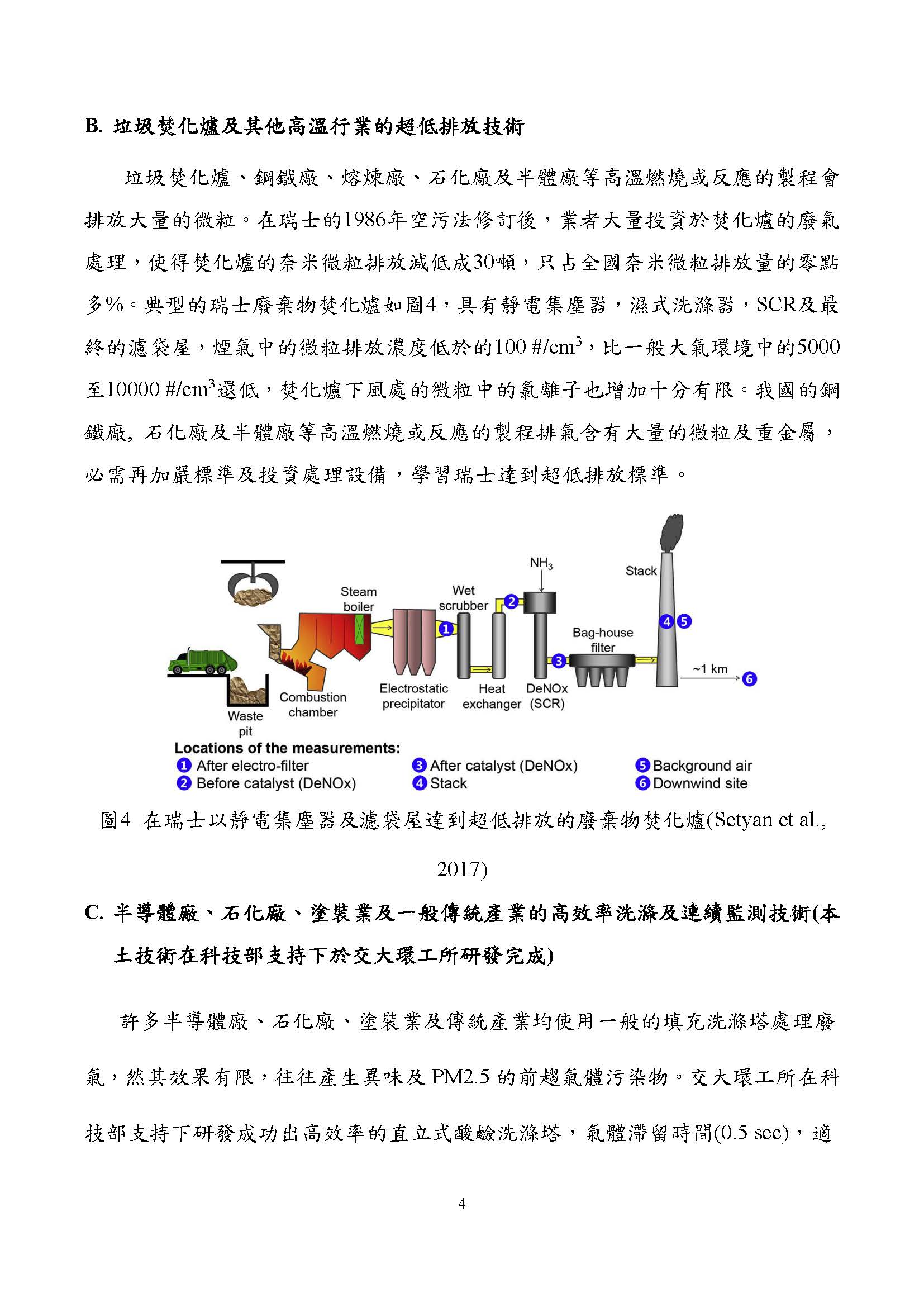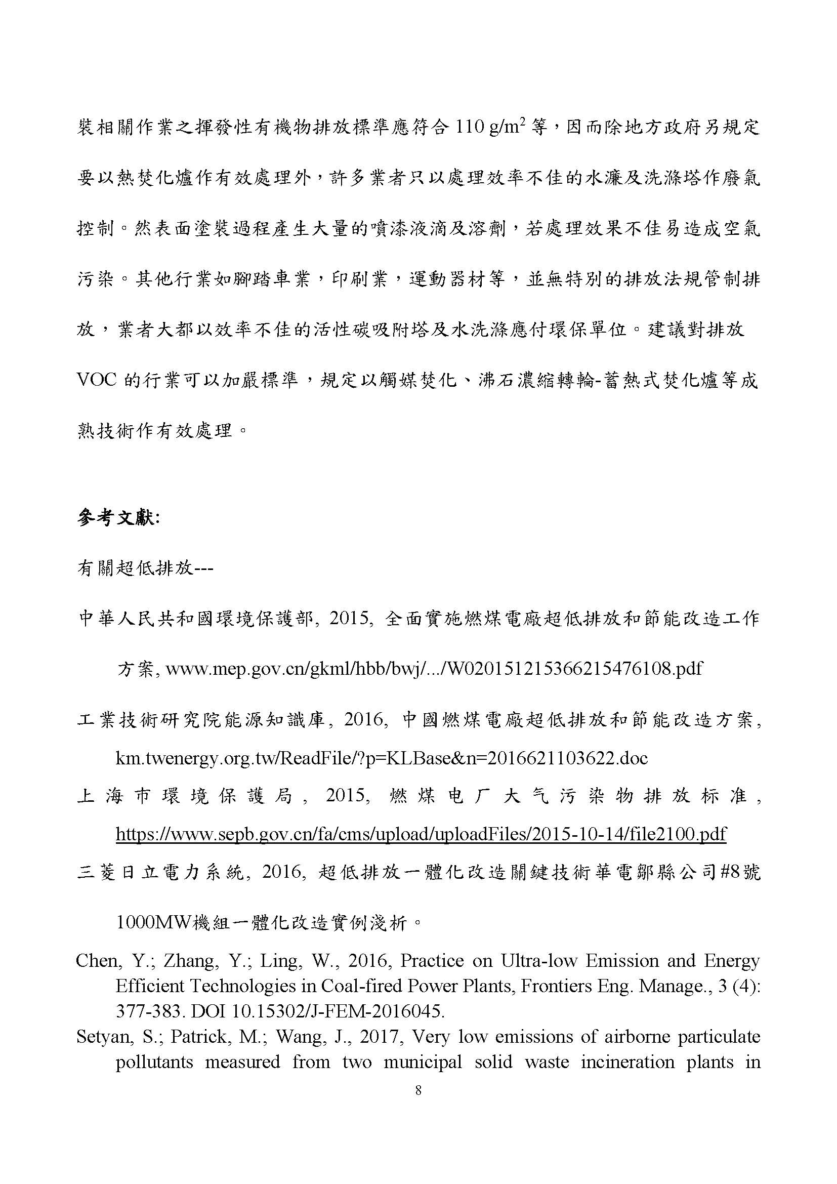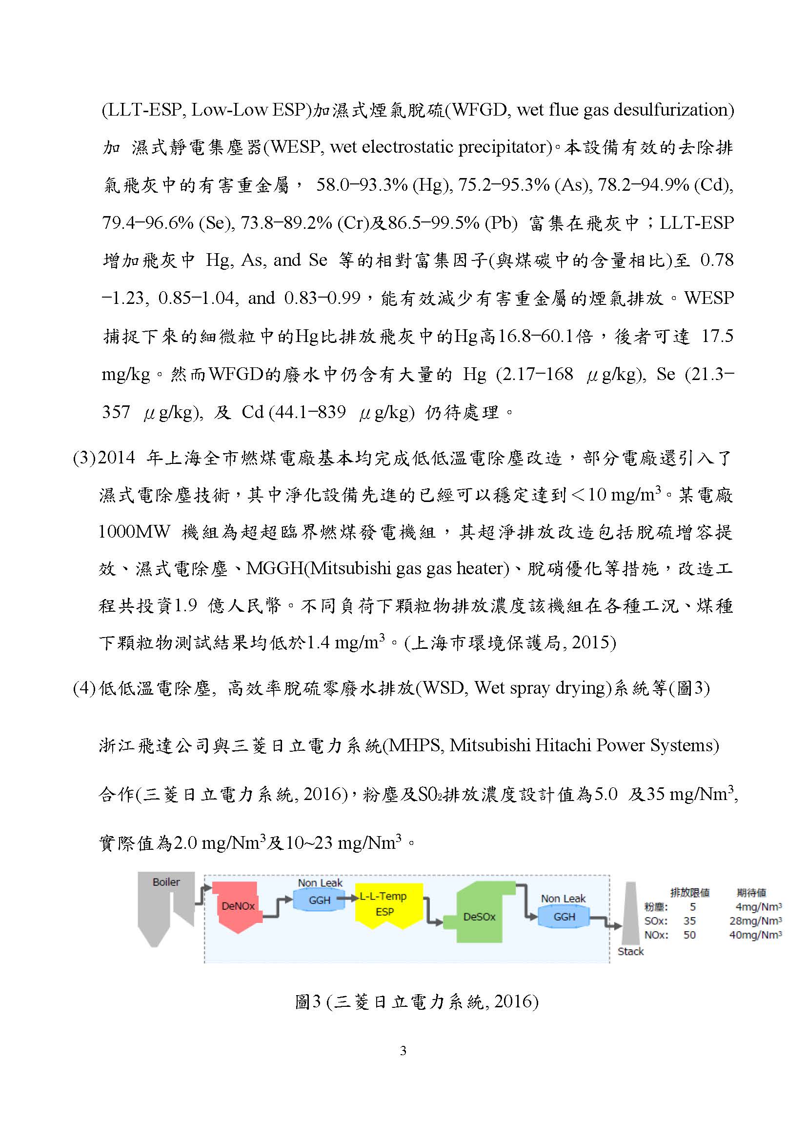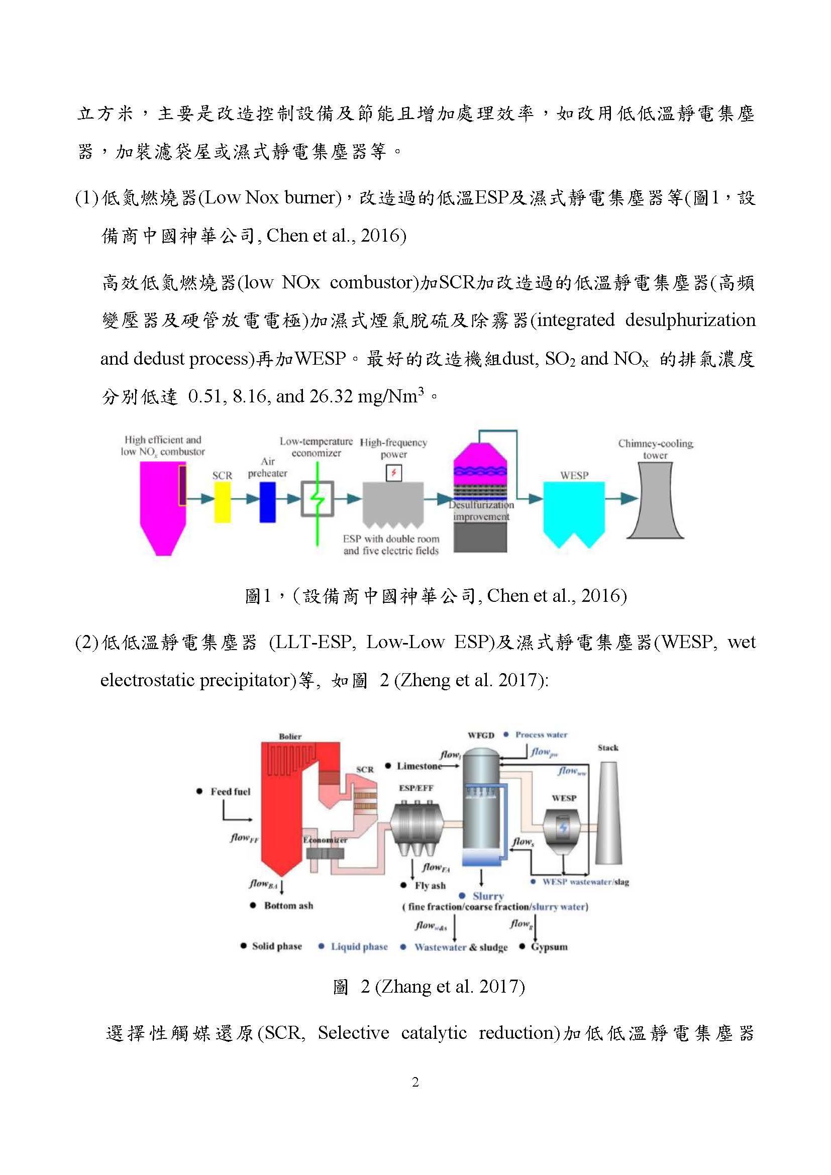 蔡春進講座教授:主席、各位委員。今天很榮幸花五分鐘的時間來報告我準備的建議事項。我的建議比較具體一點,1、我覺得目前的排放法令還不夠嚴格,這兩年大陸燃煤火力發電廠以及瑞士有比較先進的作法,我把相關作法列在附件裡,他們訂有一個超低排放標準,我比較一下我們台灣新電廠的法令還是比超低排放標準寬鬆,而且這些排放標準都具體可行,且大部分都裝設兩套除塵設備,除了原來的靜電集塵之外,最後再過濾或是用濕式靜電集塵,所以幾乎可以做到零排放,像瑞士的焚化爐,甚至比外面的空氣品質還要好。火力發電廠的PM2.5都降到個位數,但我們現行法令是規定20ug/M3,所以其間有巨大的差別,在短時間之內我們沒有辦法改成天然氣,估計還需要6到8年,甚至2025年還有30%要用到燃煤,所以這個議題是很重要的,所以我們應該大膽採取超低排放,現有排放的不是只有燃煤電廠,所有燃燒的污染源都會排放,像我們的垃圾焚化爐、鋼鐵廠、半導體廠、石化廠,都應該採取超低排放,盡量做到最好,而具體可行的方法在我所提18頁的附件裡面都有,包括用哪些技術也都列明,有些是本土開發的,有些是大型國外公司像是Mitsubishi、大陸的飛達公司,此外台灣也有很多廠商在做,但是經濟部所提出的標準還是不夠,譬如其提出台中電廠更新所達到的標準還是不夠低,一樣會造成問題,甚至它所採用的技術也有點問題,其所採用的是移動式電極板的ESP,這在維修保養上有很大的問題,所以有很多事情我們必須積極因應。