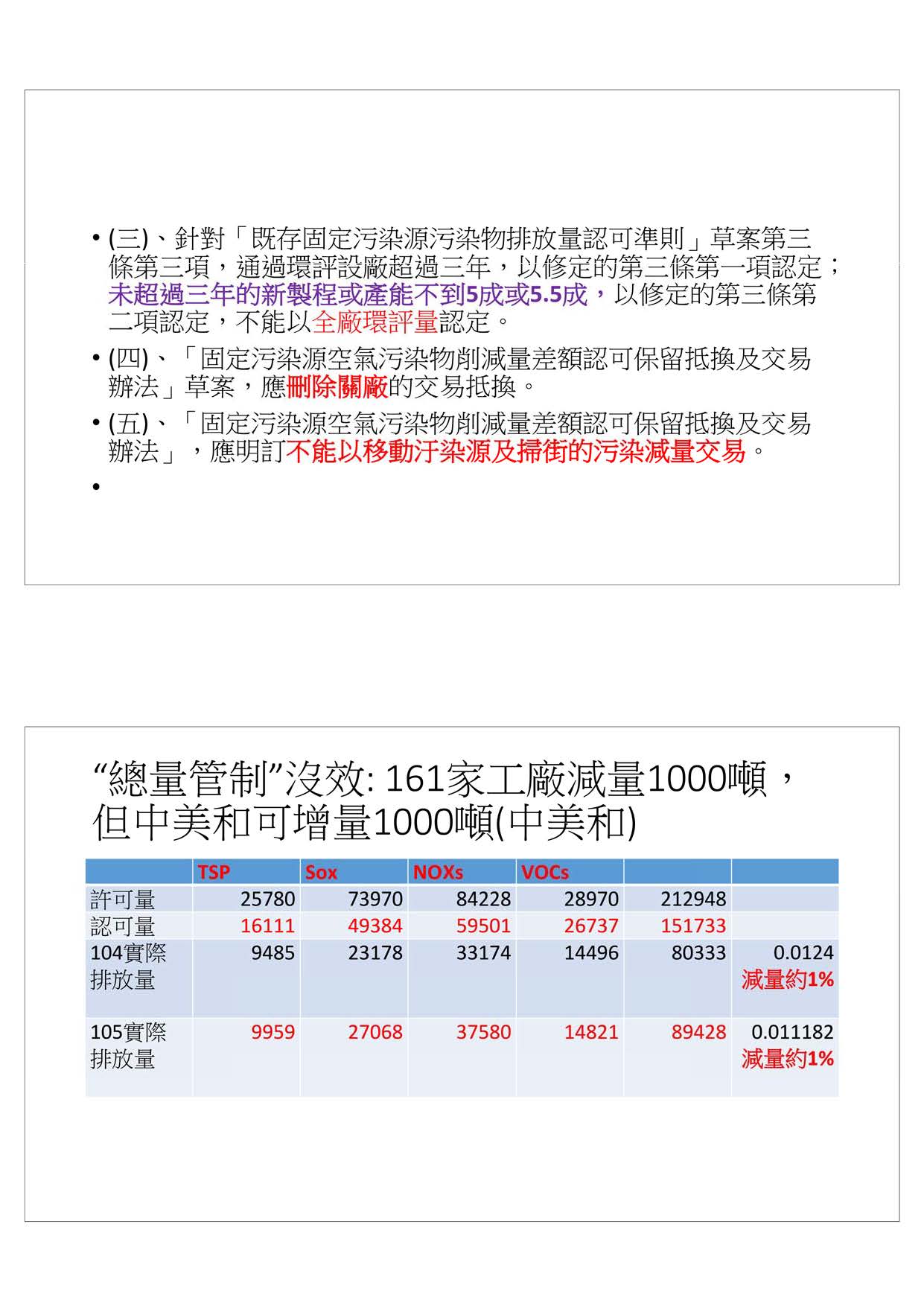 另外,關廠時不得再保留抵換交易。中美和林園廠的產能、產量沒有辦法競爭,現在遷到臺中港,結果去年高雄市環保局根據剛才說的法規,居然認為有800多公噸的空污可以抵換。剛才副處長講到他因為關廠,又要再發展新工廠的狀況,抱歉,照我的看法,那叫做排放空污的合法使用權。現狀是中油想擴廠,直接將中美和的工廠買下來,然後他也取得空污的抵換量。依我的看法,關廠後空污量一定要歸零。