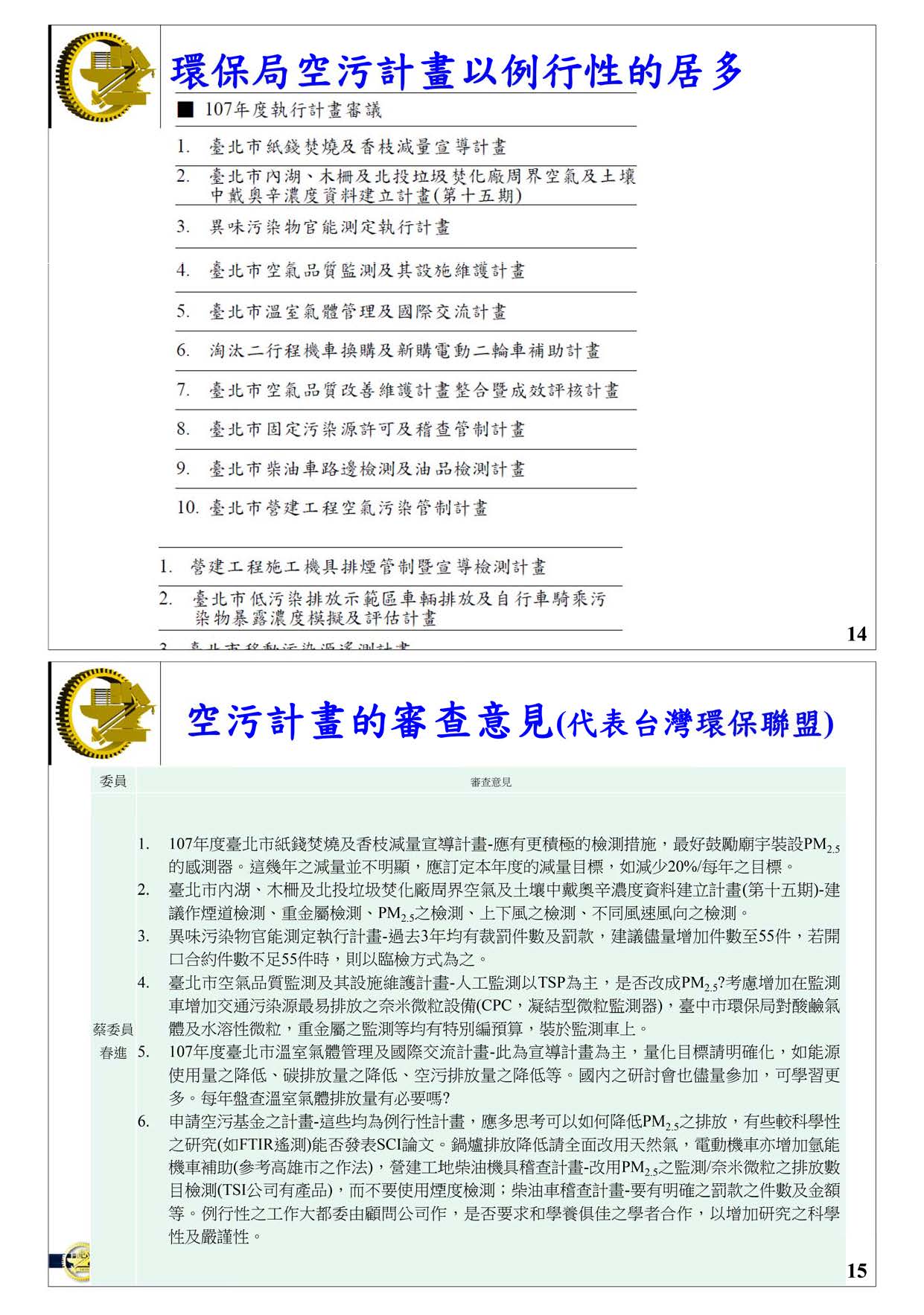 再者,南加州的移動污染源怎麼計算,目前空保處還沒有給我相關資料,所以我也不知道這個合不合理、是不是可以換在固定污染源。我希望環保署能夠好好的再召開真正瞭解的人參加的專家會議,並讓公民團體參與,這樣有比較實質的討論,如此訂定的政策才會被大家接受。