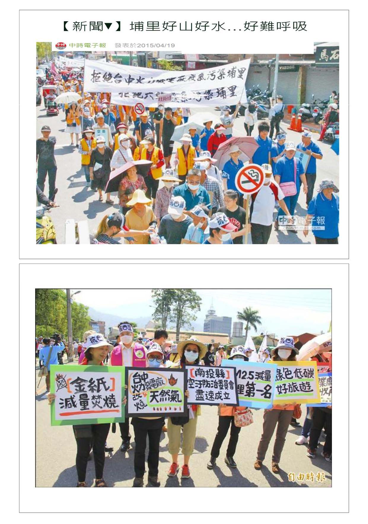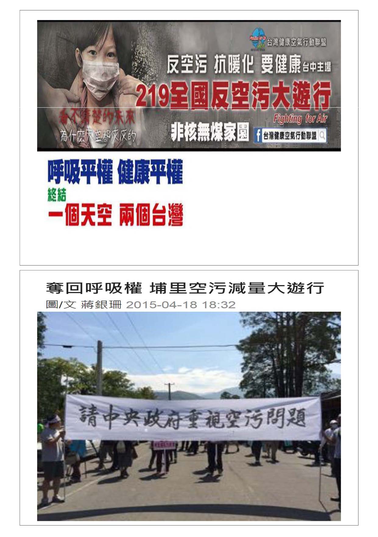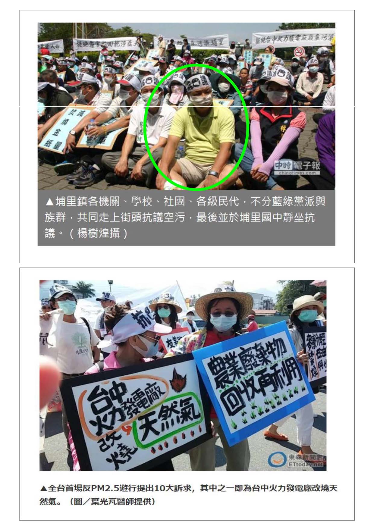 這張簡報上的照片是由國民黨委員帶頭的抗議活動,所以這個問題不分藍綠,當時國民黨也出面和台電抗爭,另外這張圖片上的人是民進黨立委李文忠。我們的第一個訴求就是針對台中火力發電廠,當時中央是由國民黨執政,大家希望台中火力發電廠的污染物不要飄到埔里。