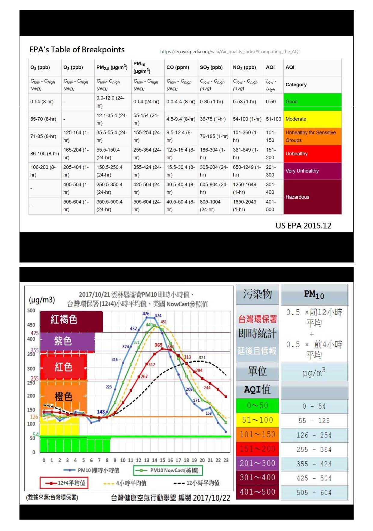 我要提出幾個重點,現行法第十四條規定「必要時」要發布空氣品質惡化的資訊。這是攸關國民健康的事情,尤其是PM2.5,政府怎麼可以等到「必要時」呢?只要空氣品質惡化,你們就應該發布空氣品質惡化的資訊。再者,目前有一個很嚴重的狀況是環保署的AQI指標,它的PM2.5、PM10、臭氧是用12小時跟8小時的移動平均值來顯示AQI的顏色,等於這個顏色代表的是過去的歷史空氣。對民眾來講,我要的是什麼?我現在出門,我要知道外面的空氣好不好,我希望得到的是最接近當下的資訊,而不是告訴我過去半天PM2.5平均下來是多少。第一個,那個資訊不即時,會有lag的問題;第二個,它會拉低平均,狀況會變得不嚴重。這種作法會違反這次空污法修法的目的,事實上,空污法修法要以保障國民健康為優先。如果這個部分相對的沒有調整的話,國民看到的環保署空品網站資訊的顏色是過去式、是lag的、是不嚴重的,這樣對國民的防護完全沒有幫助。現在中小學有空污旗,要不要上體育課,接下來秋冬季要辦校慶、運動會、園遊會,我是不是可以照常舉行,還是應該暫停、延後、改到室內,都是根據環保署的網站。如果環保署網站提供的資訊是被美化過、修飾過的顏色,我們怎麼能夠保護自己的孩子跟國人?