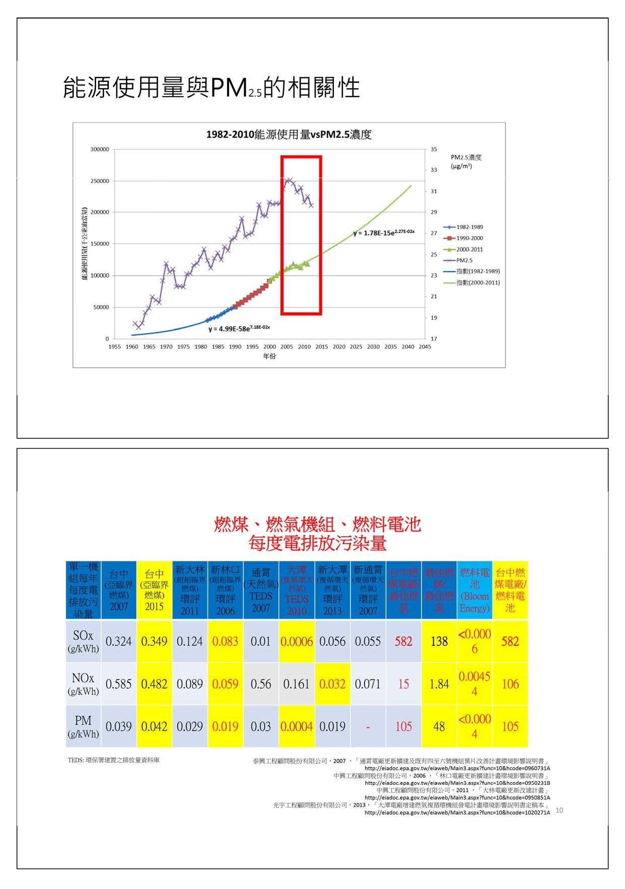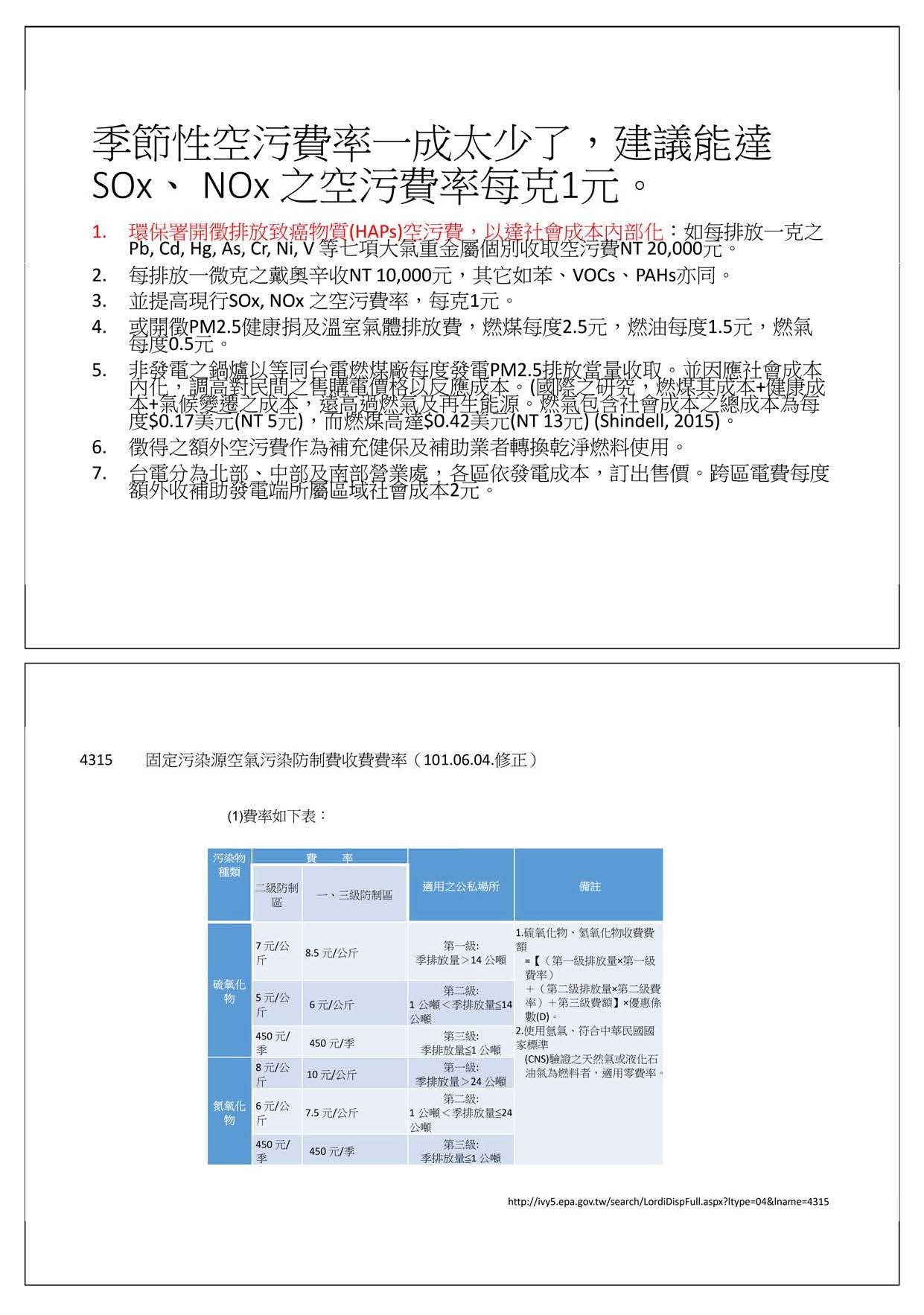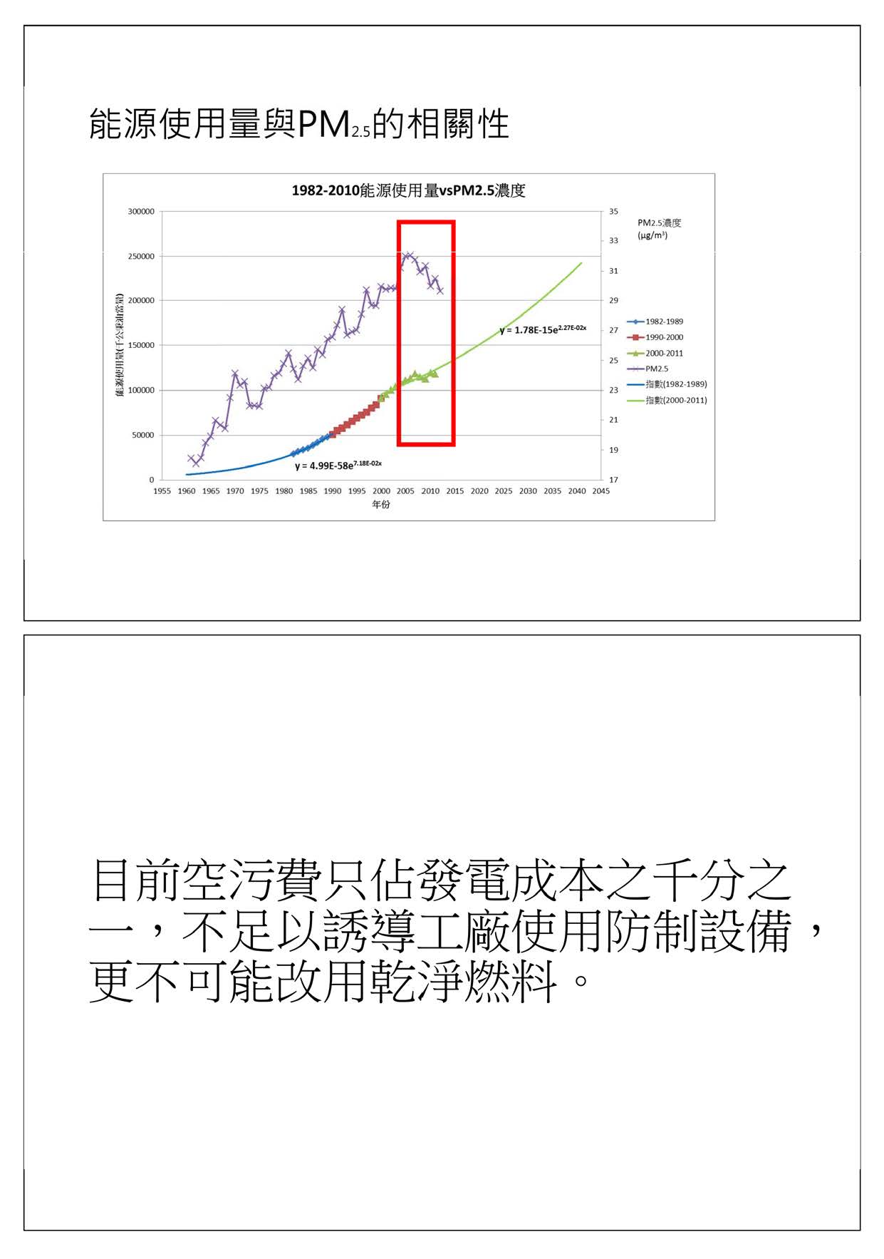 按照我的計算來看,例如燃燒天然氣的污染量,相對台中電廠來說,硫氧化物低了582倍,氮氧化物低了15倍,PM2.5也低了105倍。按照過去PM2.5 的成長量,我們發現它和能源的使用基本上是呈現正相關,過去大概增加15左右,所以當我們變成無煤發電,而且天然氣也裝脫硝設備的時候,我們的污染量就會從增加15,除回來變成11,也就是可以回到1960年代的水準,所以我覺得,當我們調升空污費的時候,就可以做到這些事情。