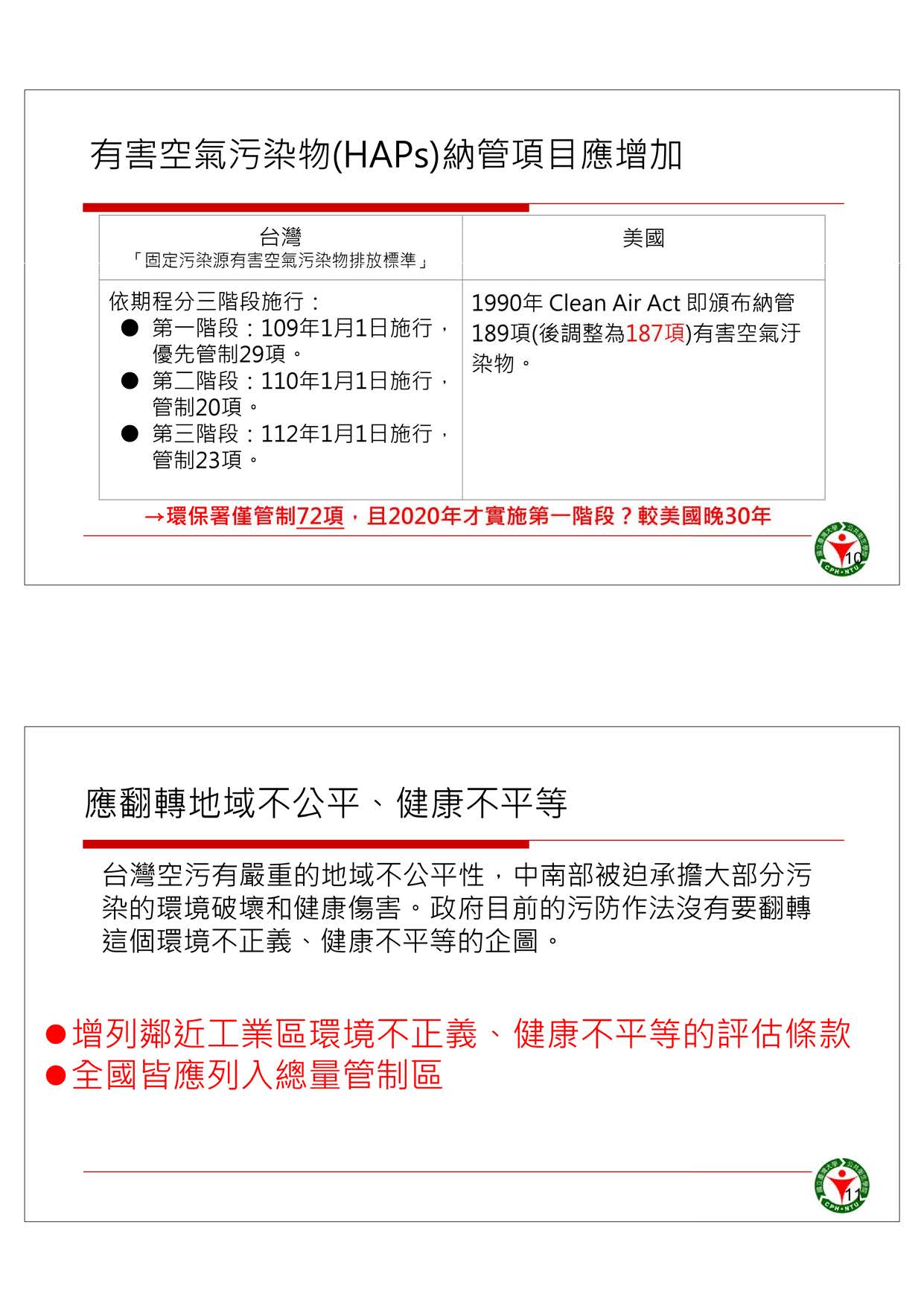 剛才蘇老師講到的空污總量管制,這個總量管制並不是突然從天上掉下來給我們的,而是經過諸多努力及三年多來的爭取才終於有所突破。我們知道第一期程就是加了一個蓋子,但是這個蓋子還不夠低,我們也不滿意,這對當時努力去推廣的人來說是要很忍耐的,因此我們現在只能期待第二期程可以儘快實施,好讓空污可以大幅削減。不過,我們擔心的是,第二期程能削減多少並不是我們能夠決定的,依空污法規定,這還要會同經濟部。如果這次修法的會商不能通過,到時候說不定還是只減個5%,而且大廠可能還減不到,真的很讓人擔心,所以我們希望空污法可以在這一屆趕快審議。