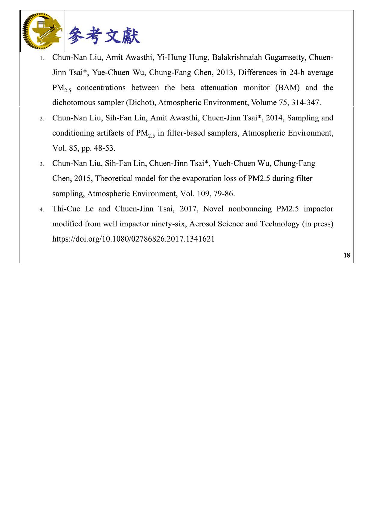 另外,配合環保署2017年開始在台北、台中、雲林、嘉義、高雄、花蓮對PM2.5每6日之詳細化學成分採樣,可以粗估PM2.5來源,本土的排放源仍為最重要的來源,而非境外移入。來源大致可以區分為交通、工業、燃煤、重油、生質燃燒、鋁冶煉、鋼鐵冶煉、再懸浮塵土或道路揚塵及海鹽等,其中最重要的兩項是交通與工業,然而這項研究有所侷限,自然或人為排放之PM2.5前驅污染物(如氮氧化物及硫氧化物),經光化學反應後,常形成二次氣膠,且二次氣膠所含的比例都不低,所以有一些我們到後來都還搞不清楚其來自什麼地方,這部分占有一定的比例,此點是在科學上必須突破的。
