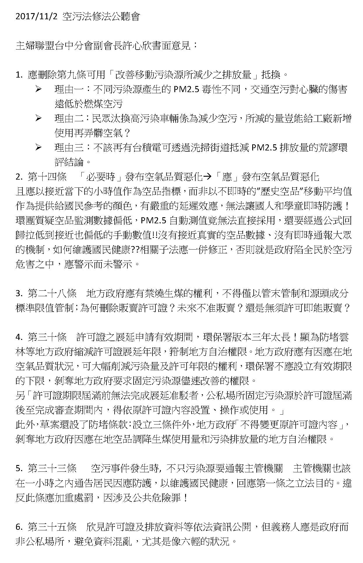 許心欣副會長:主席、各位委員。我是主婦聯盟台中分會副會長許心欣,我想針對空污法修法提出幾點意見。其實之前開公聽會的時候我們已經提過,可是很可惜的是,環保署做會議紀錄的時候漏了非常多內容。當時在北、中、南有辦三場公聽會,在這三場公聽會裡有非常多環保團體表達意見,相關的內容卻沒有被登載在會議紀錄,這件事情是非常誇張的。我剛剛查一下環保署的網站,一直到前幾天的10月26日才放上更新版的會議紀錄,我們的意見才被放在裡面。在這當中包括我們台中的夥伴江慶洲參加了北、中、南三場會議,表達很多意見,也交了書面意見,但是環保署好像當做我們的出席、發言都不存在,在會議紀錄上也沒看到,這是很誇張的事情。我不曉得這算不算是公文書的問題,我覺得要追究一下。